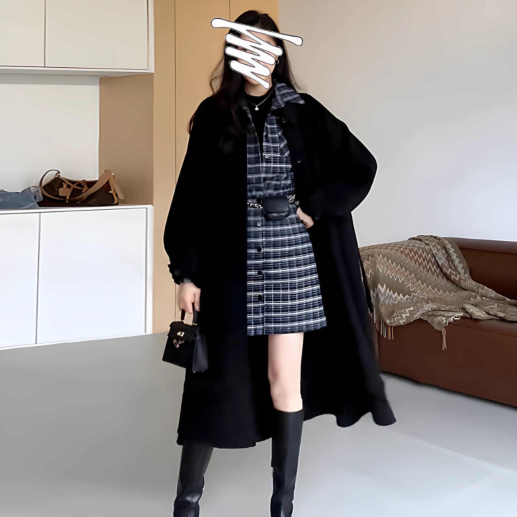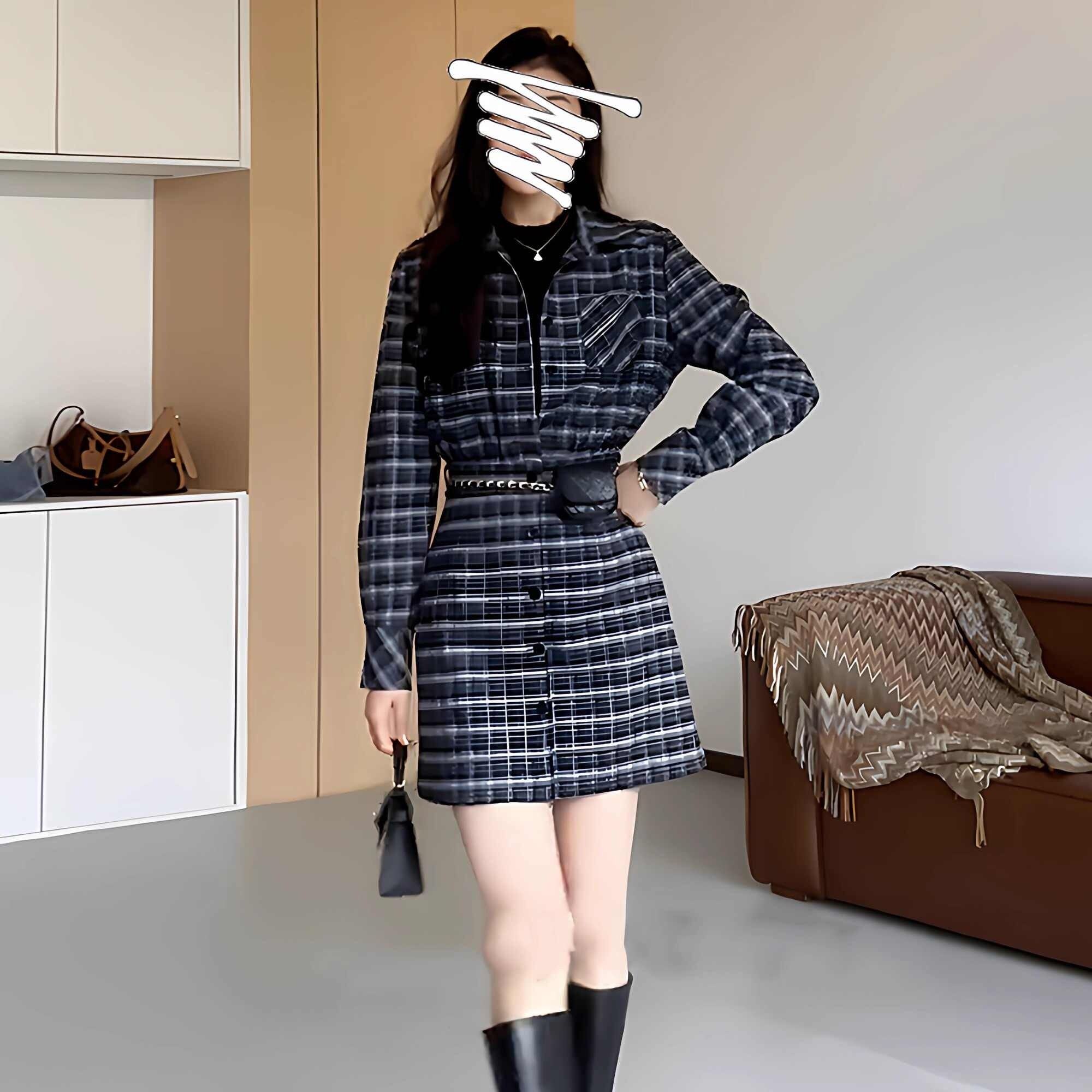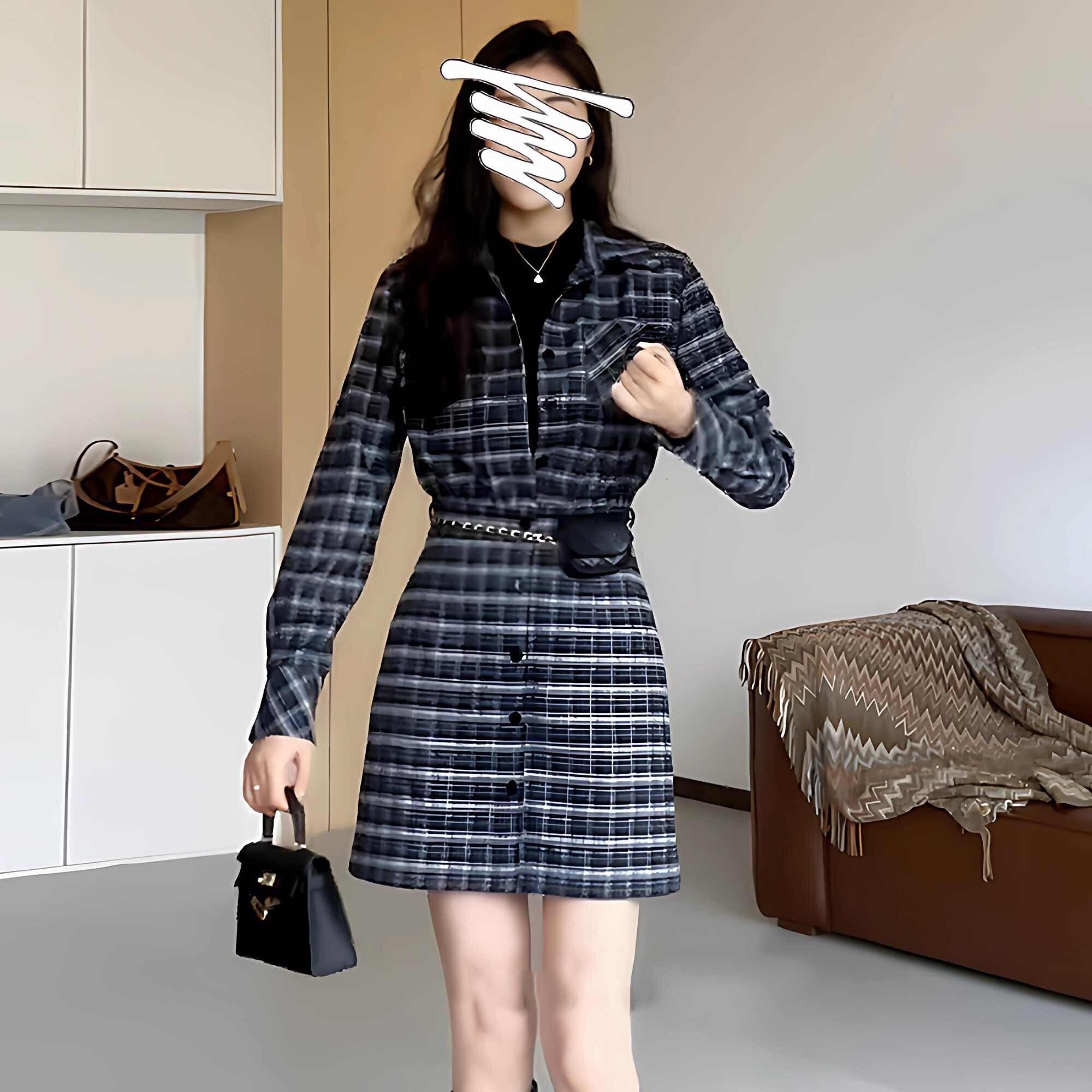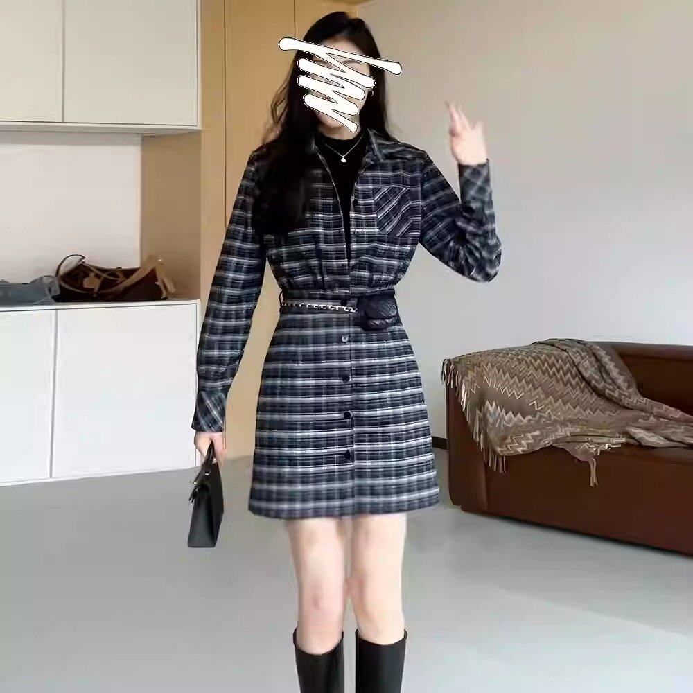 大码休闲风时尚格纹拼接长袖连衣裙女胖mm冬季新款收腰显瘦短裙子