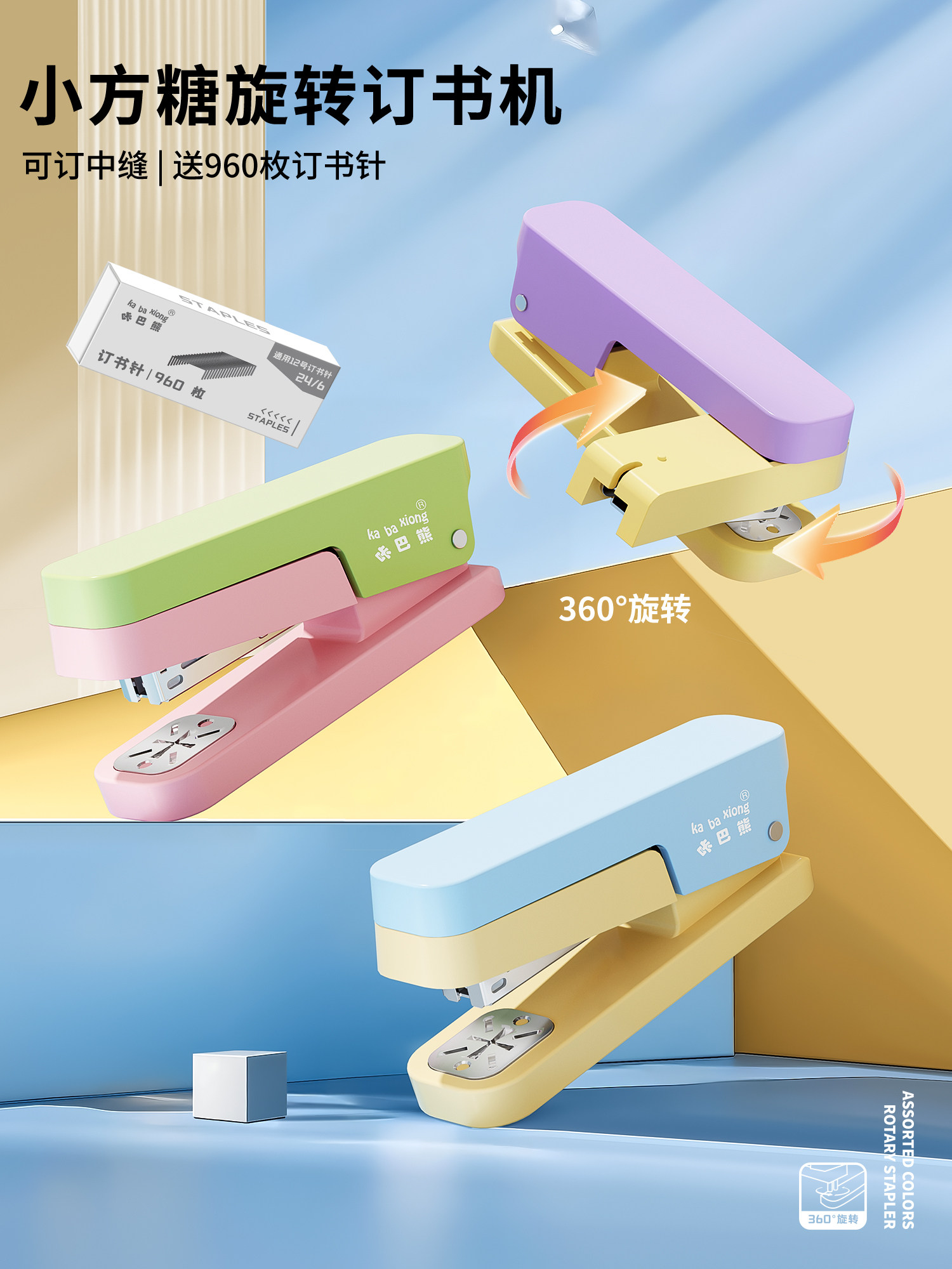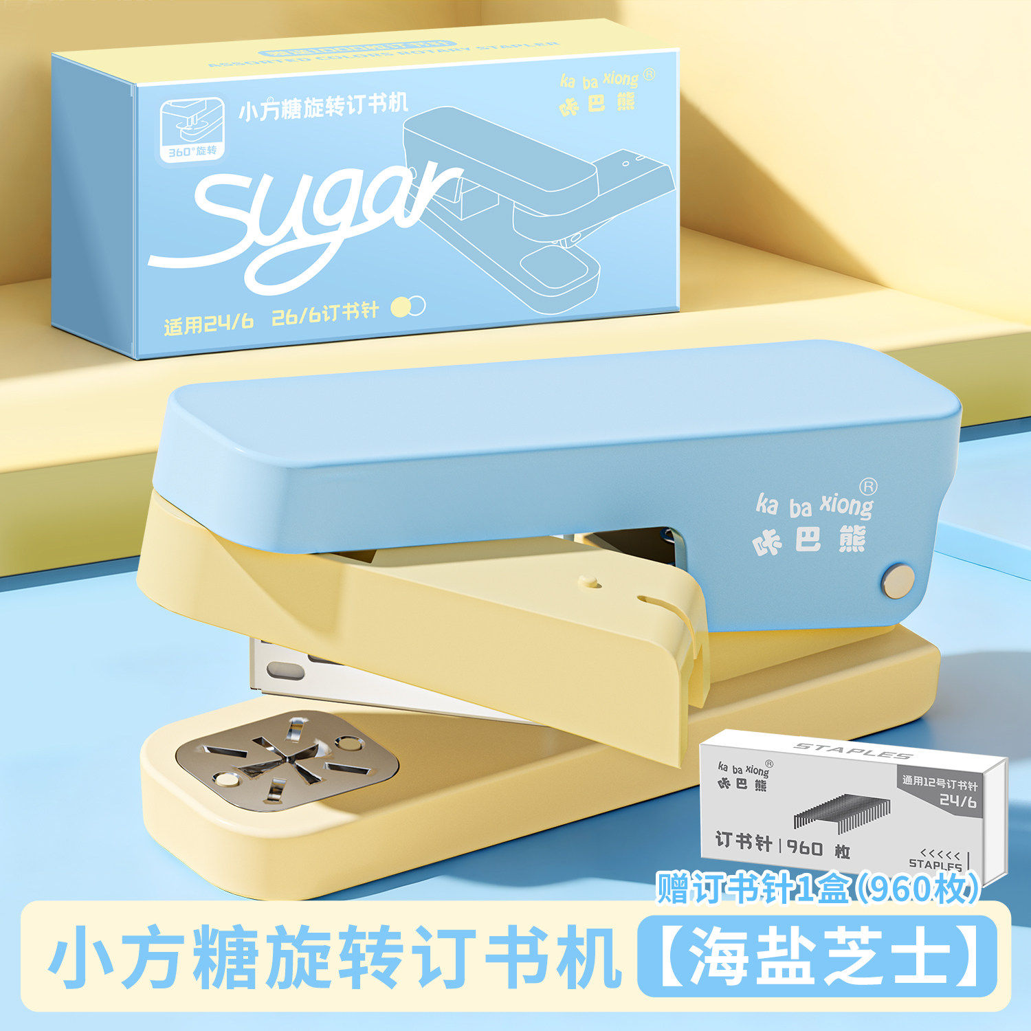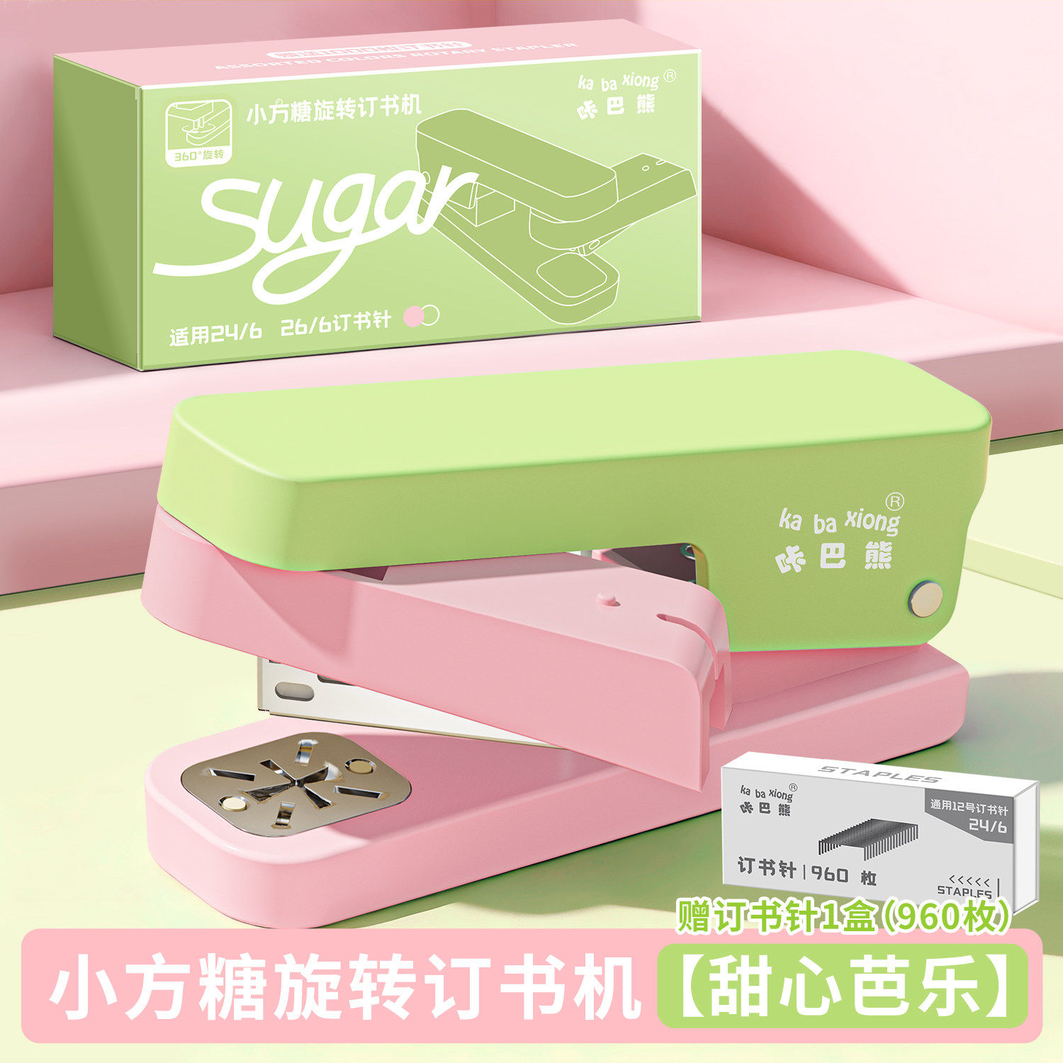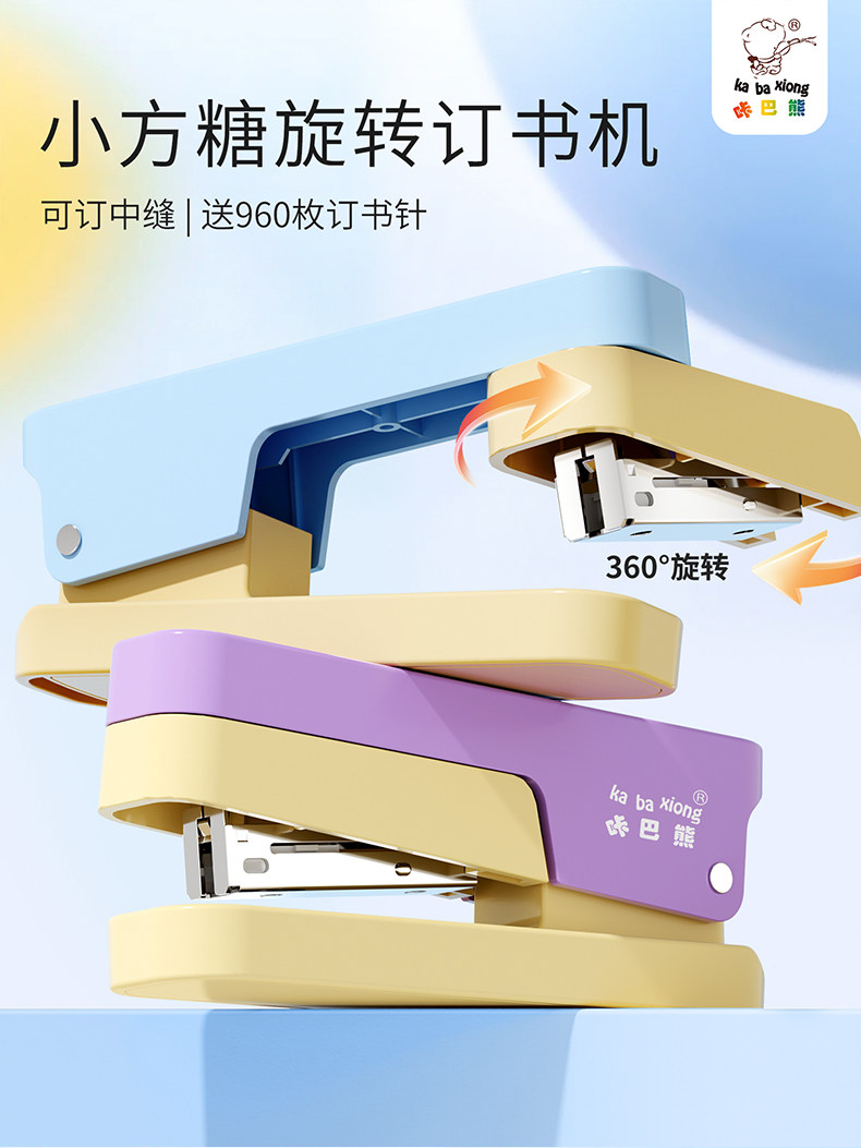 咔巴熊小方糖360°旋转订书机高颜值迷你便携式学生专用办公便携可订中缝送订书针小学生办公用品多功能文具