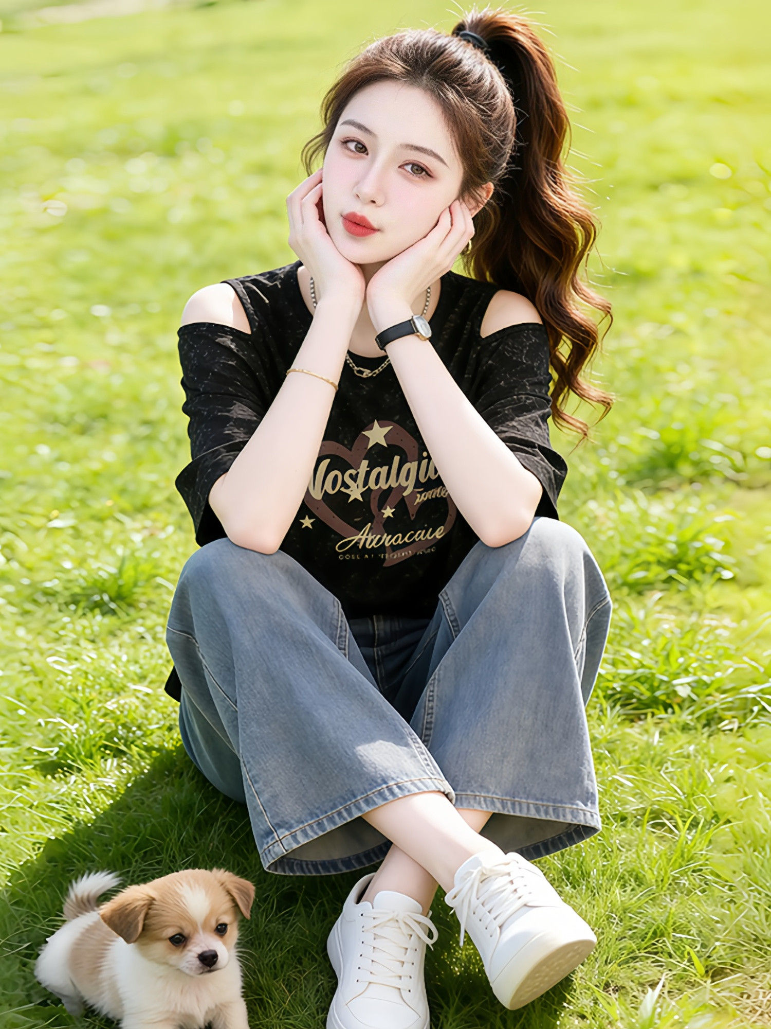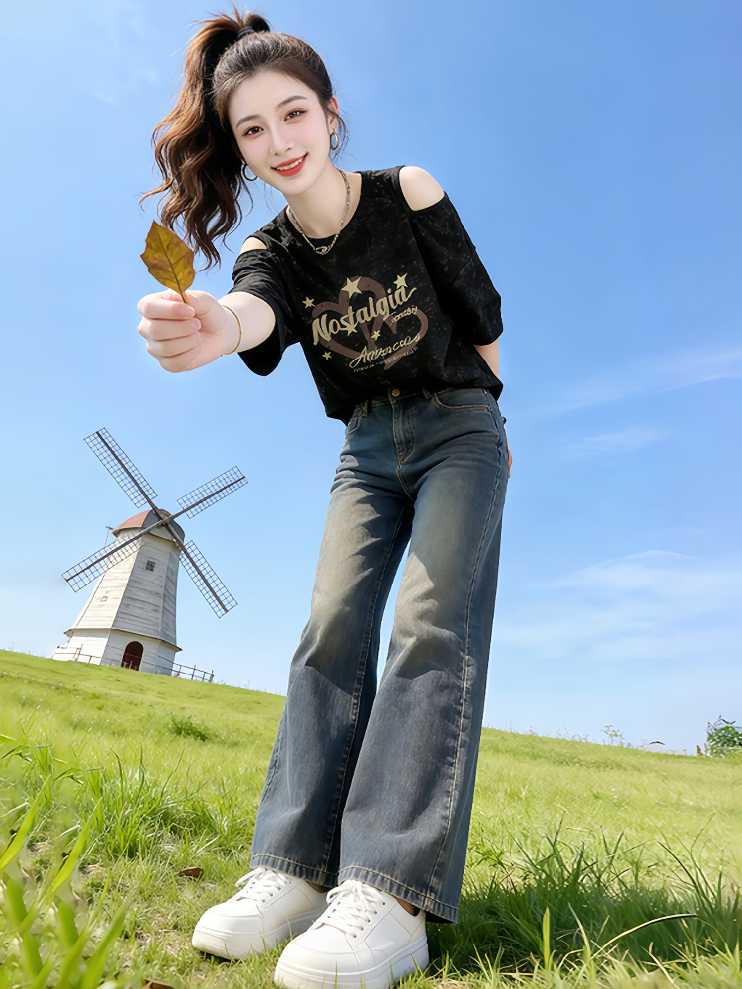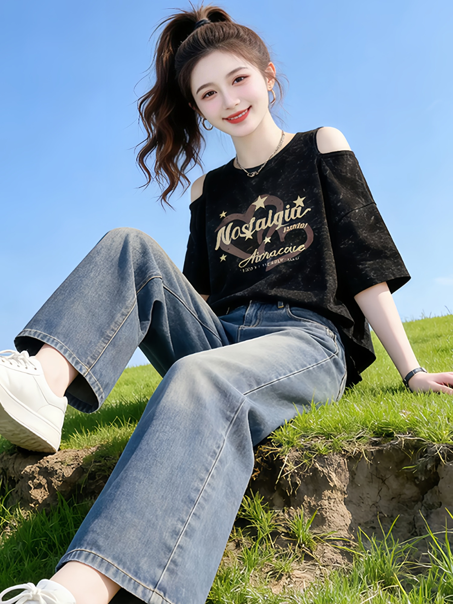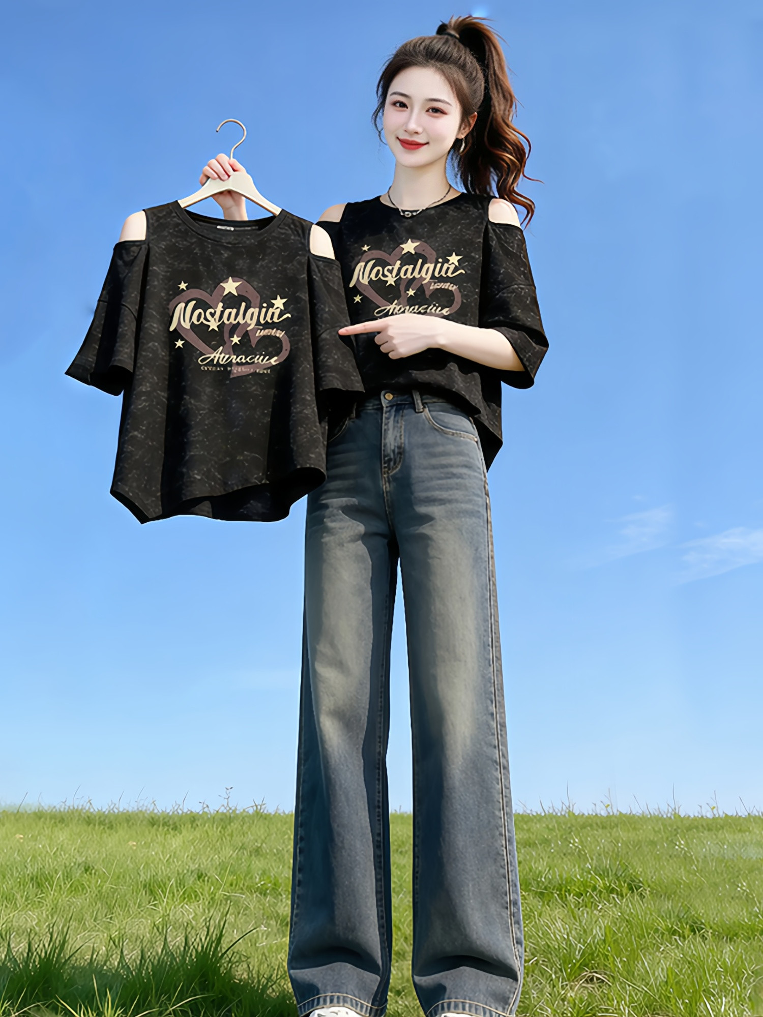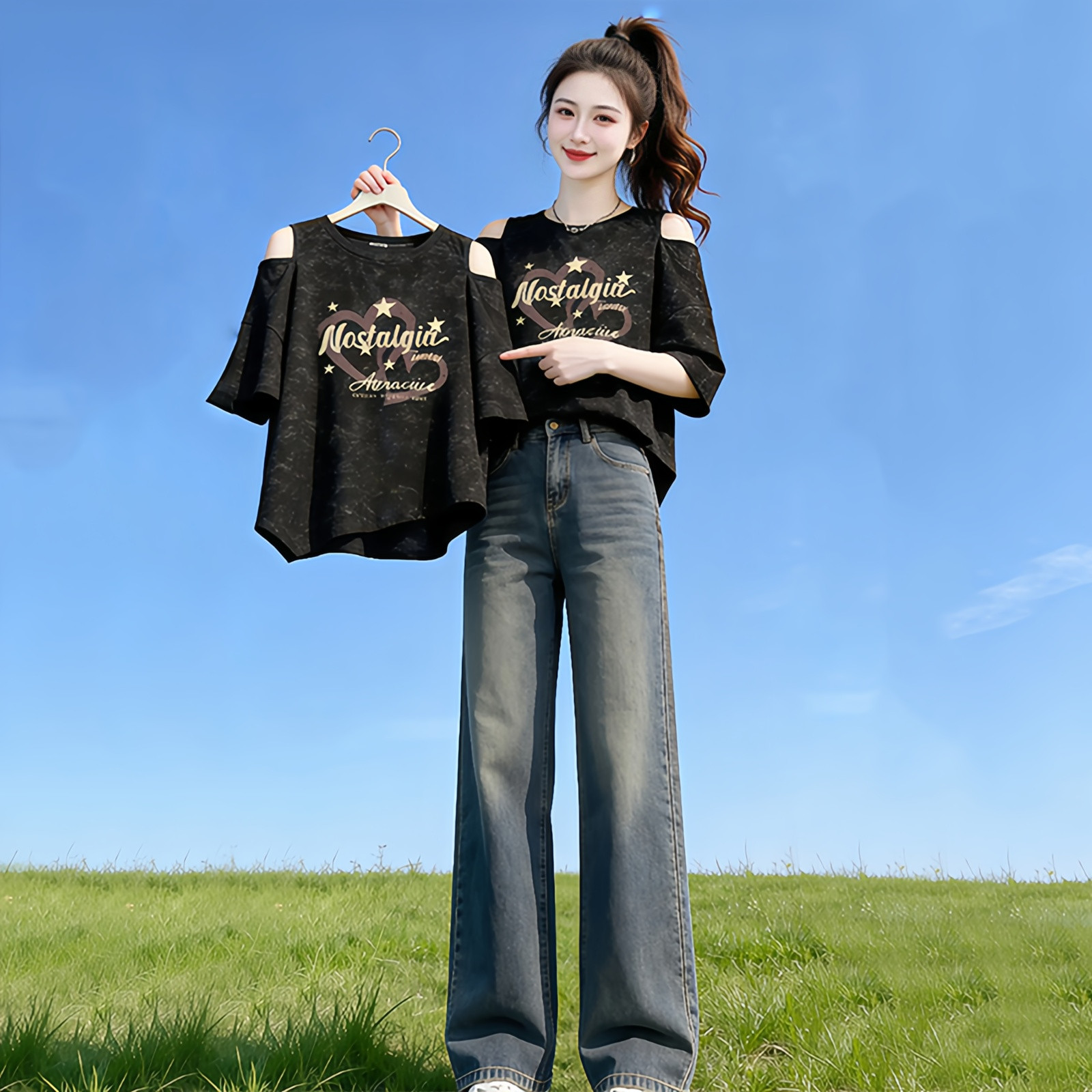 时尚设计感字母印花短款短袖t恤女2026夏季新款宽松显瘦露肩上衣
