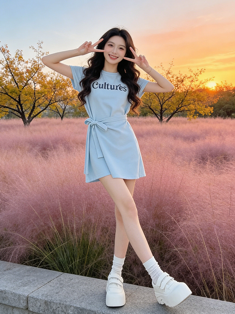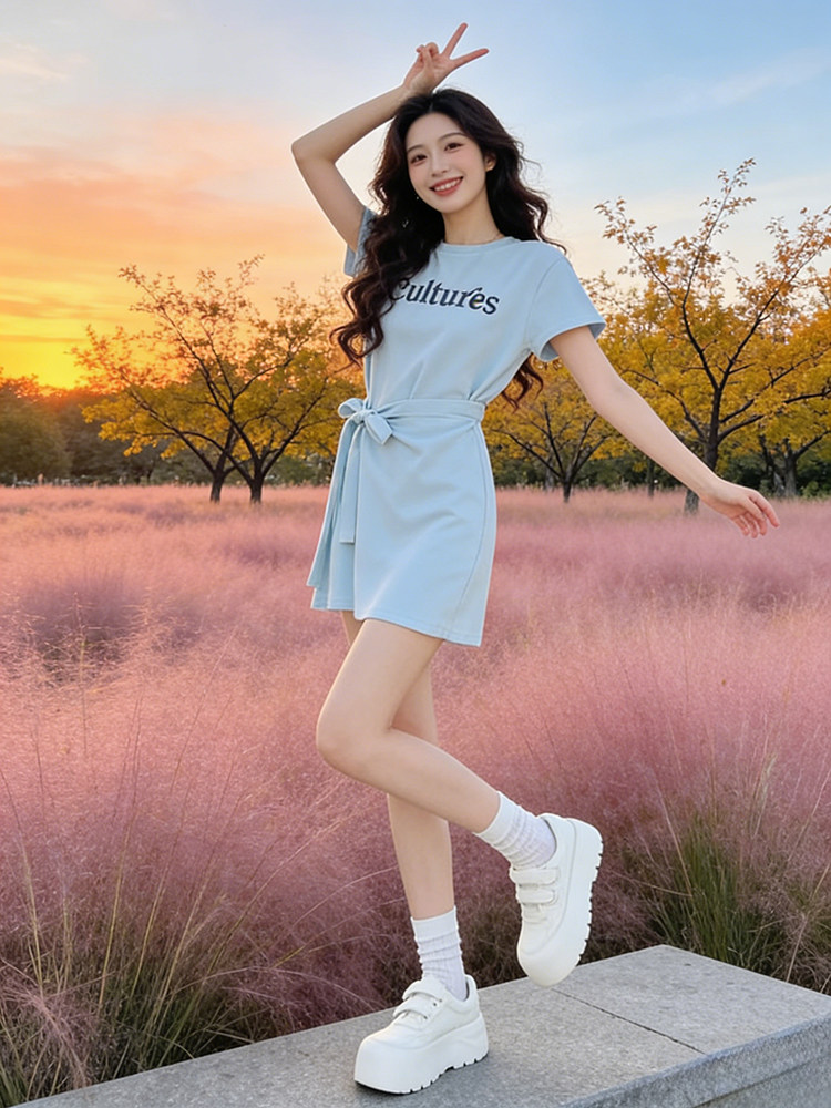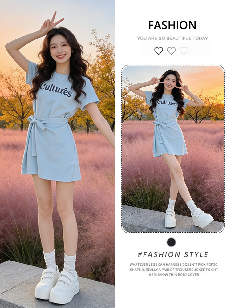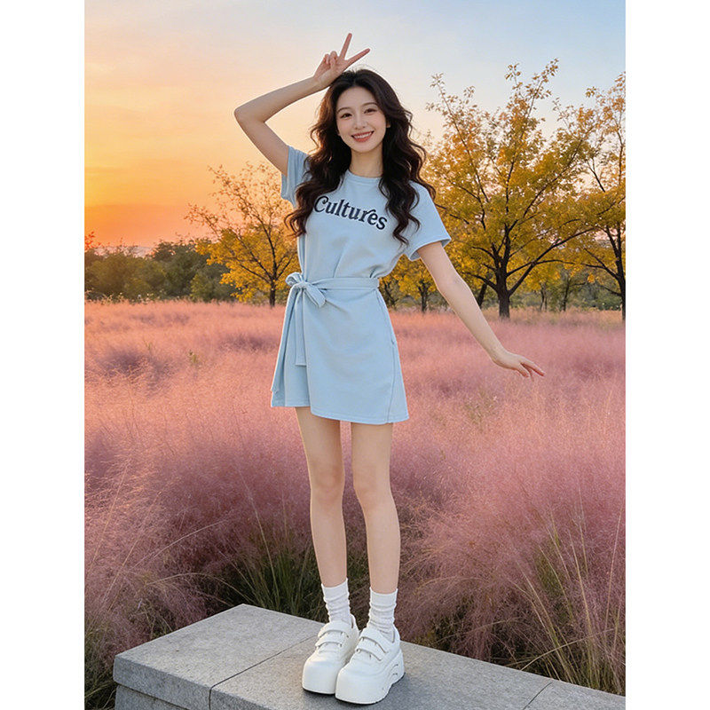 韩版时尚假两件收腰绑带连衣裙女装2026夏季新款字母印花短袖裙子