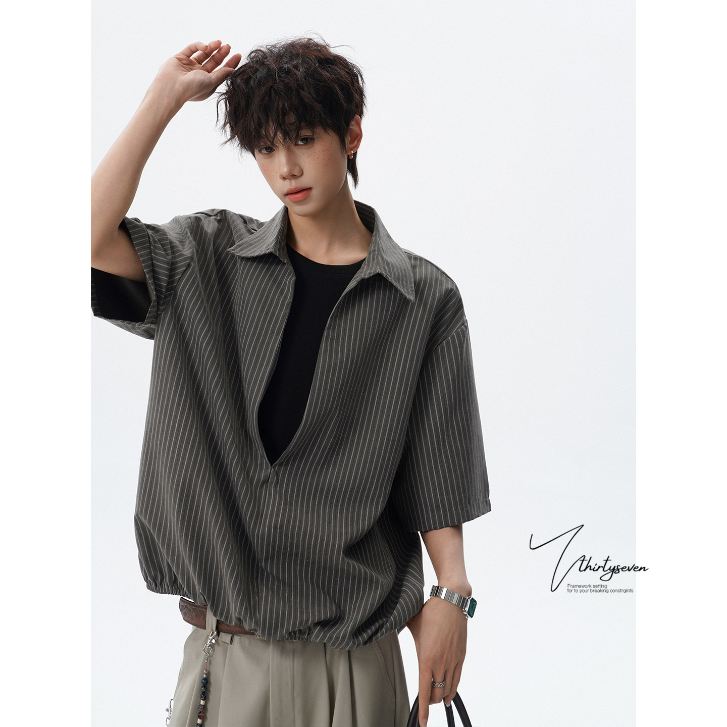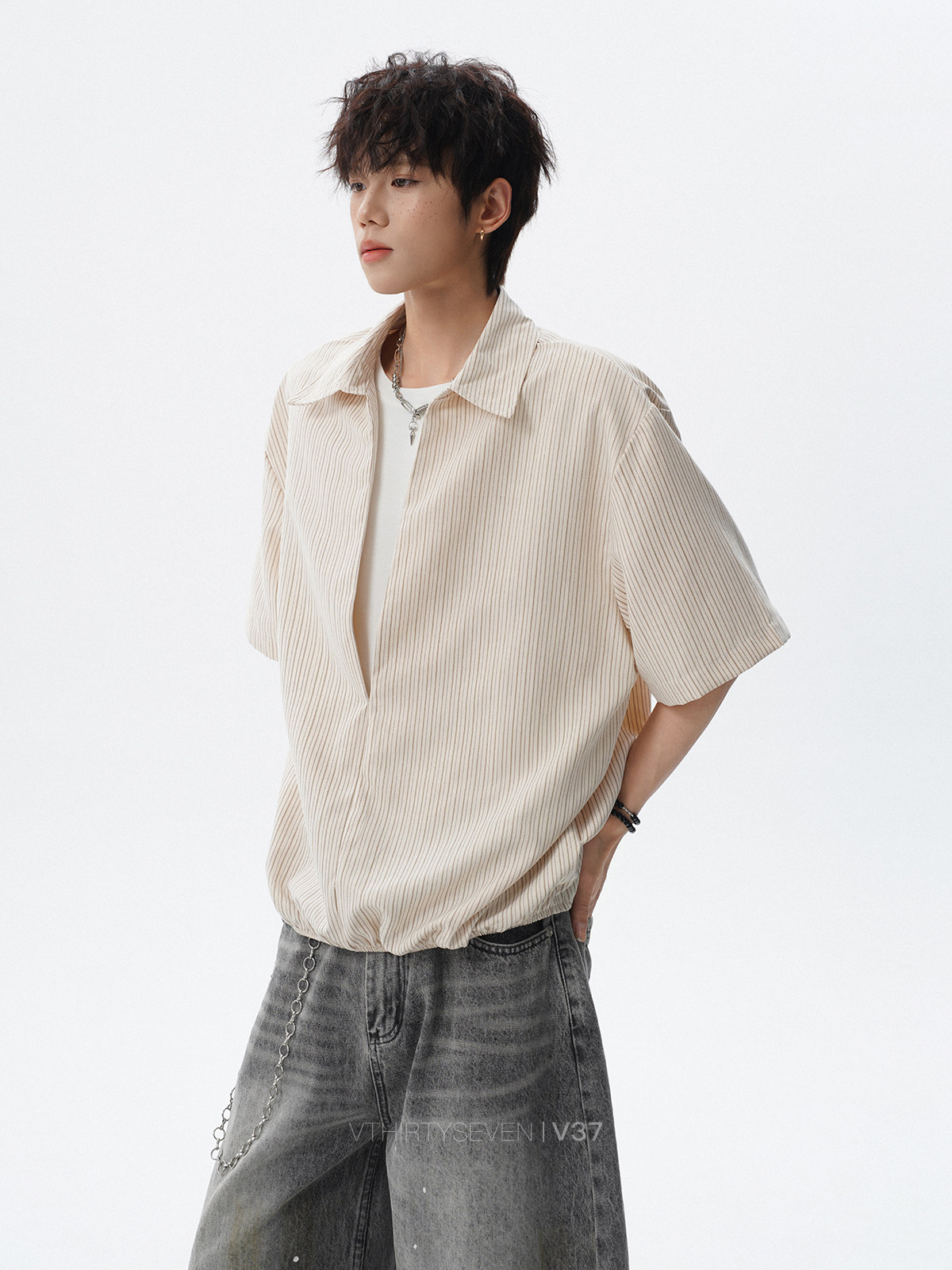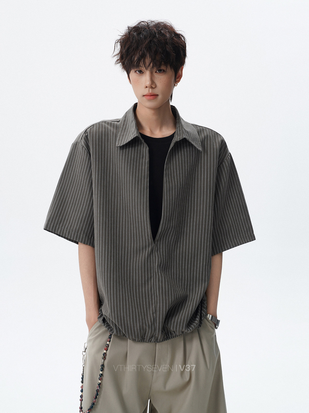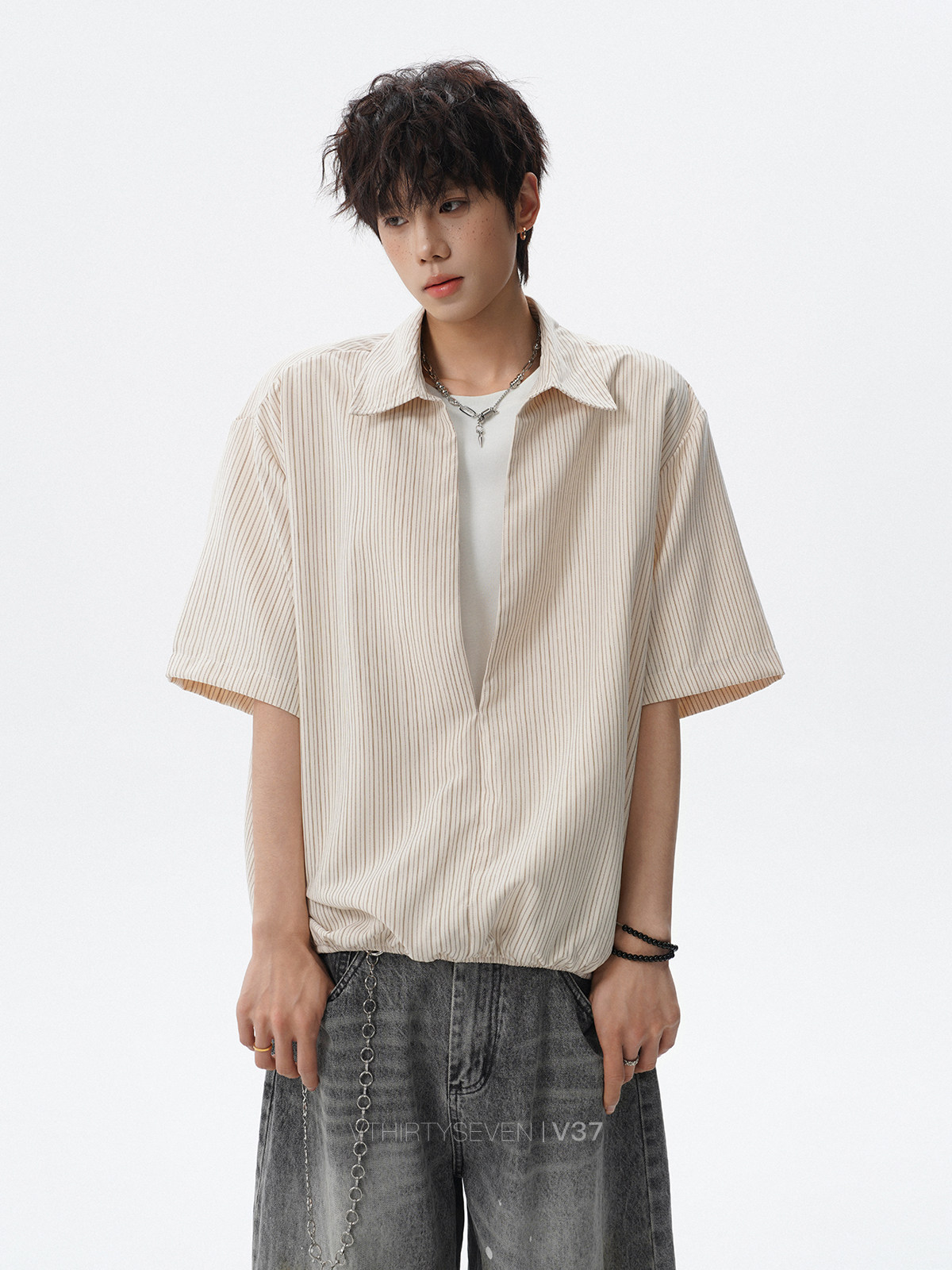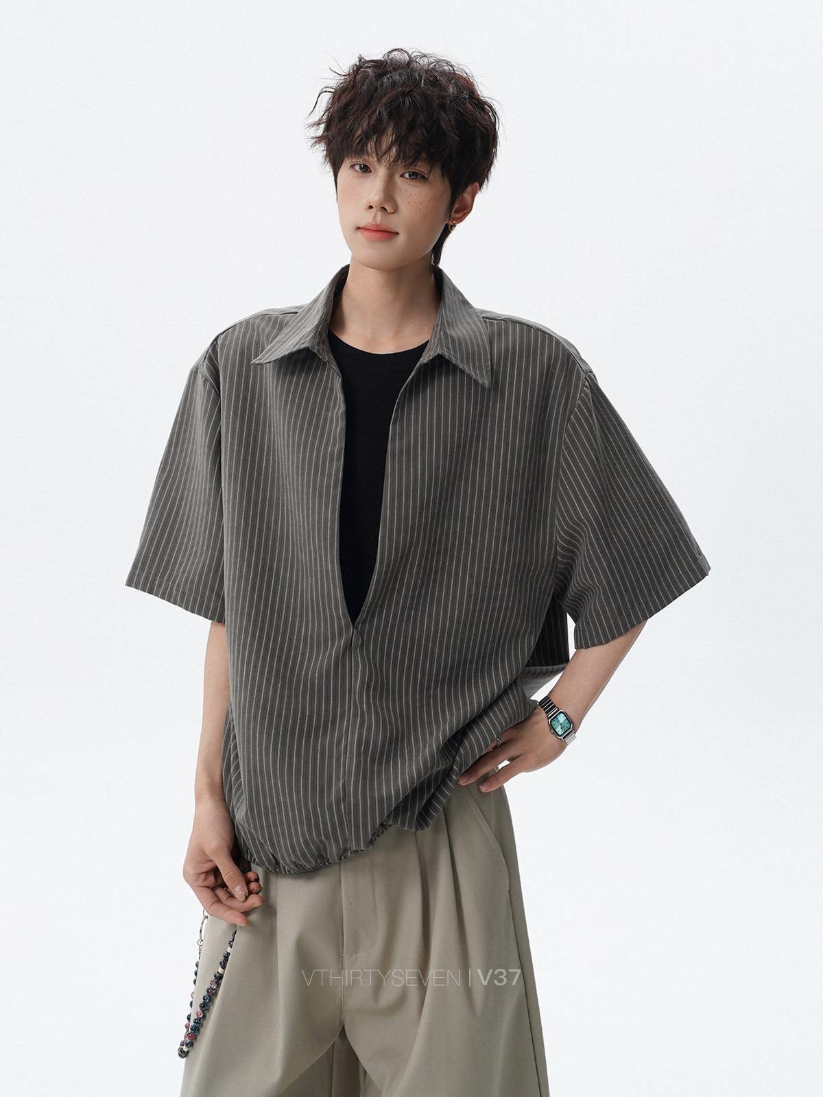 V37老钱风都市松弛感半开襟衬衫男夏季日系潮牌松紧下摆短袖衬衣