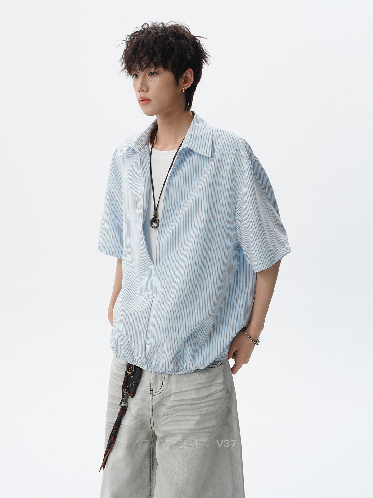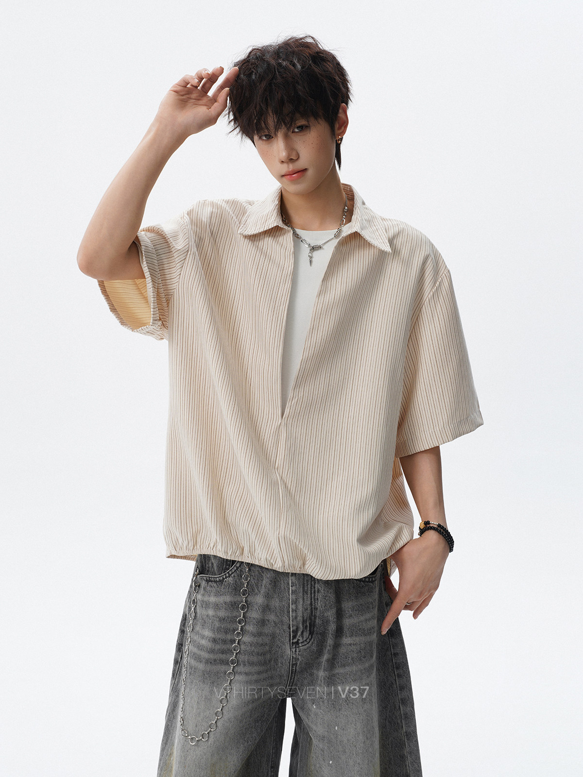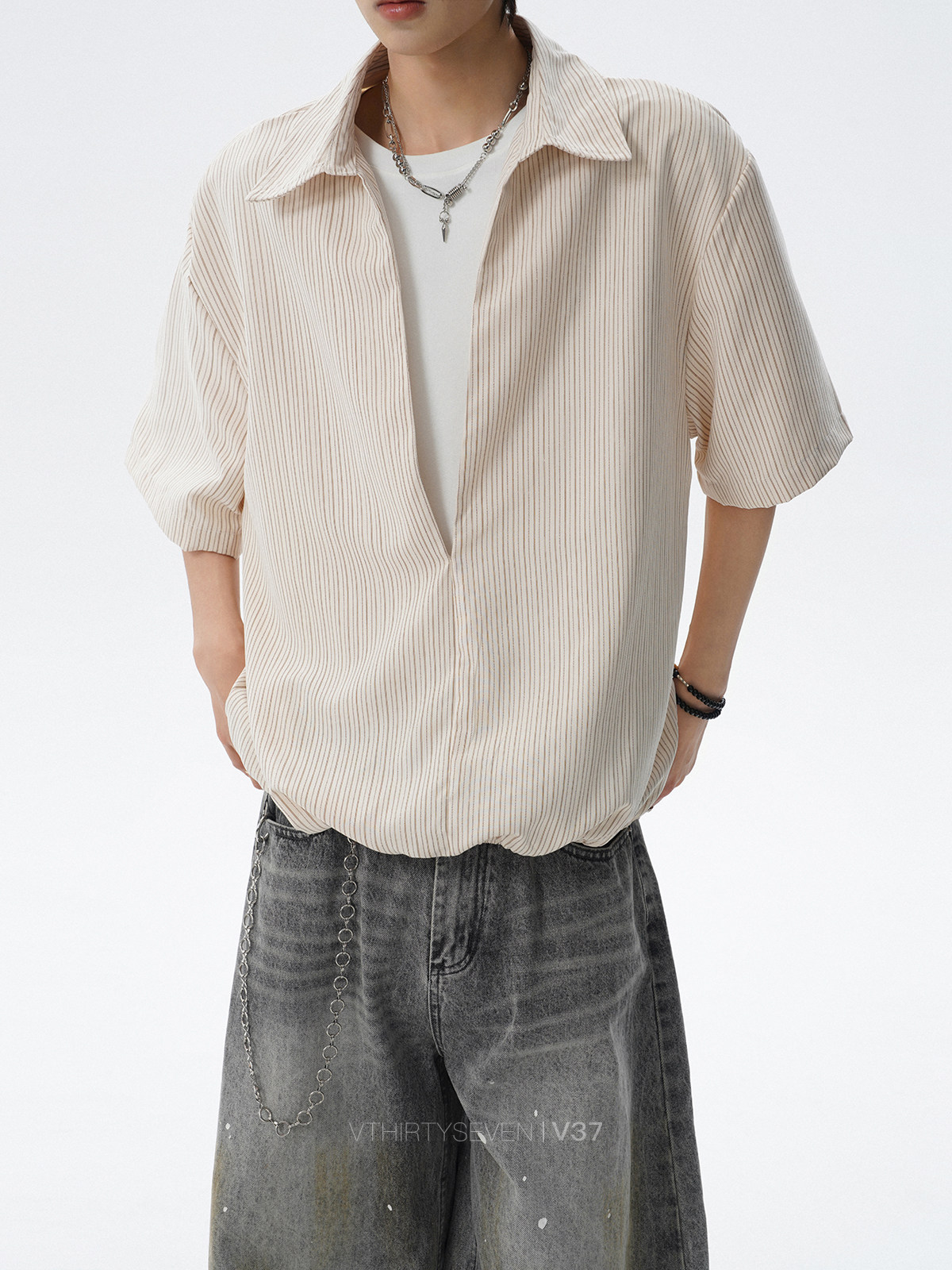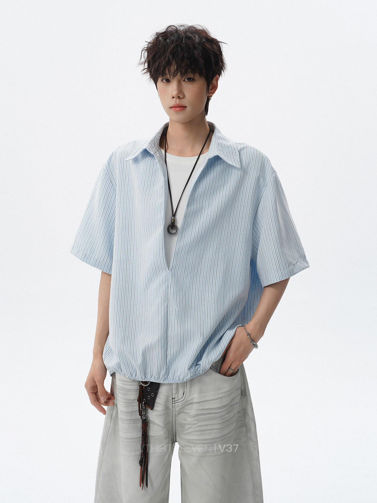 V37老钱风都市松弛感半开襟衬衫男夏季日系潮牌松紧下摆短袖衬衣