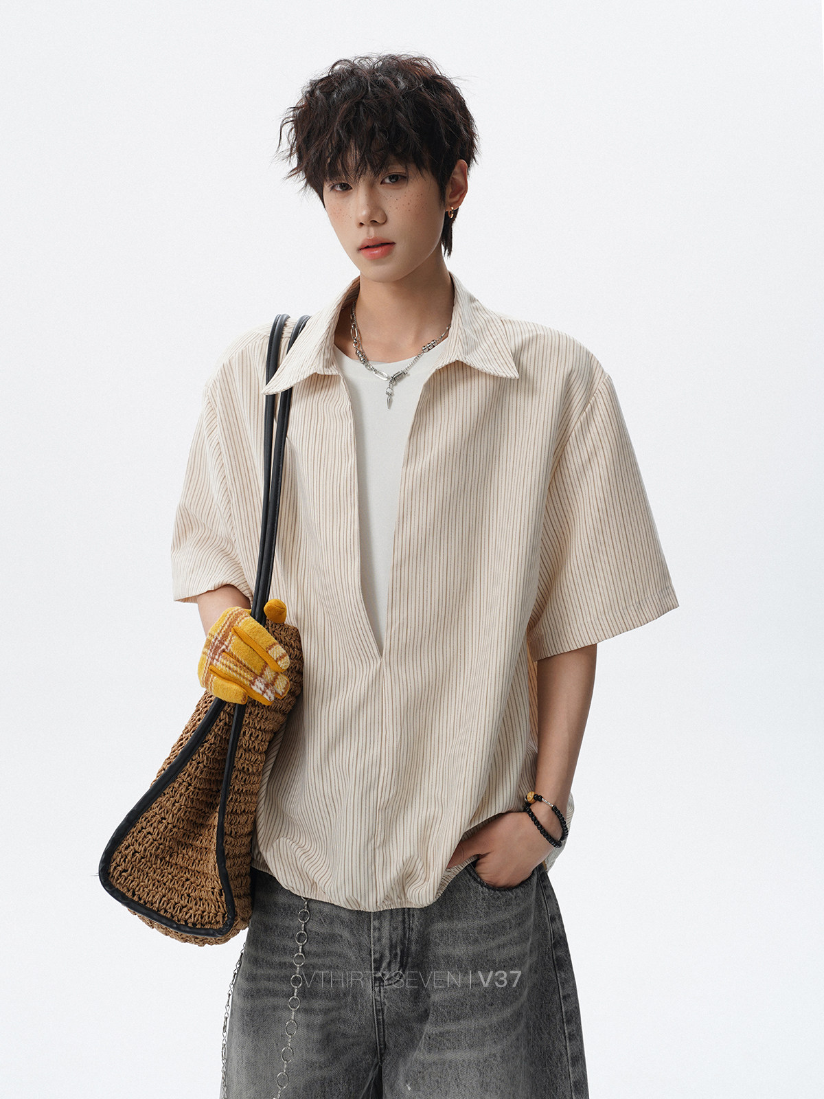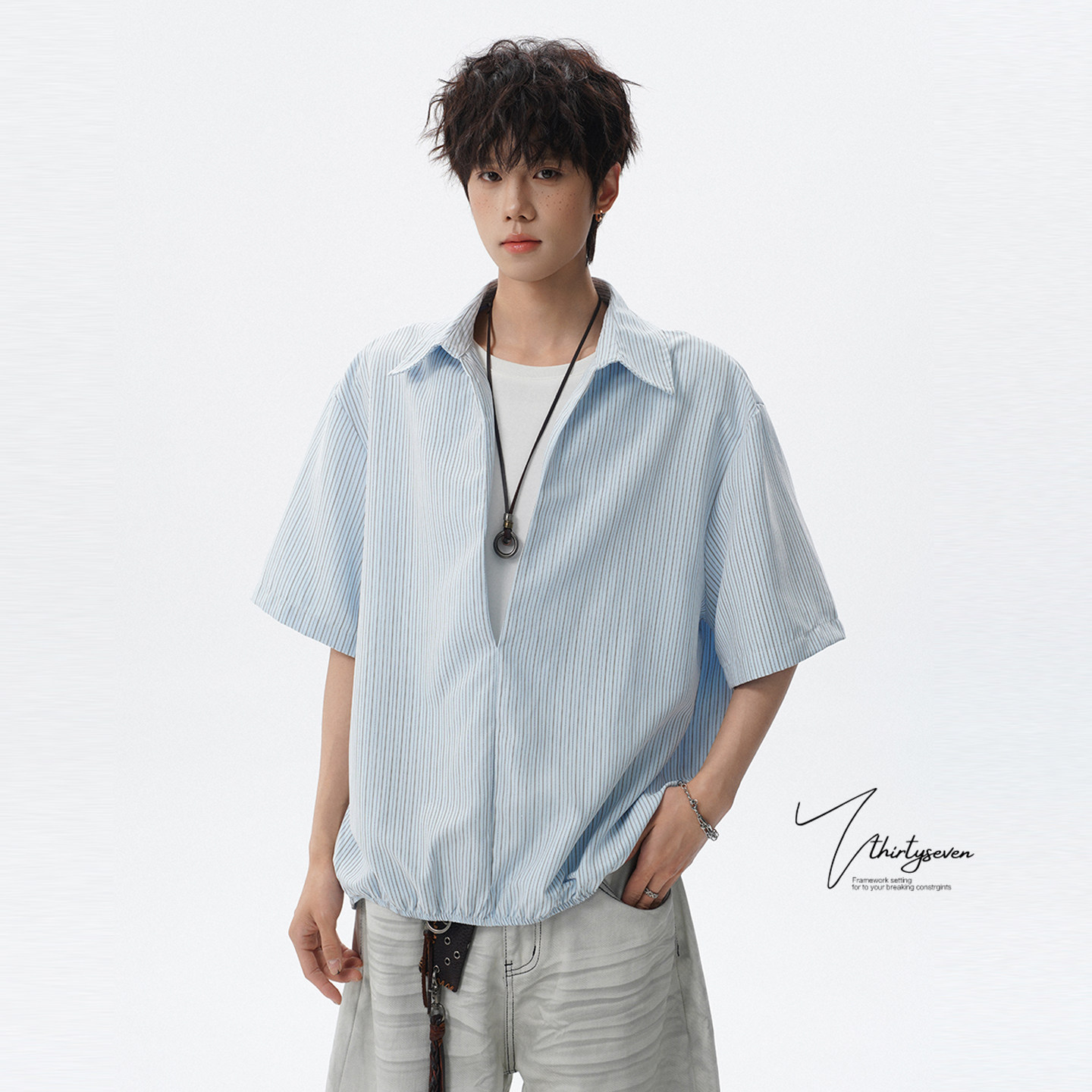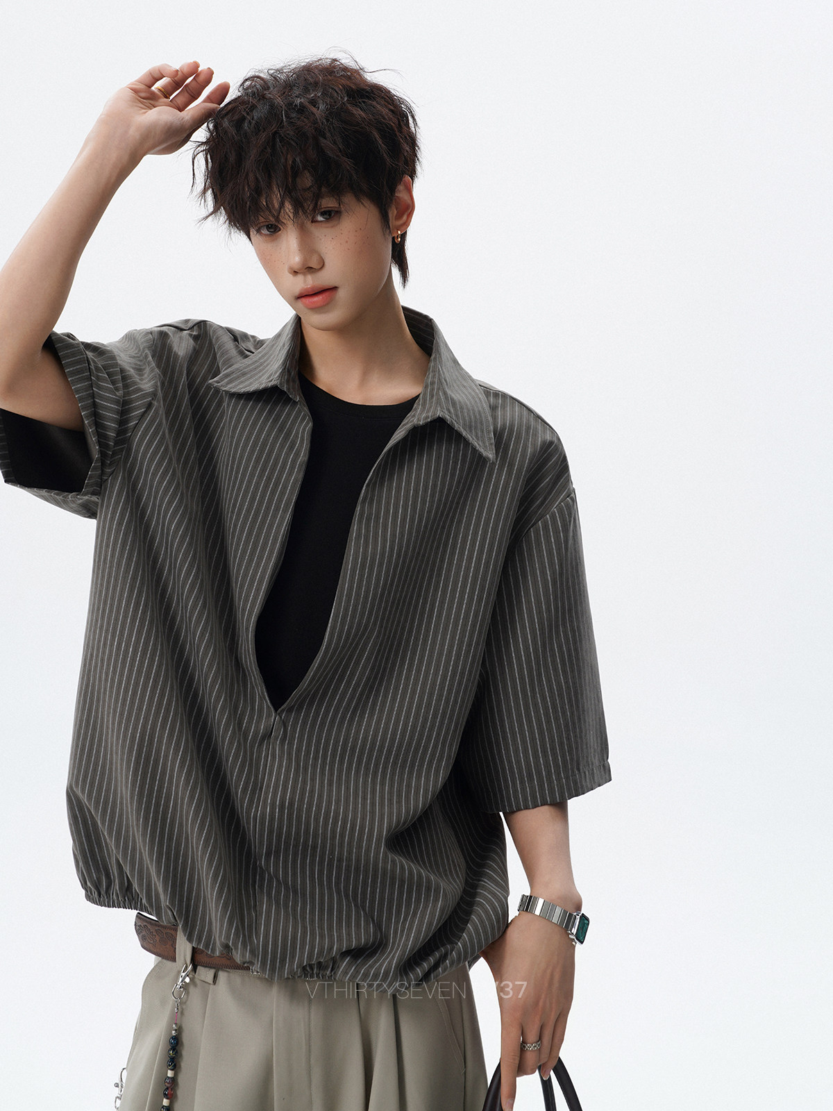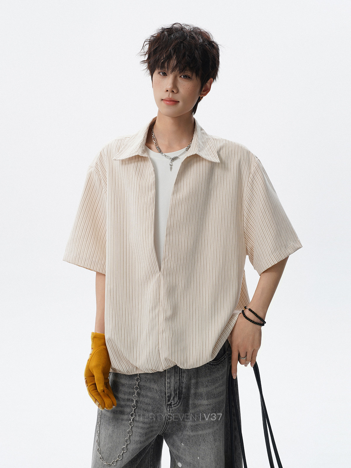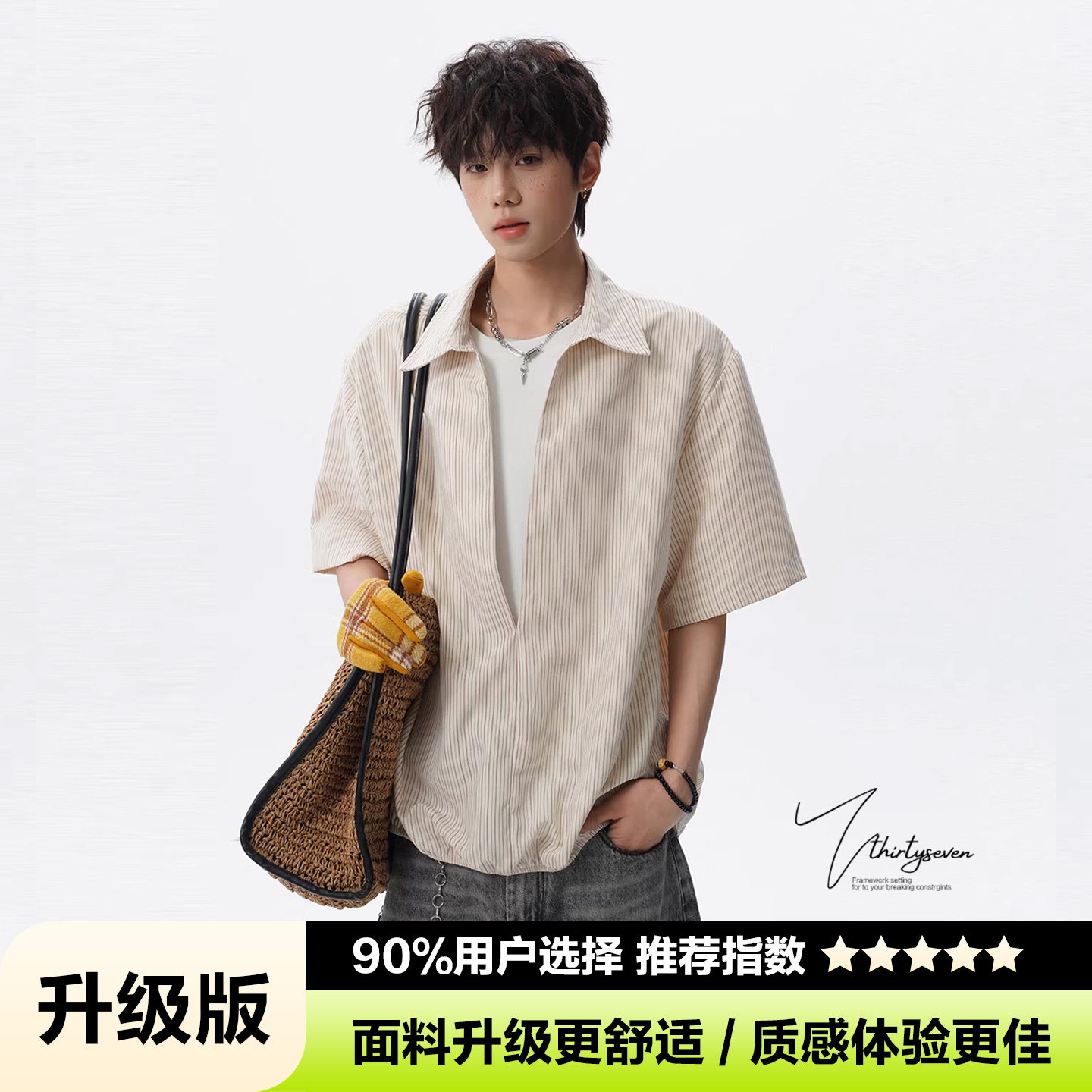 V37老钱风都市松弛感半开襟衬衫男夏季日系潮牌松紧下摆短袖衬衣