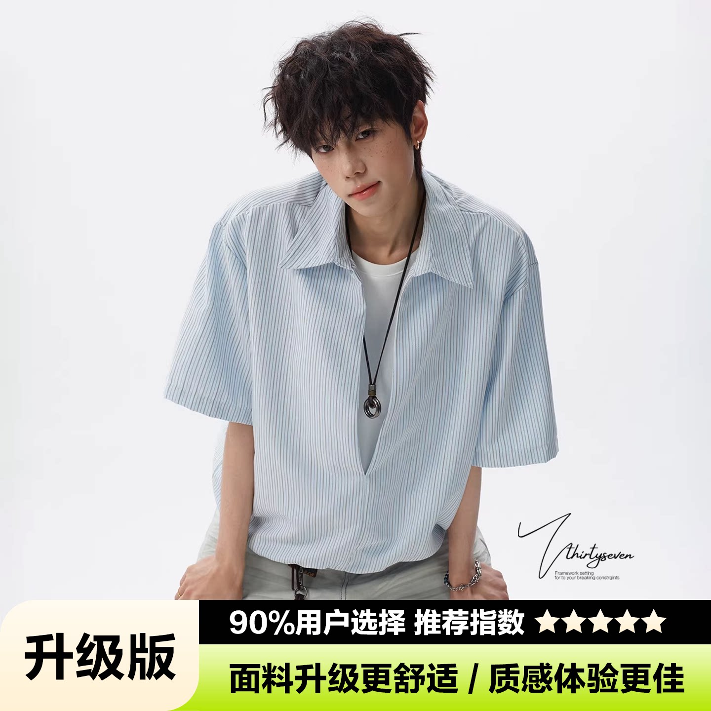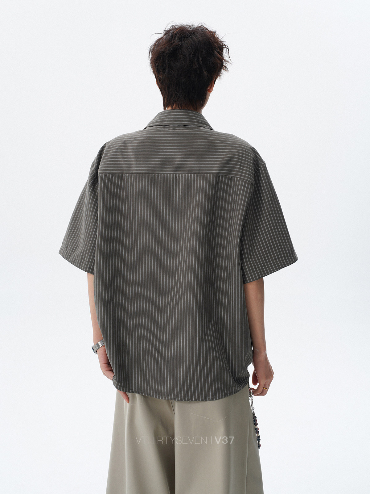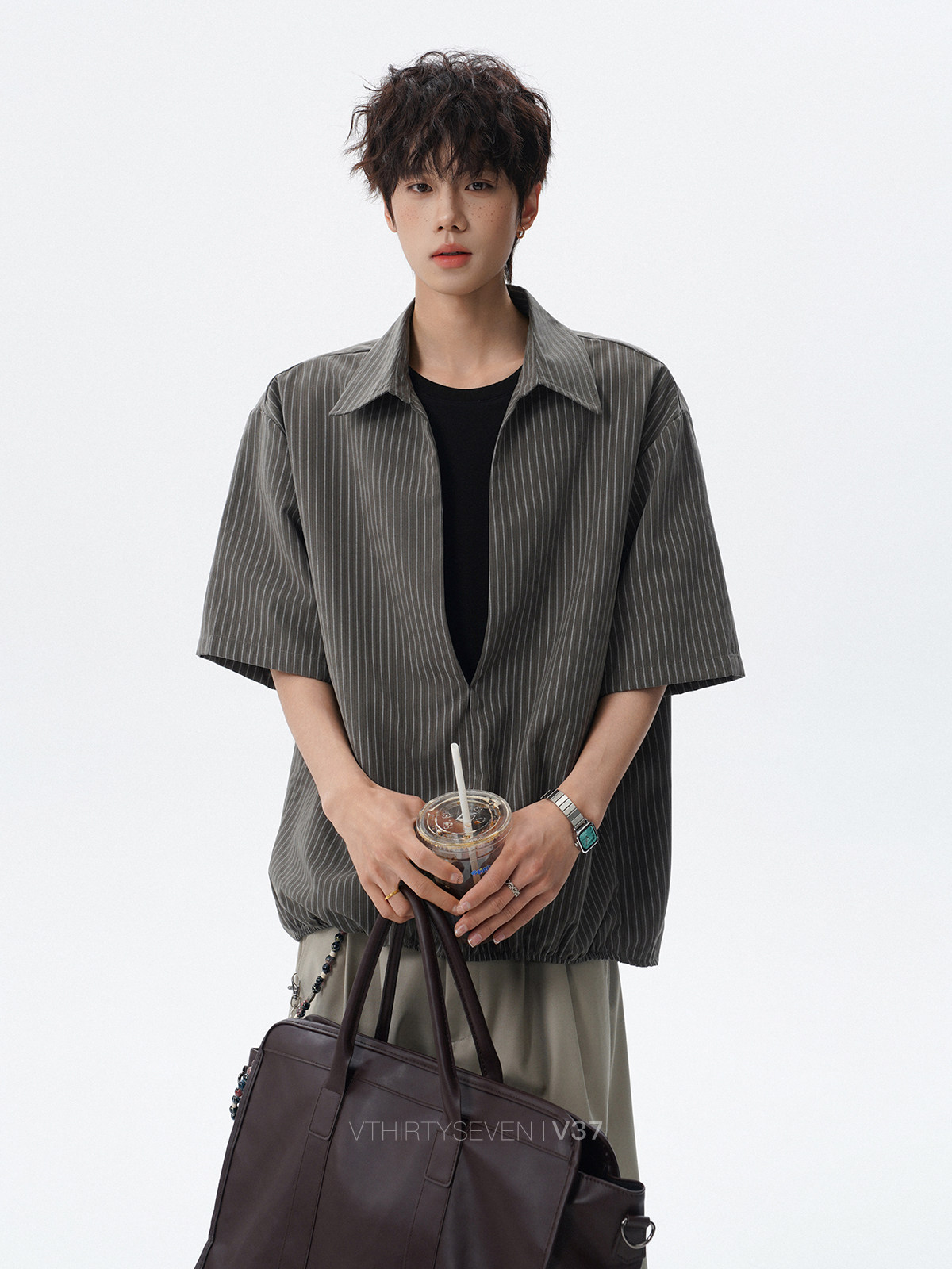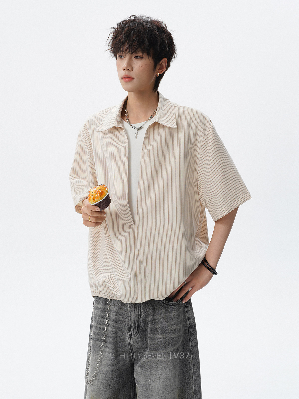 V37老钱风都市松弛感半开襟衬衫男夏季日系潮牌松紧下摆短袖衬衣