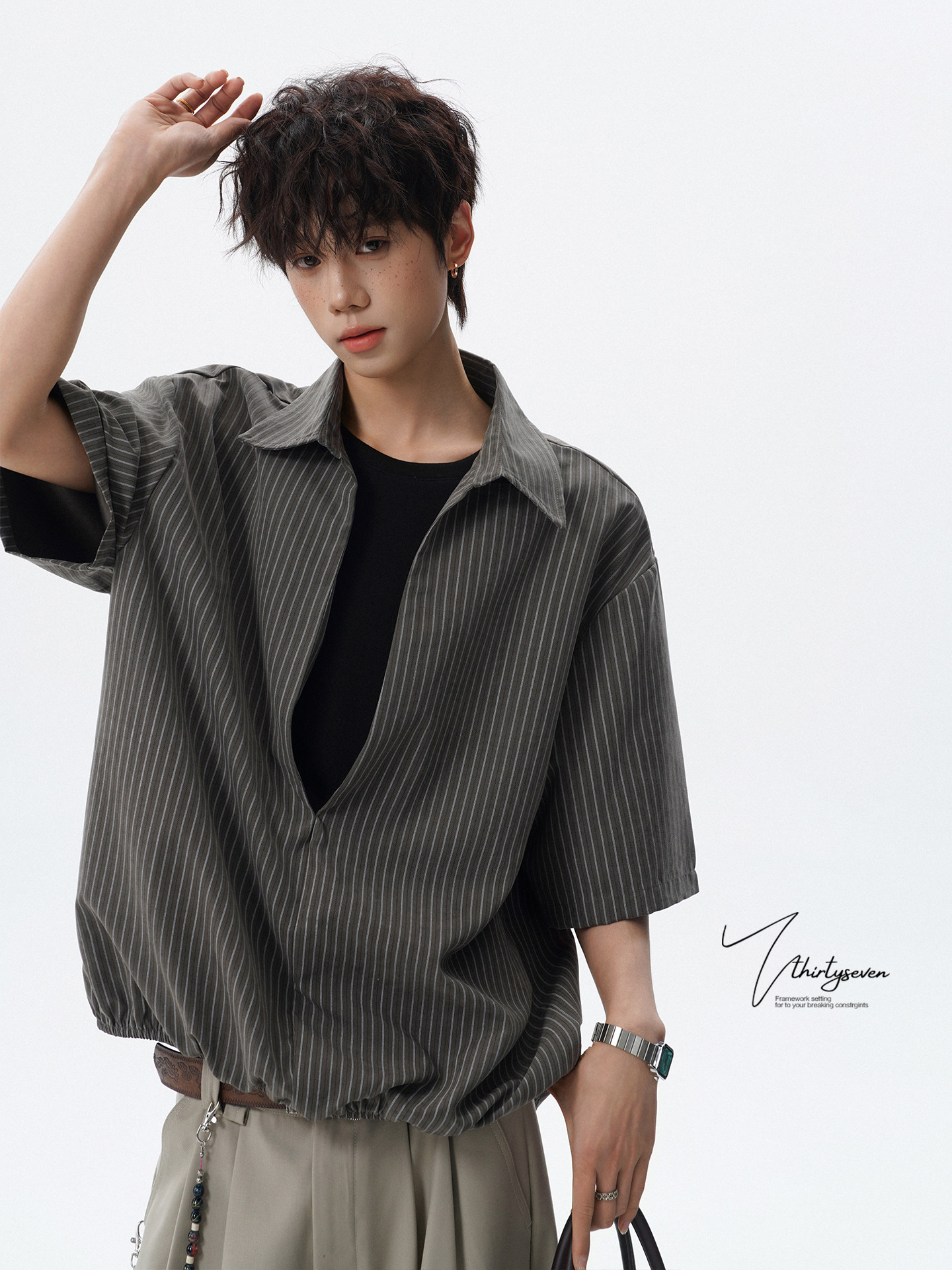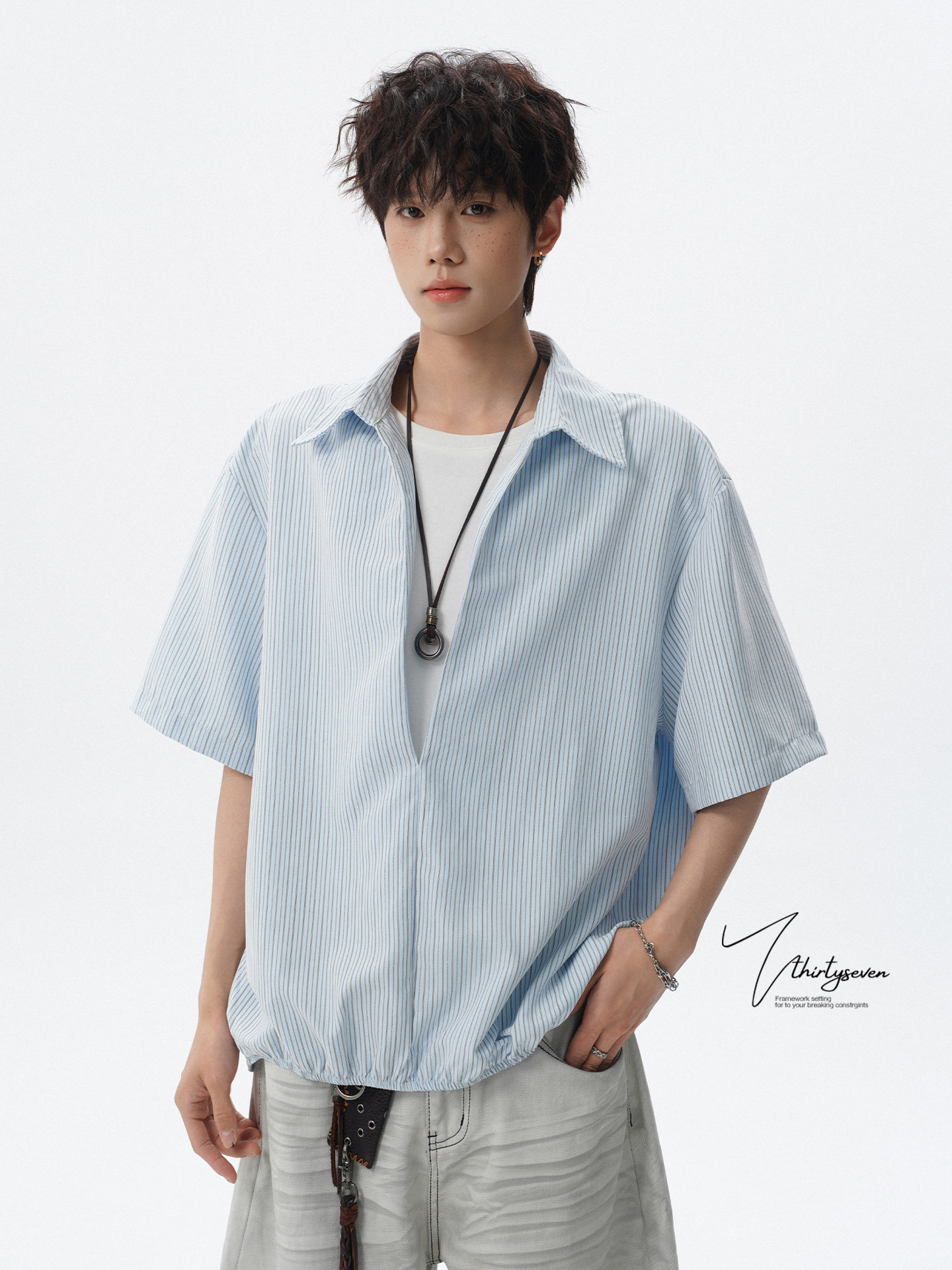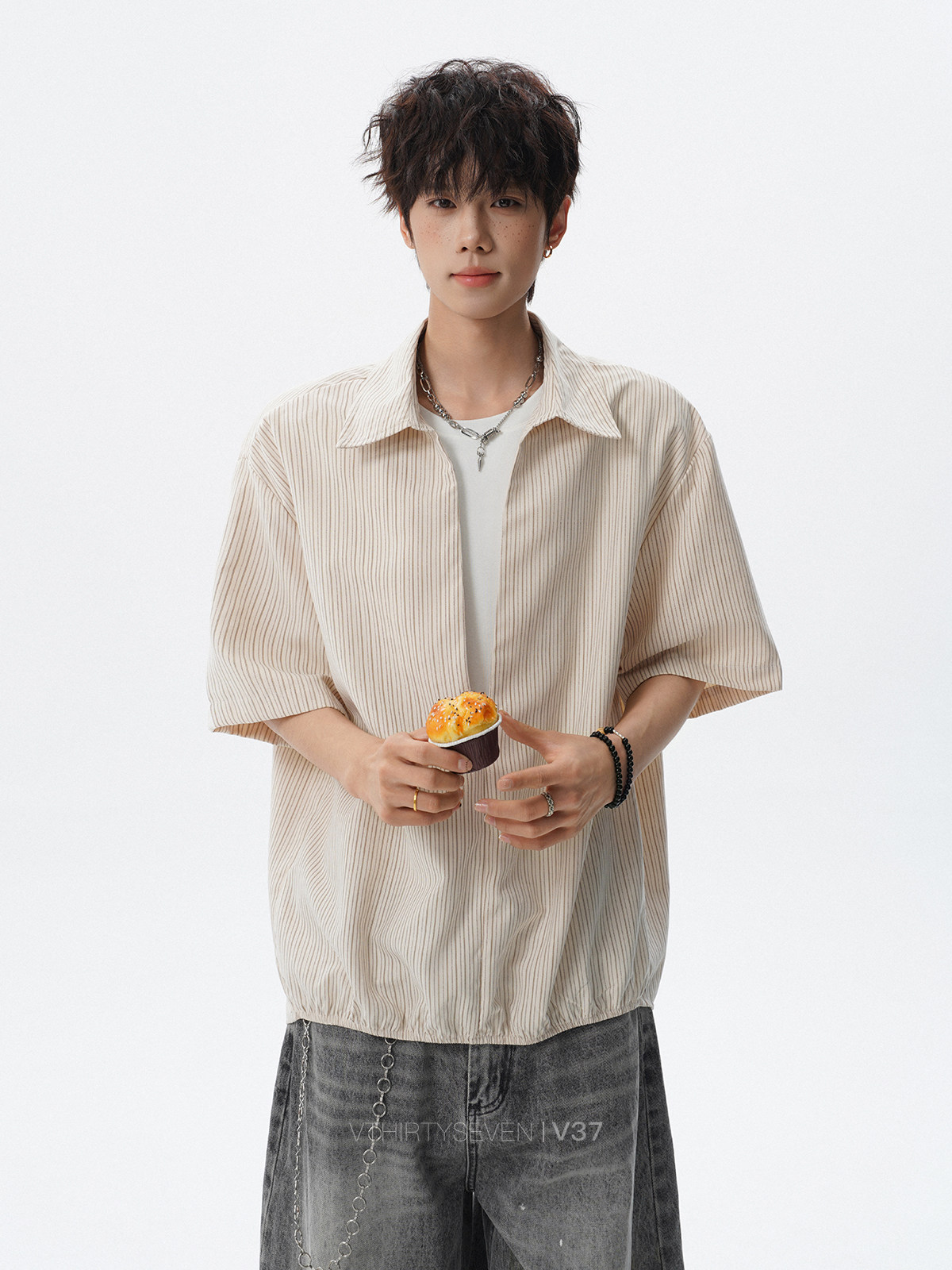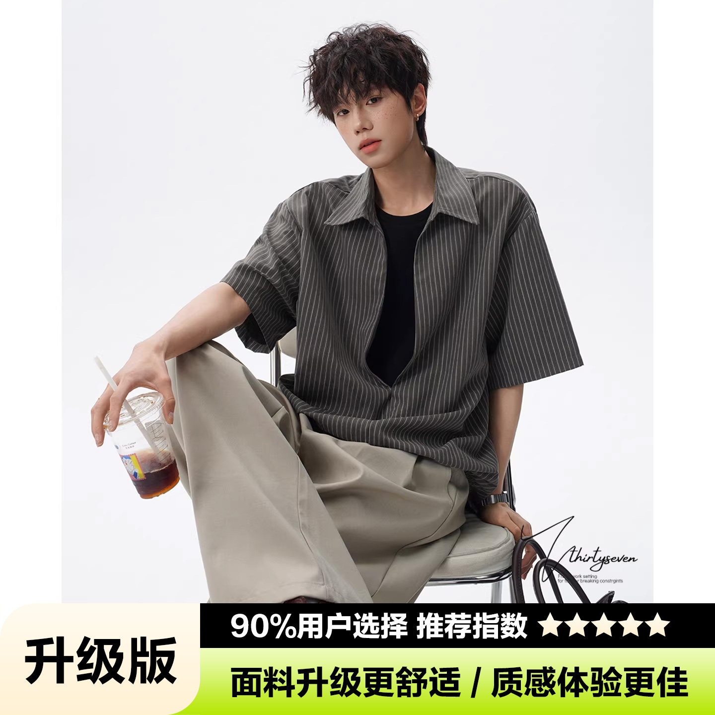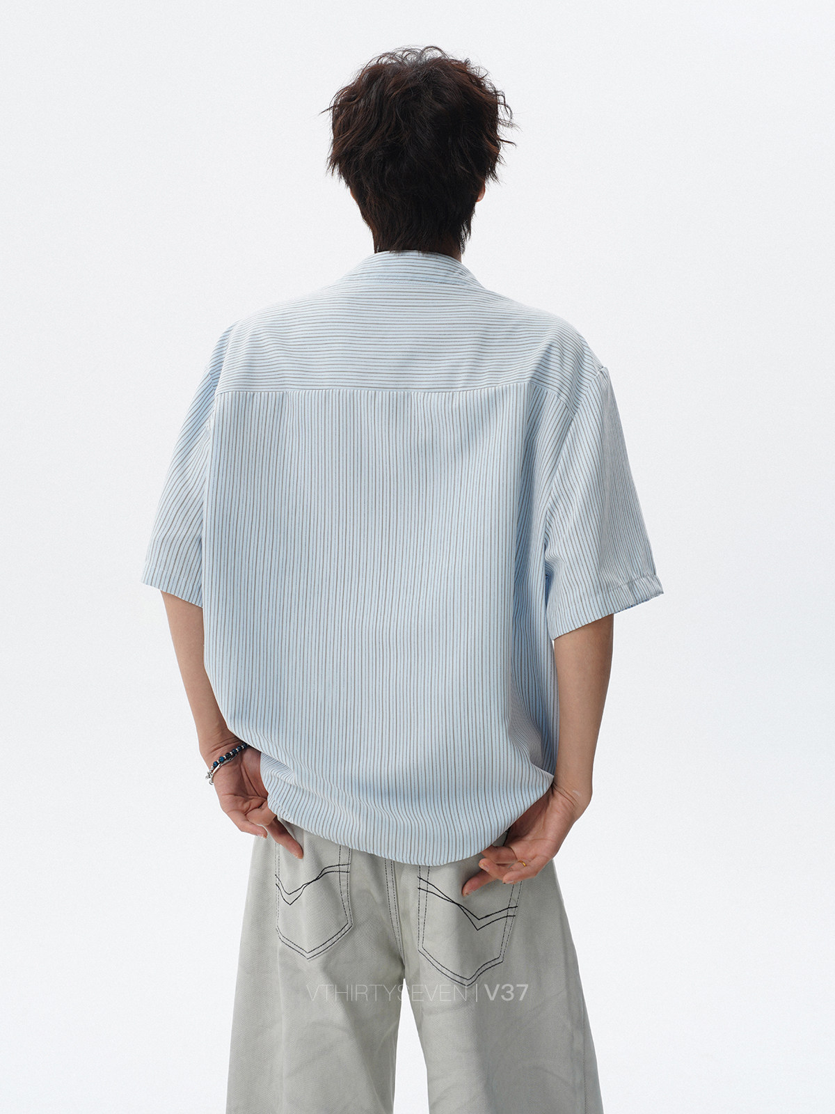 V37老钱风都市松弛感半开襟衬衫男夏季日系潮牌松紧下摆短袖衬衣