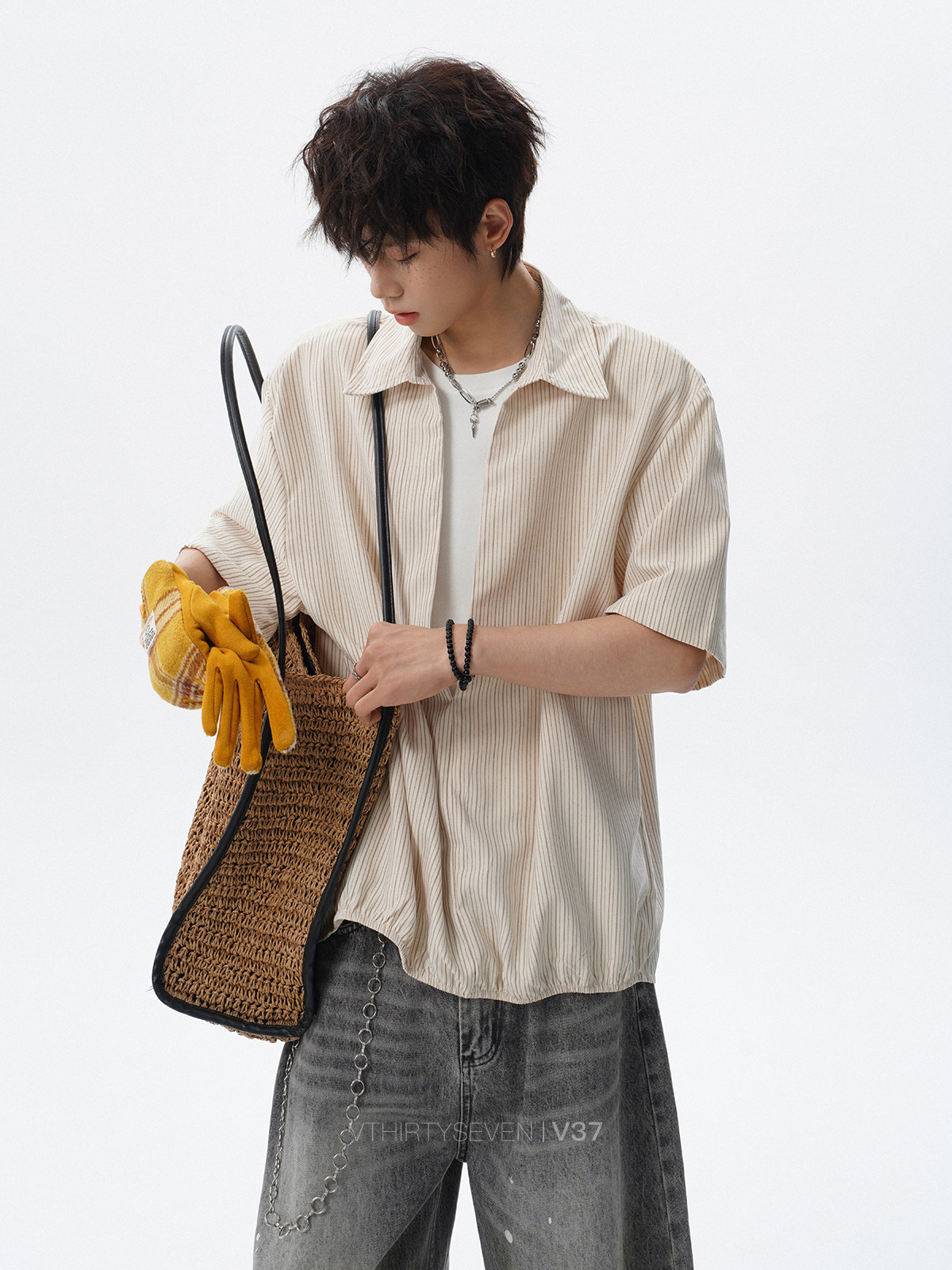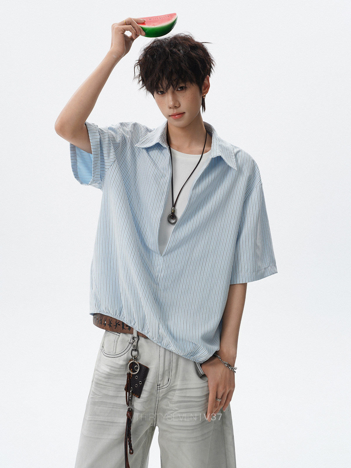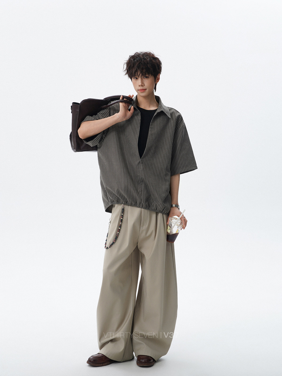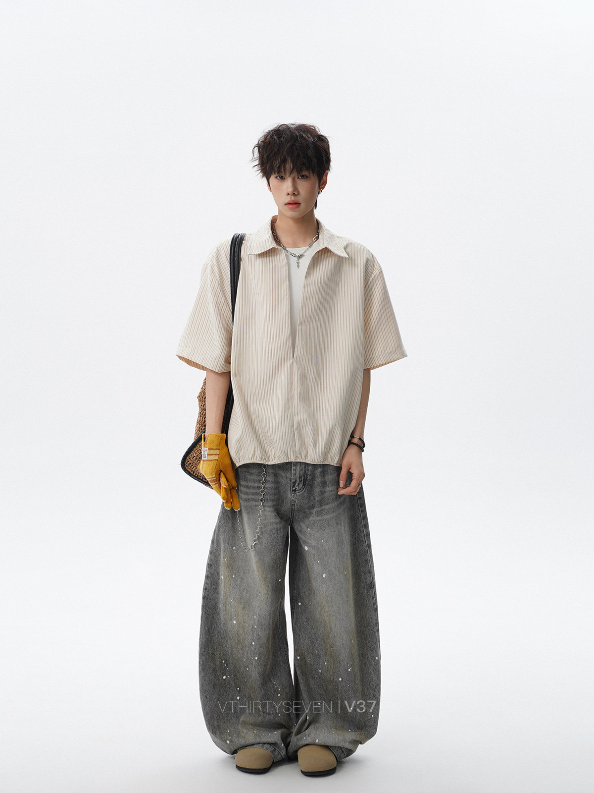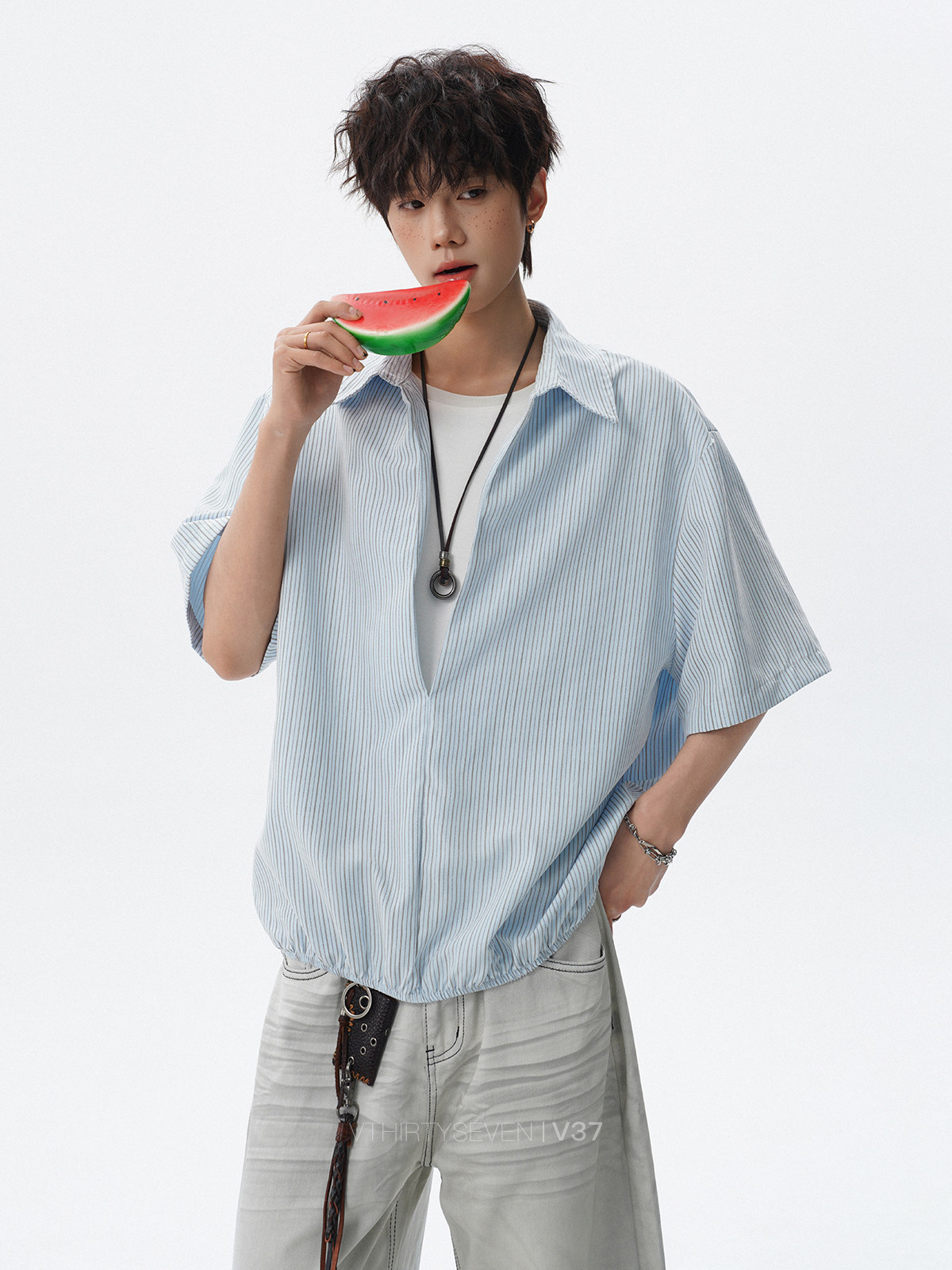 V37老钱风都市松弛感半开襟衬衫男夏季日系潮牌松紧下摆短袖衬衣