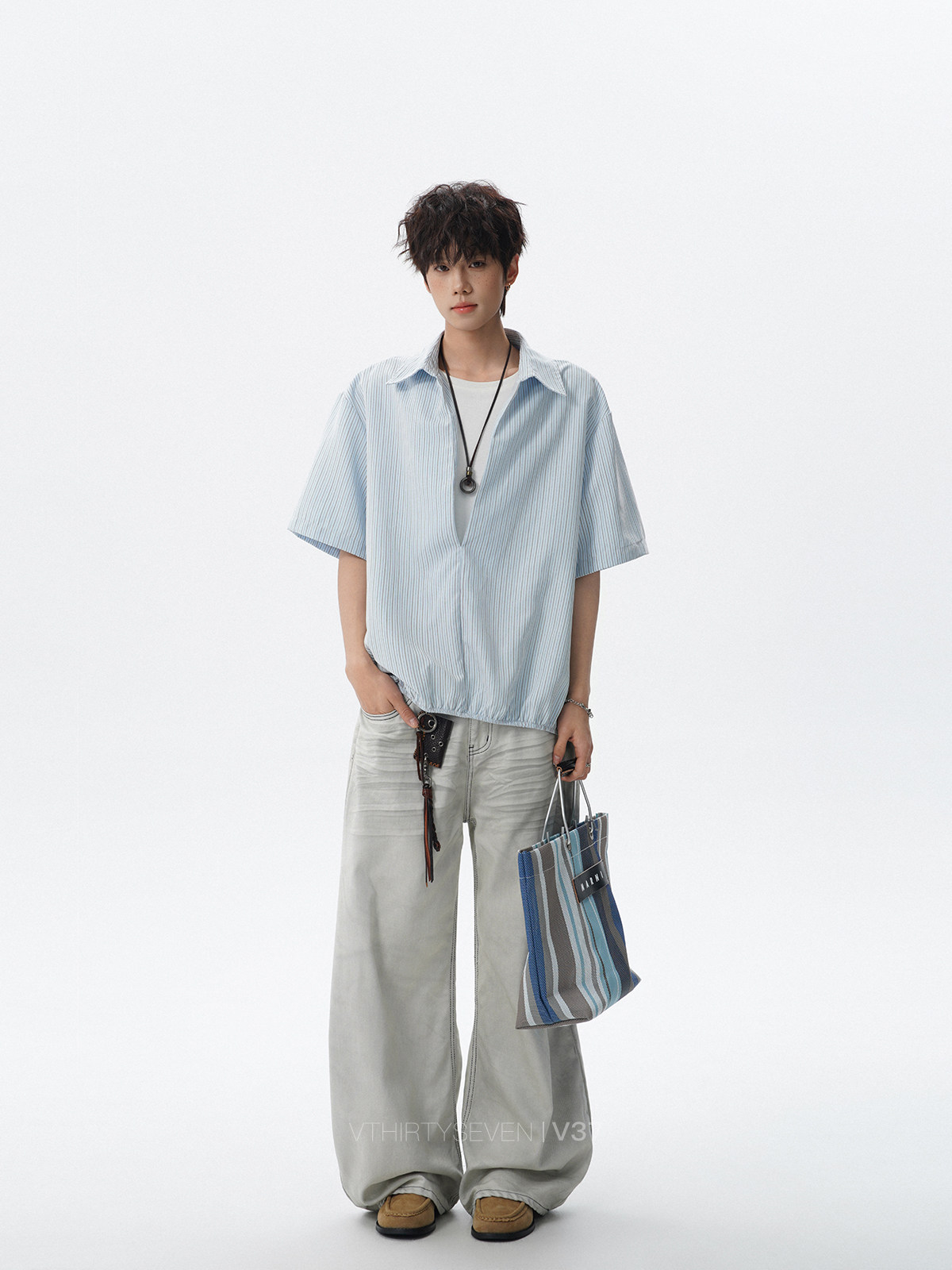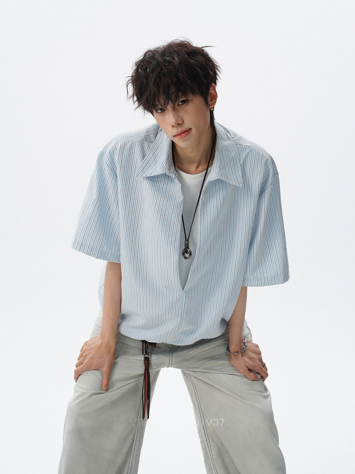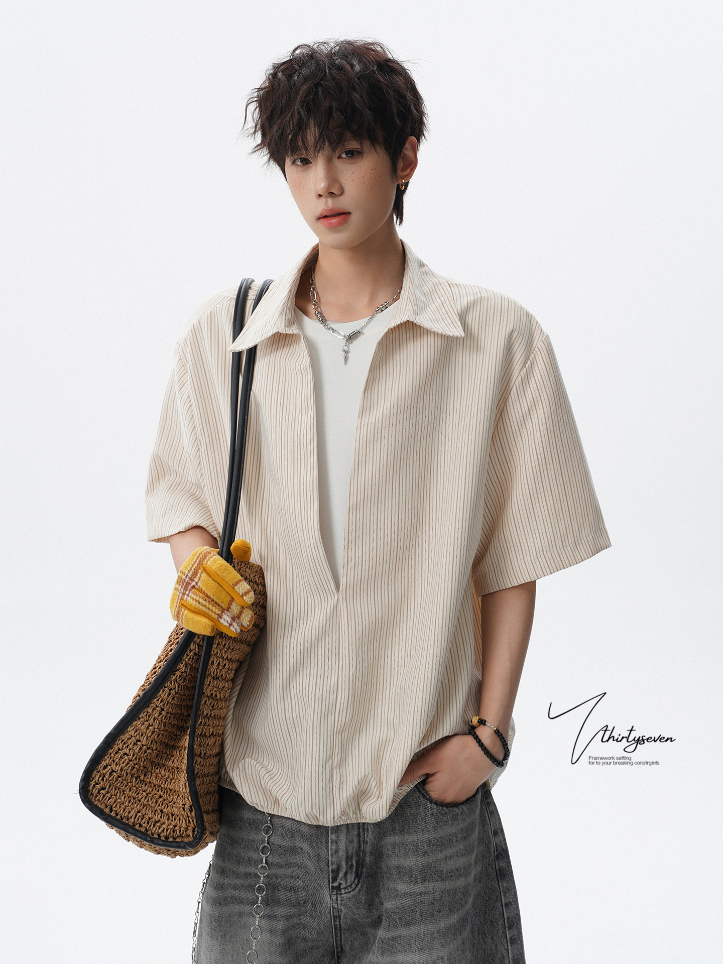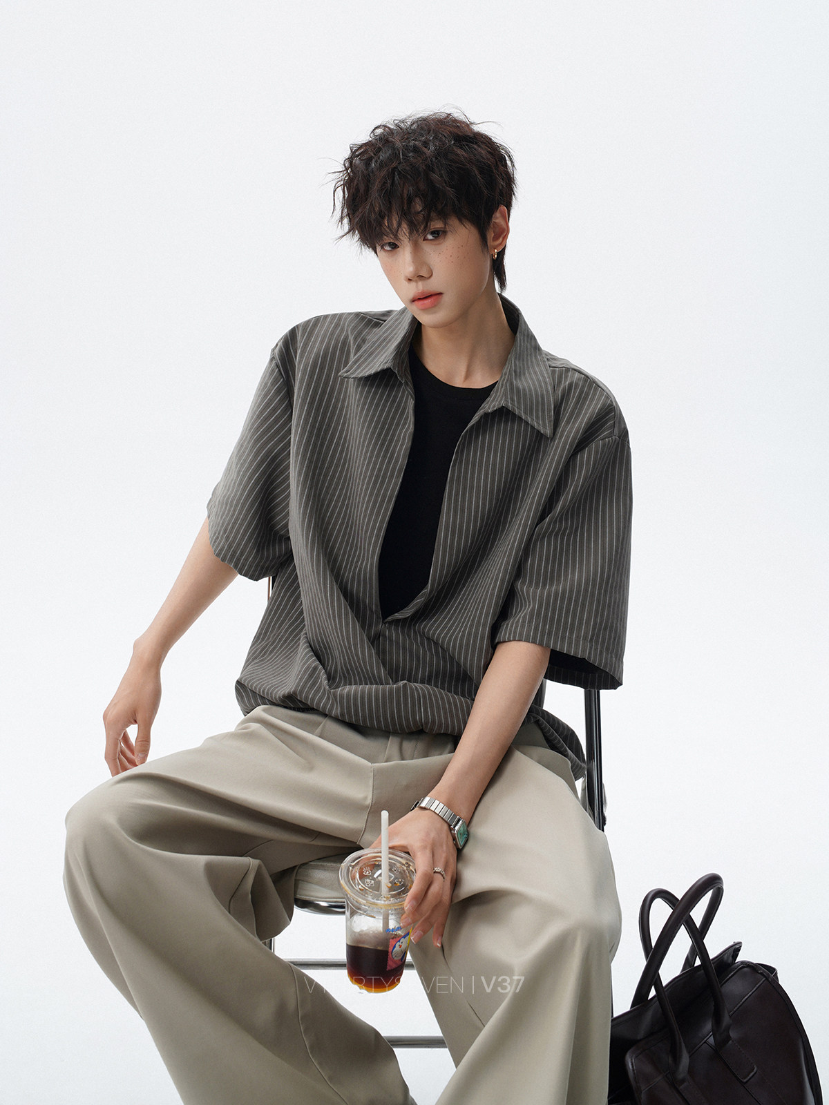 V37老钱风都市松弛感半开襟衬衫男夏季日系潮牌松紧下摆短袖衬衣