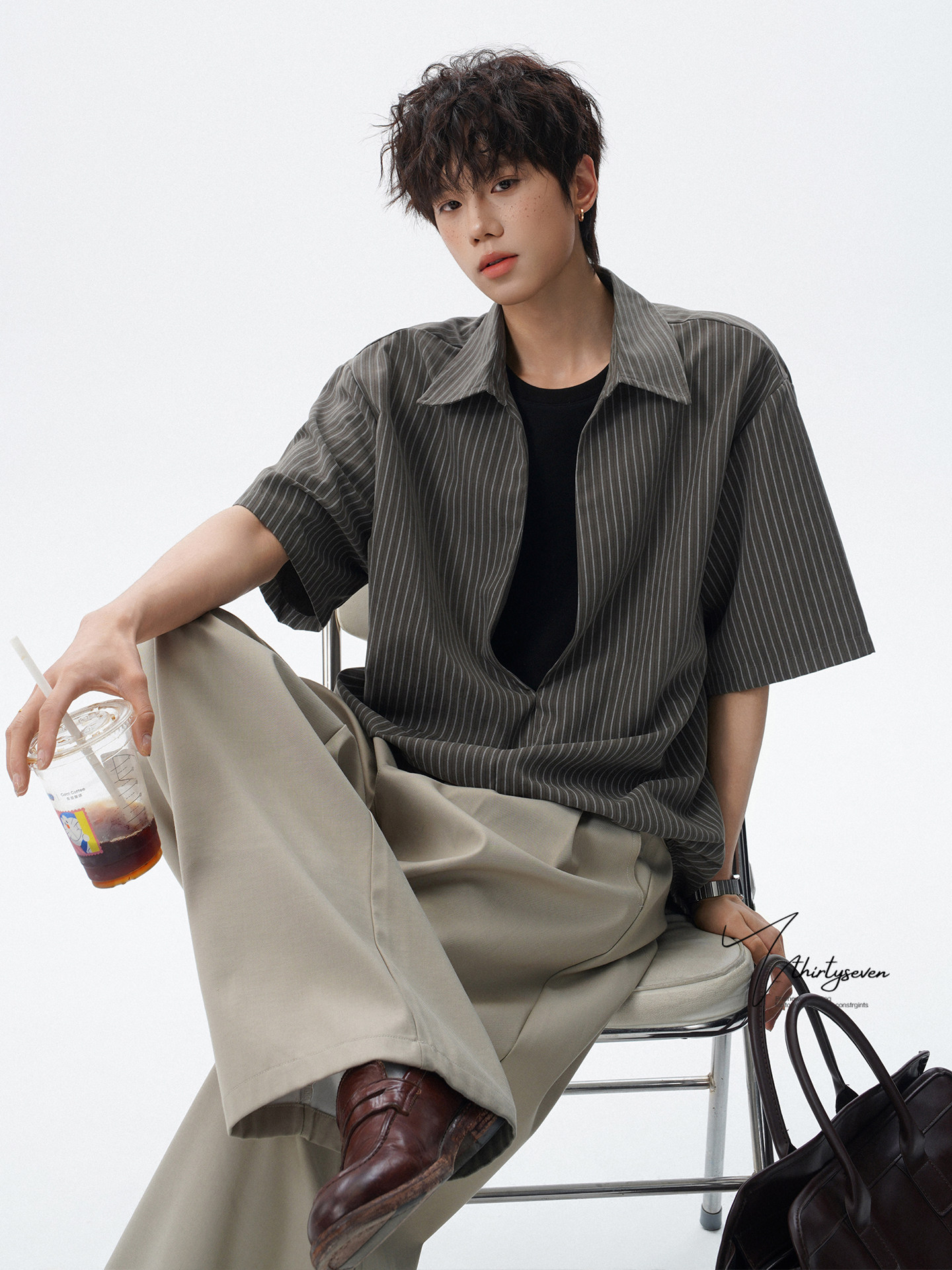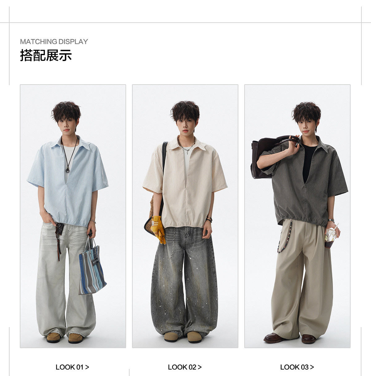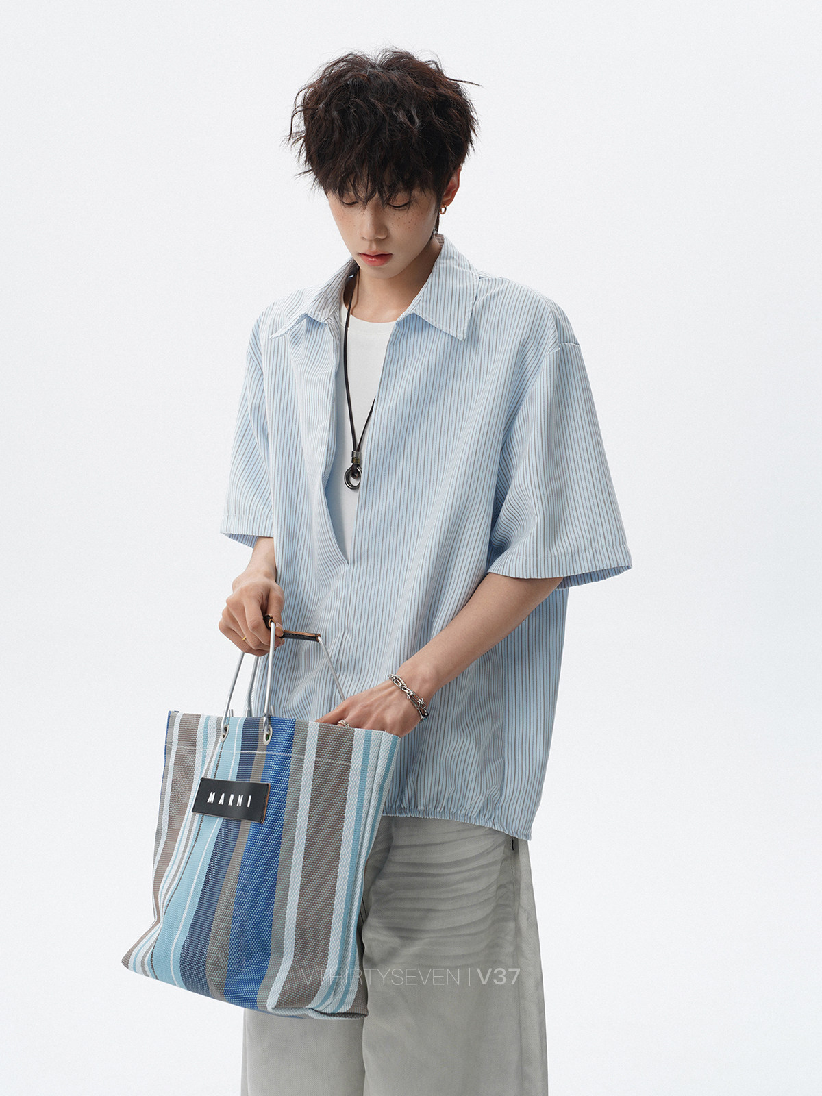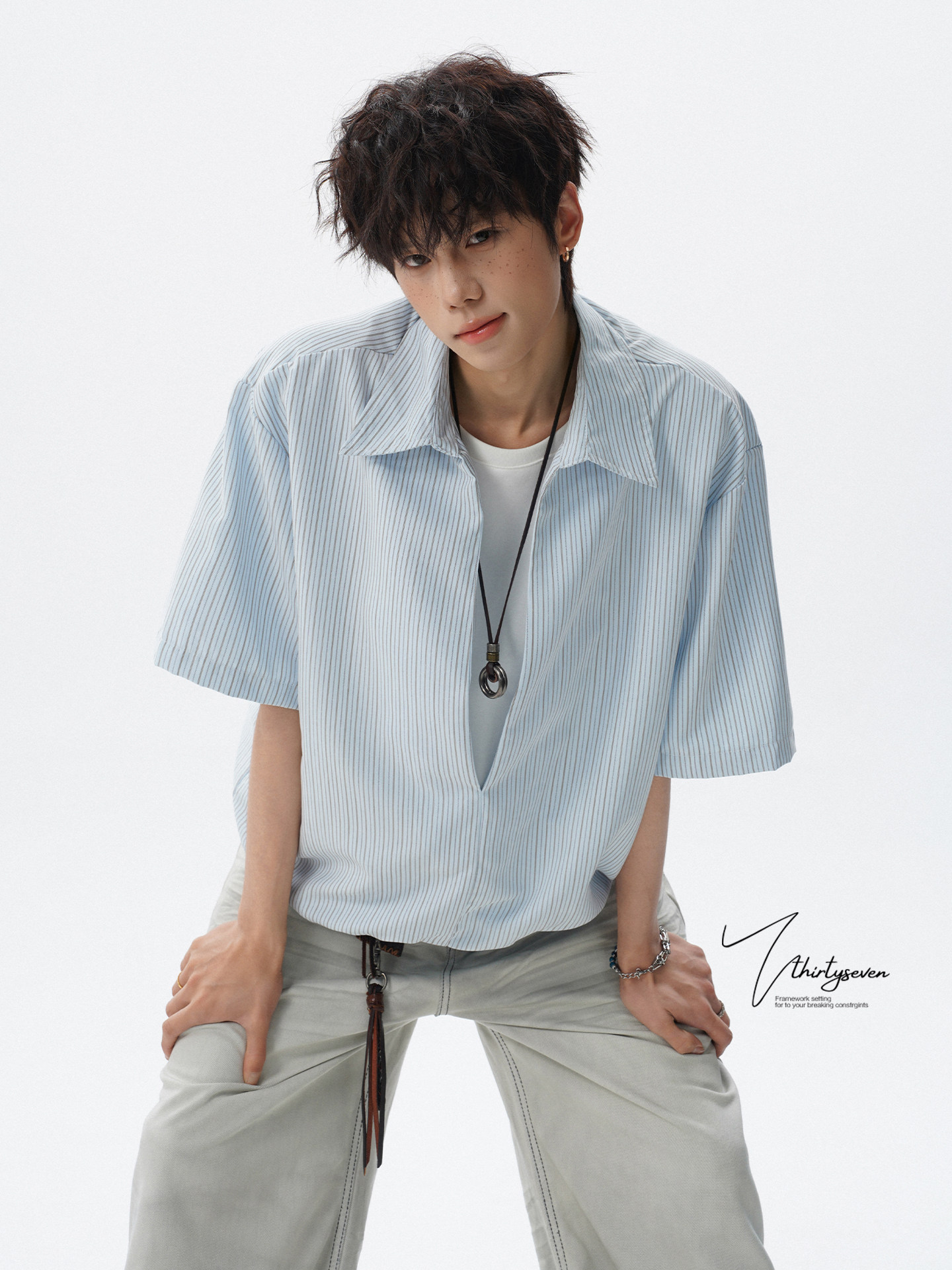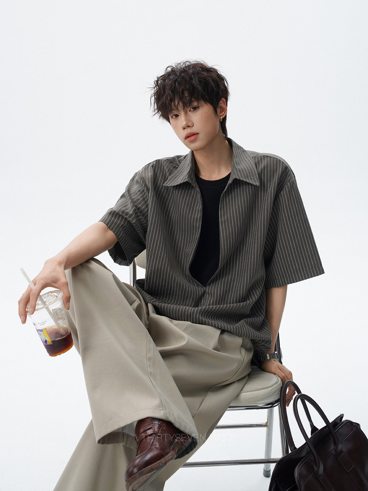 V37老钱风都市松弛感半开襟衬衫男夏季日系潮牌松紧下摆短袖衬衣