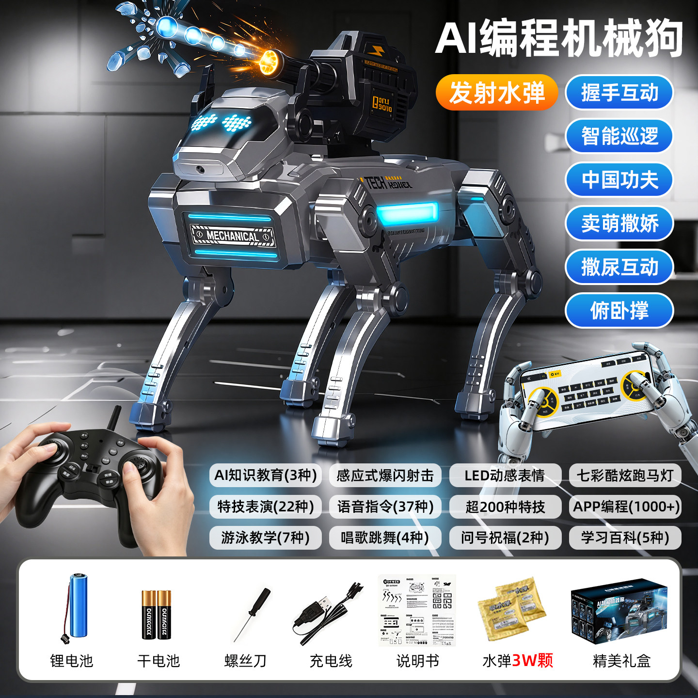送礼推荐✅AI握手智能机器狗⭐单锂电/炮台/3万水弹【双模式+编程/语音/动作/灯光】