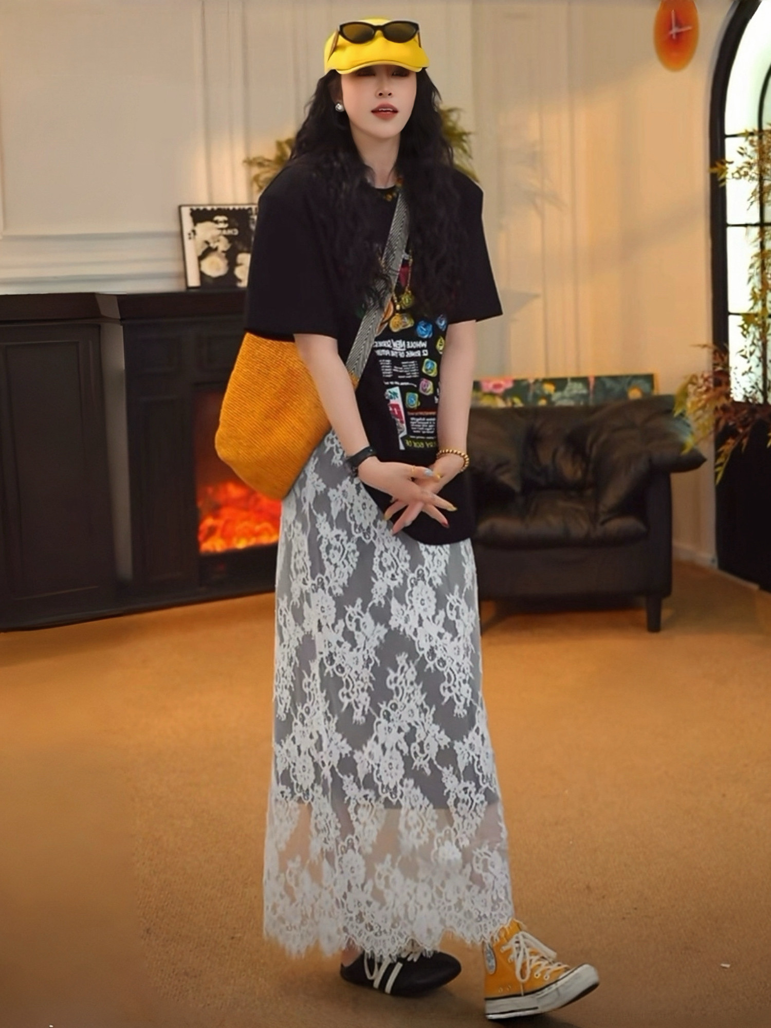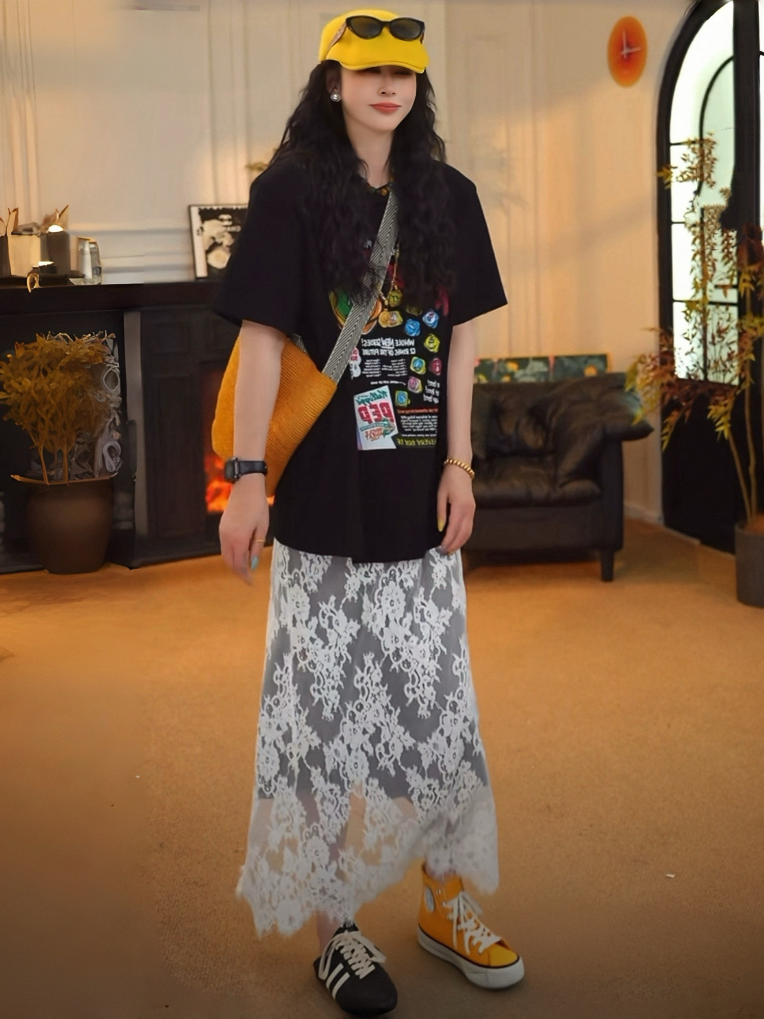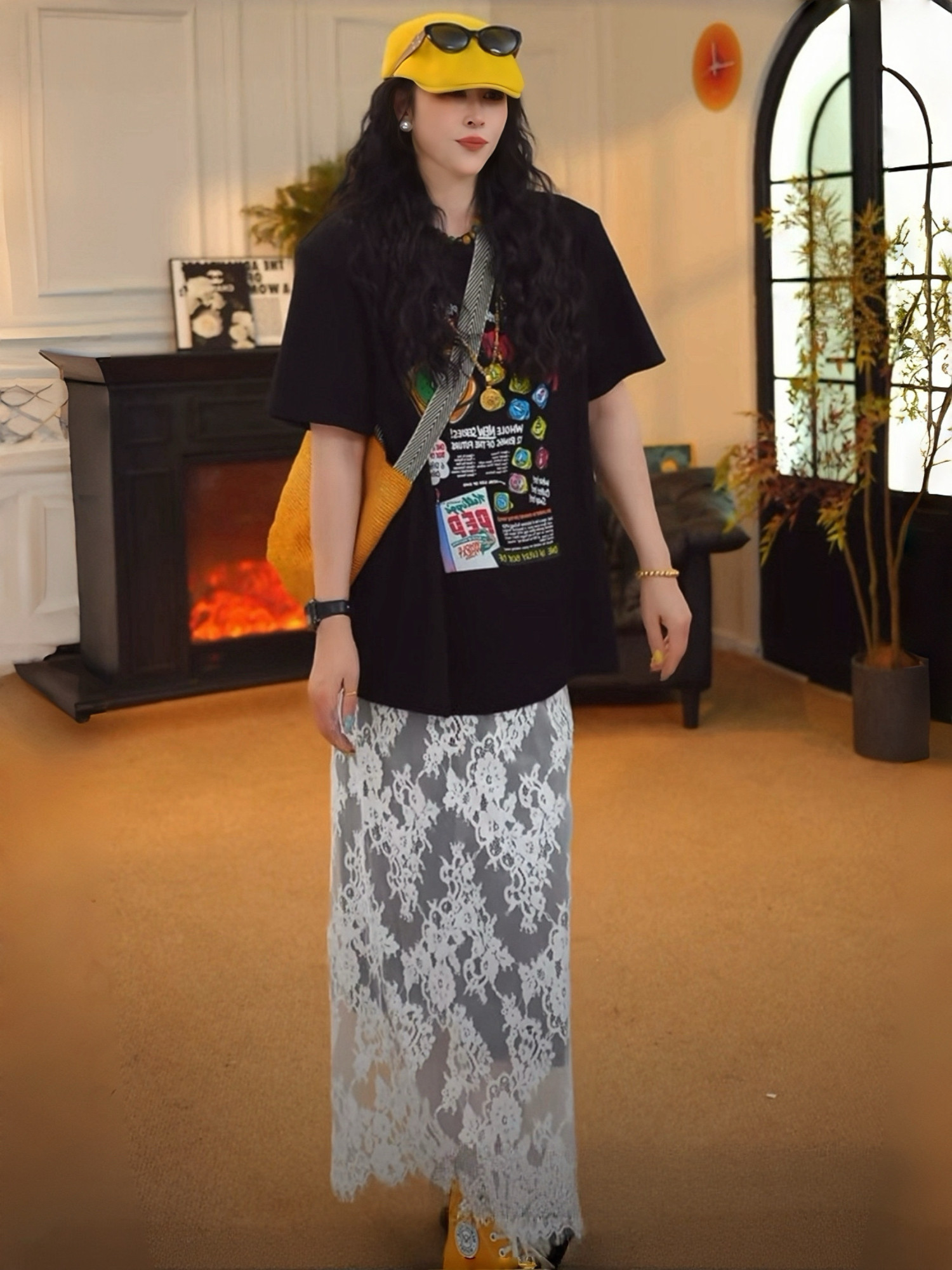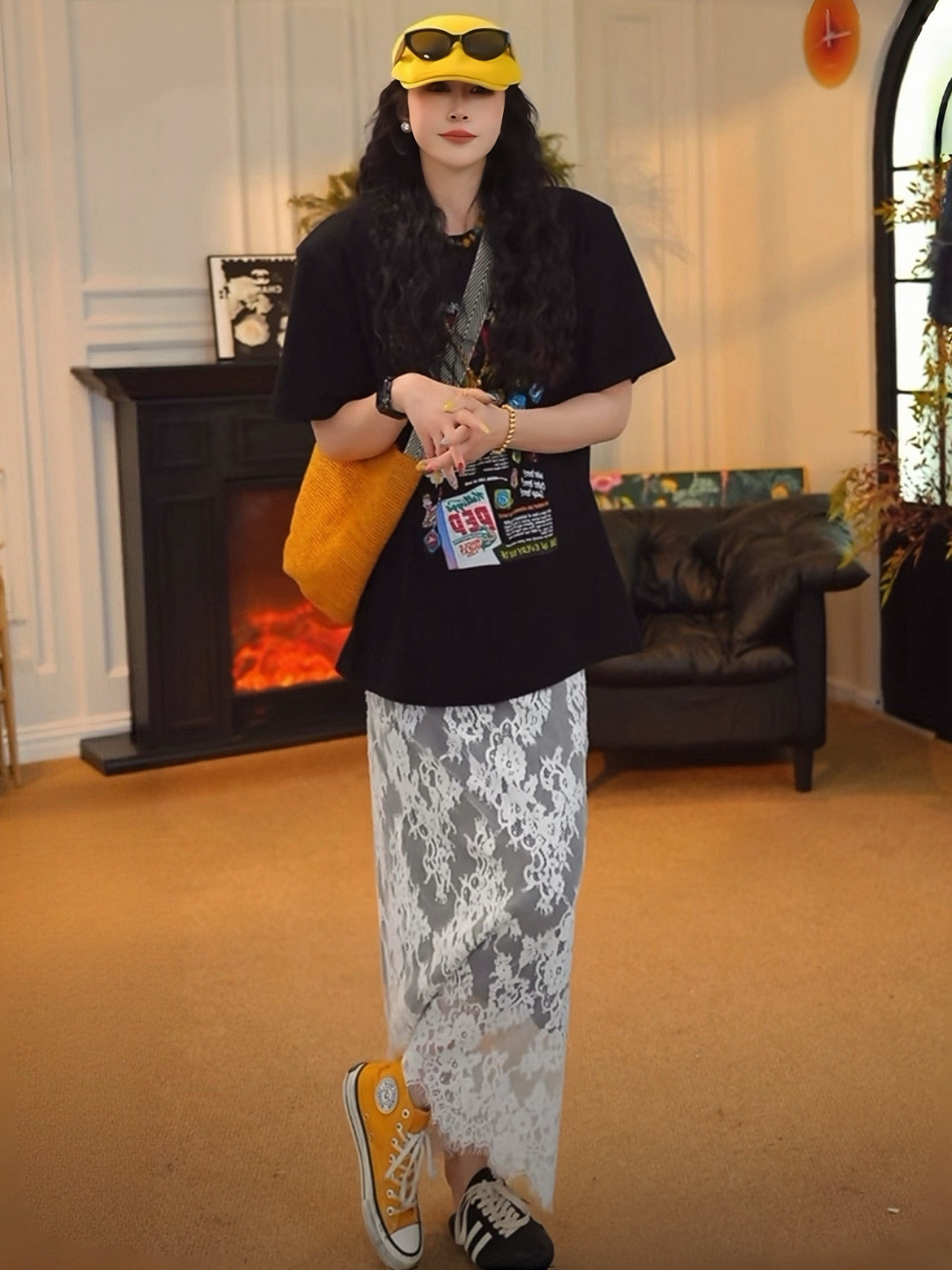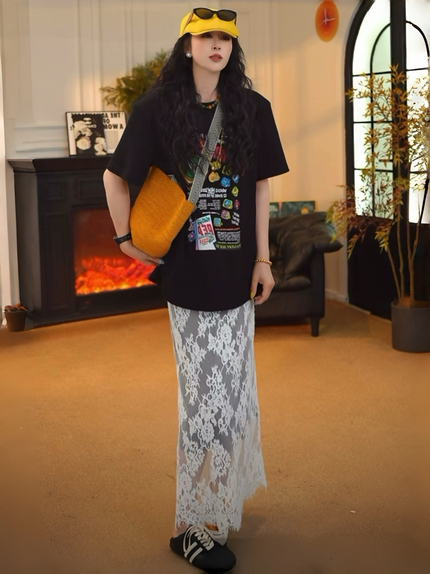 夏天穿搭一整套2026新款韩系慵懒风时尚印花短袖T恤蕾丝半裙套装