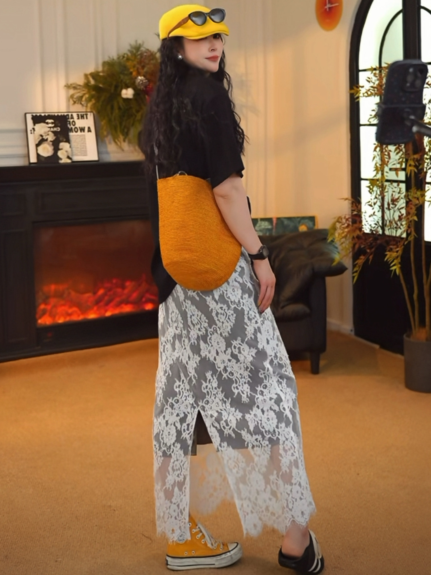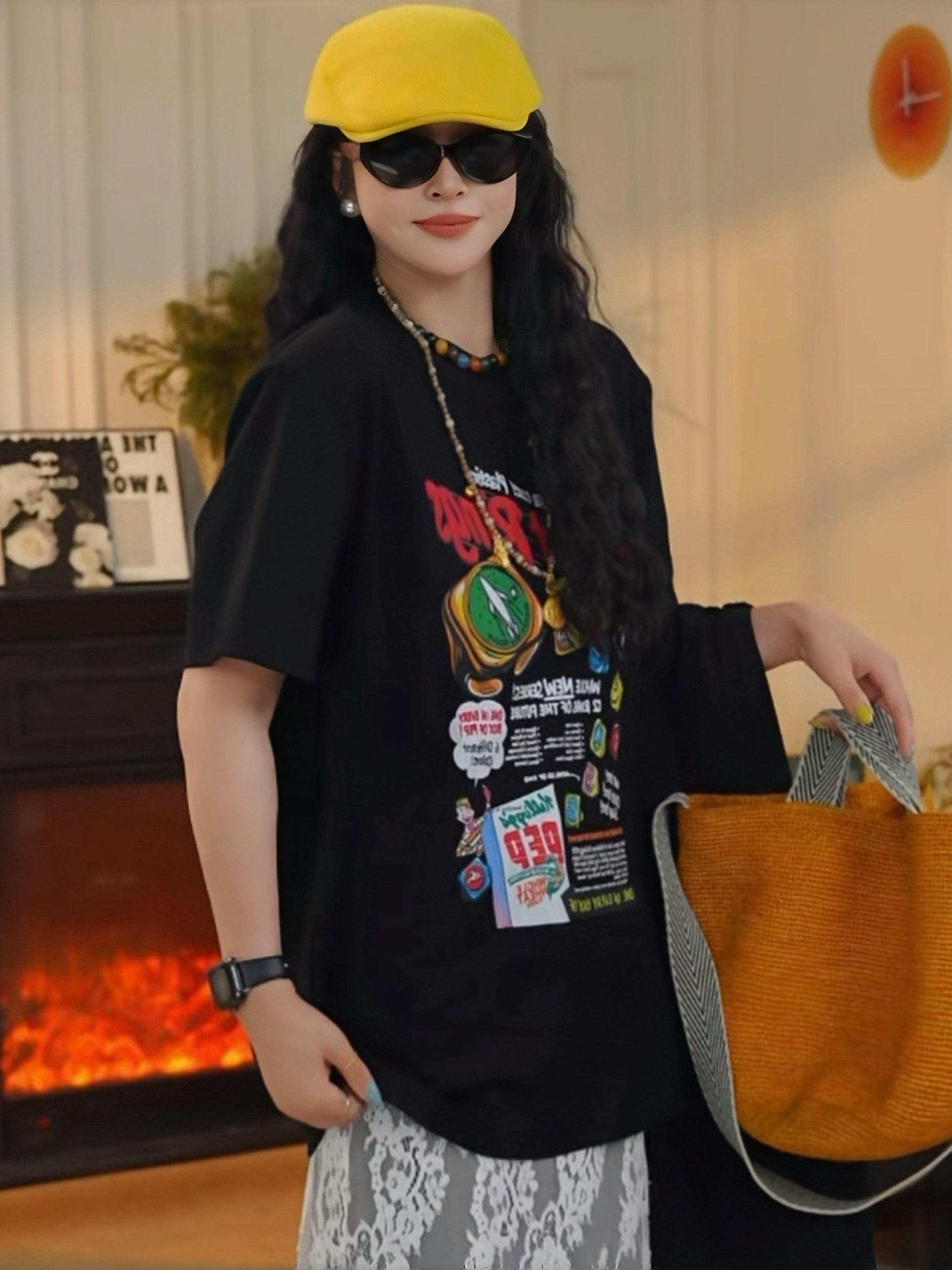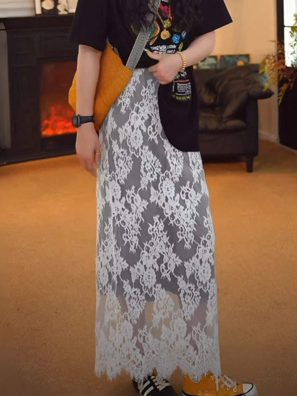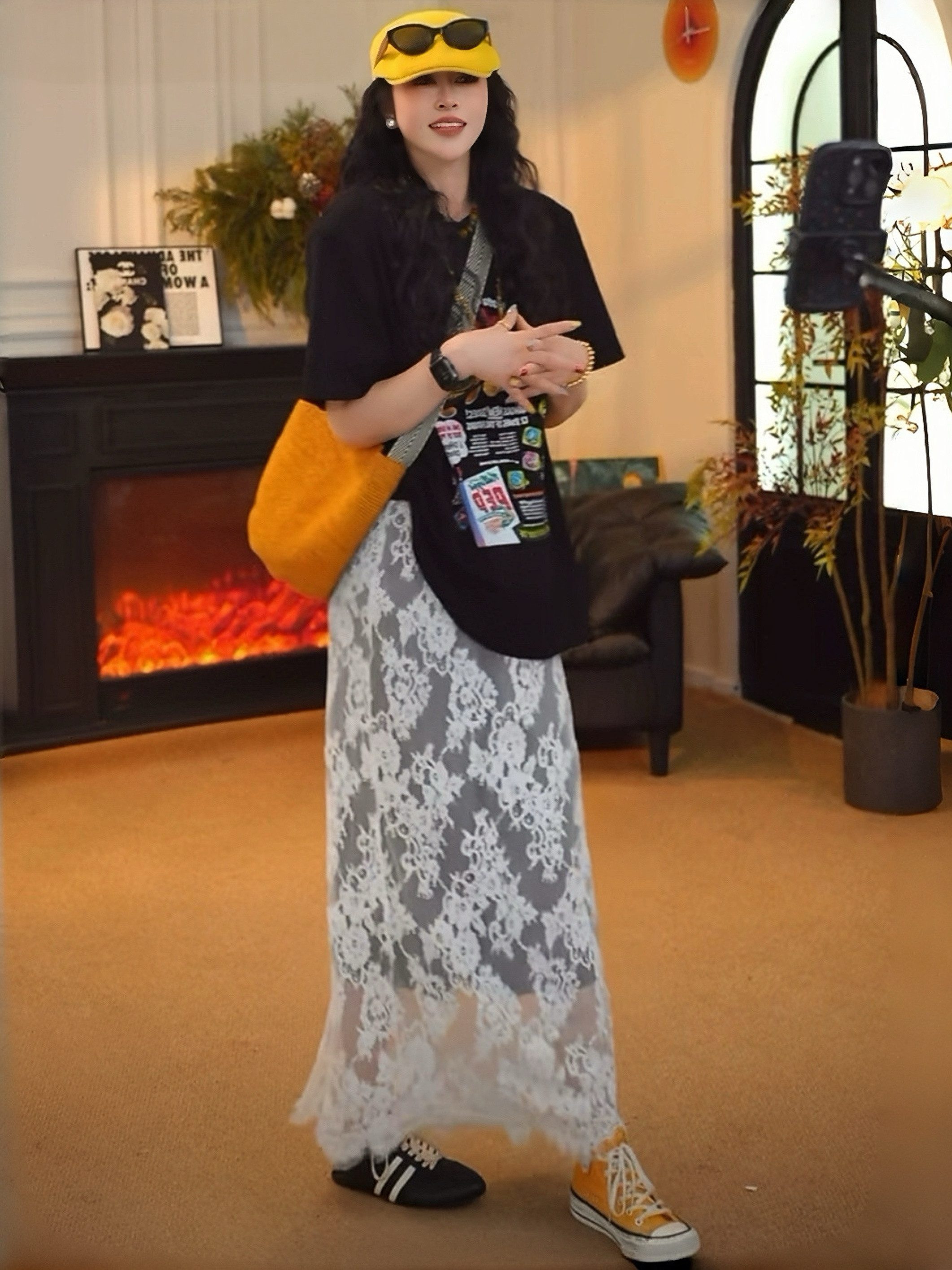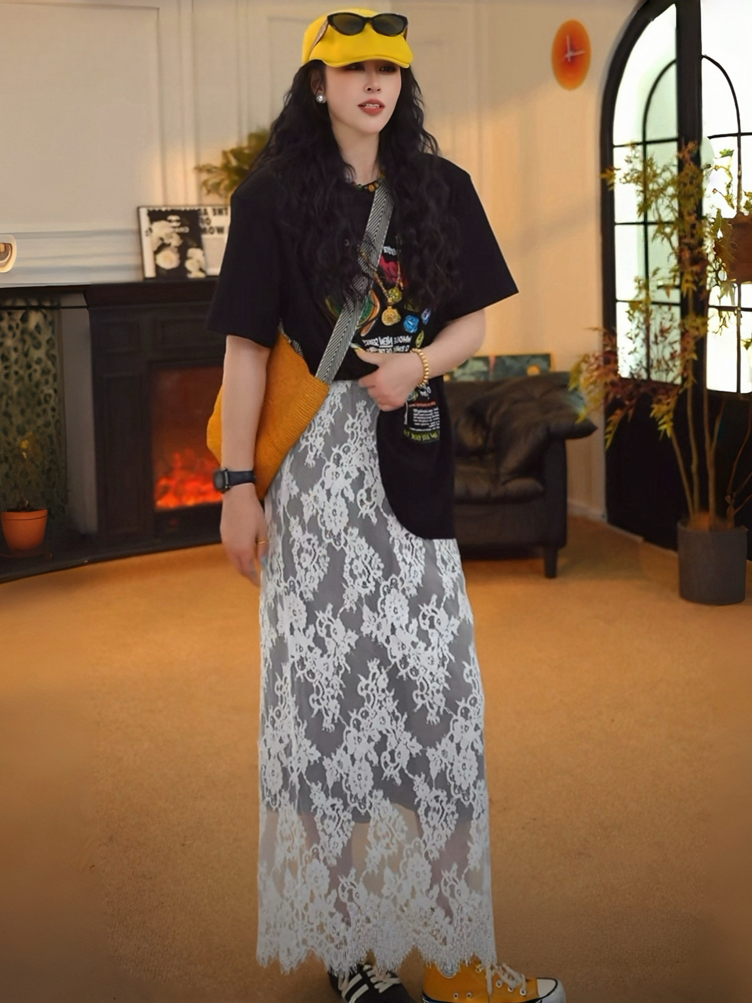 夏天穿搭一整套2026新款韩系慵懒风时尚印花短袖T恤蕾丝半裙套装