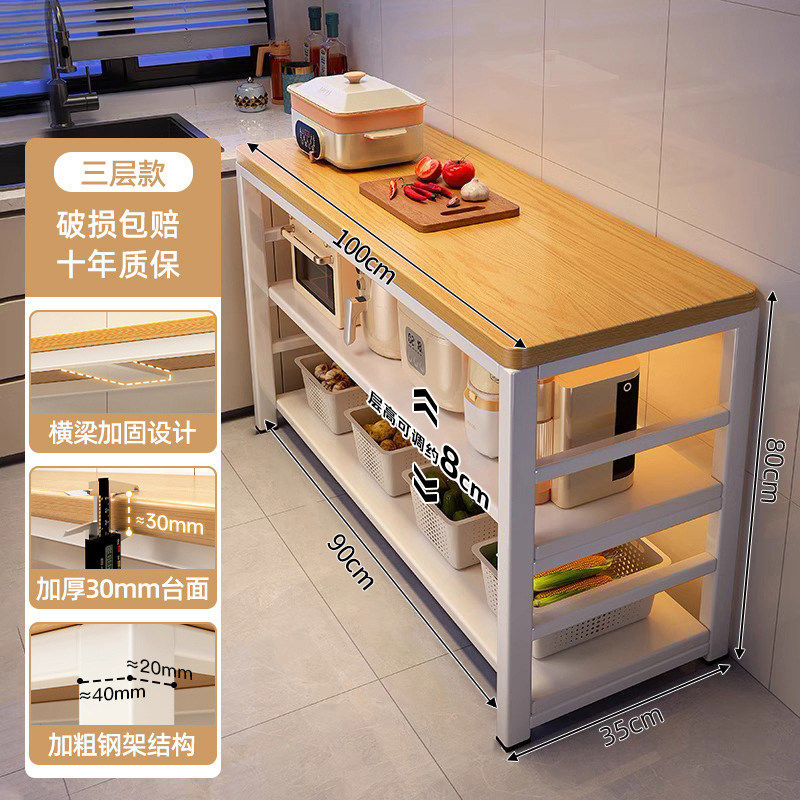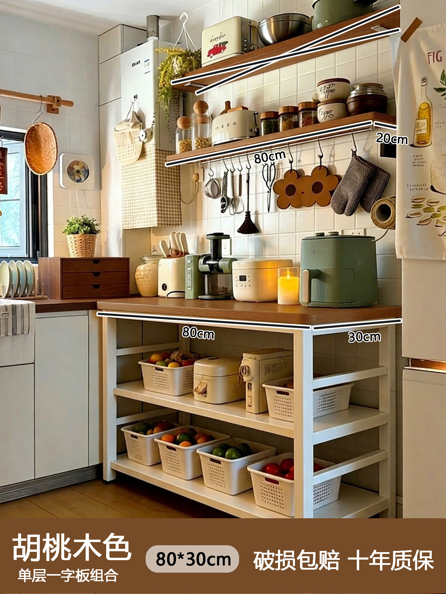 实木厨房置物架落地多层微波炉多功能切菜工作台墙上一字板收纳架