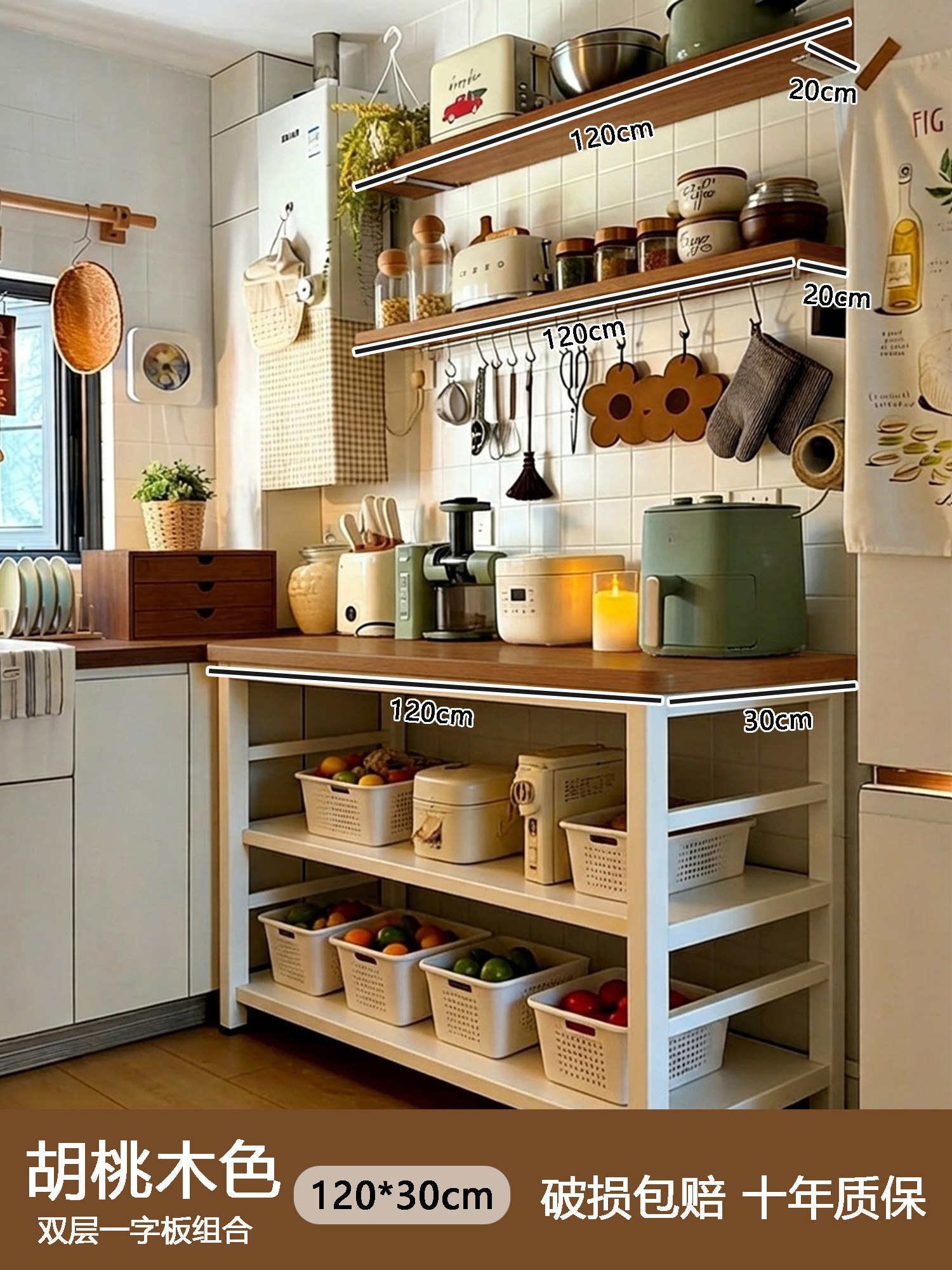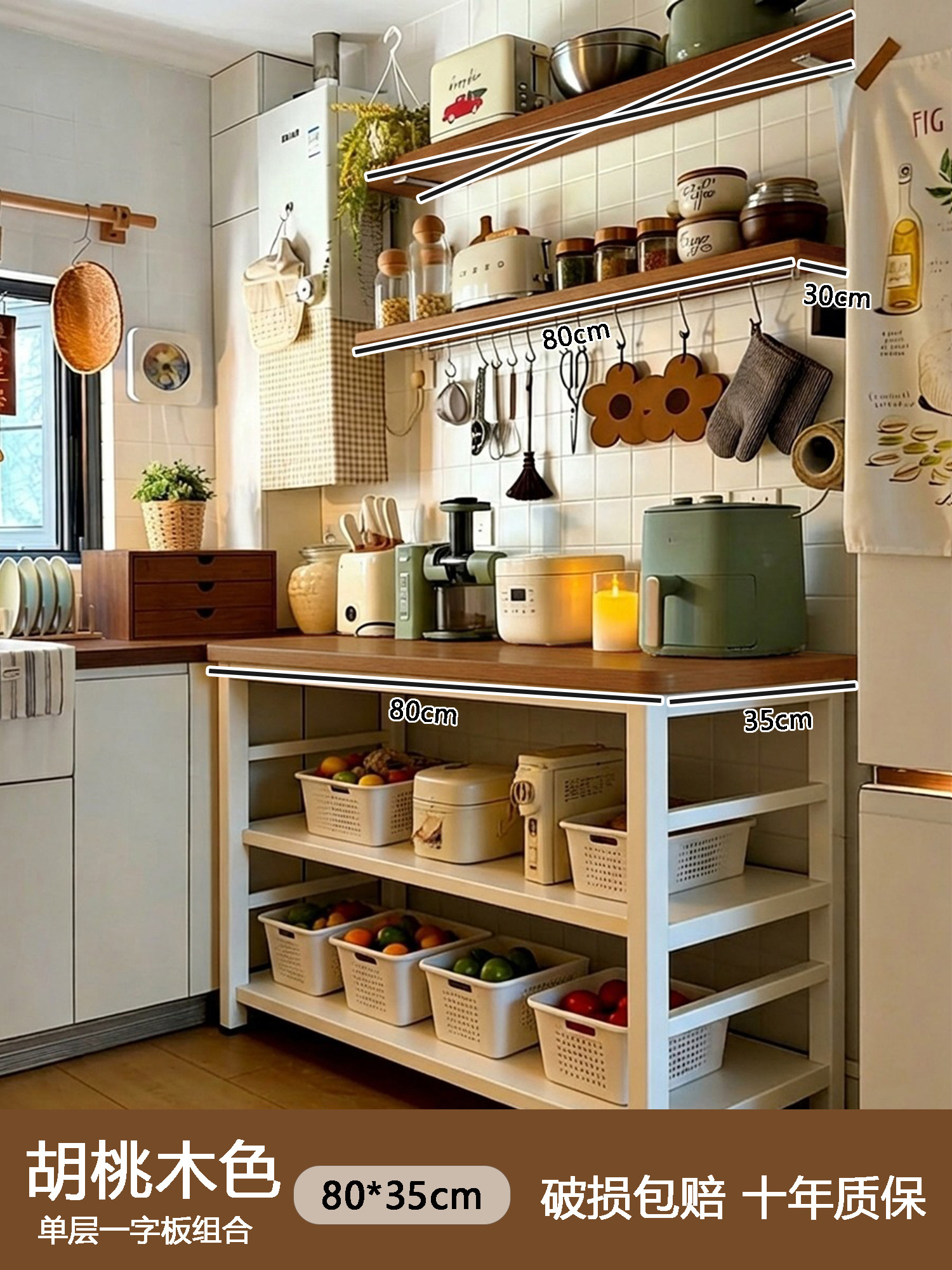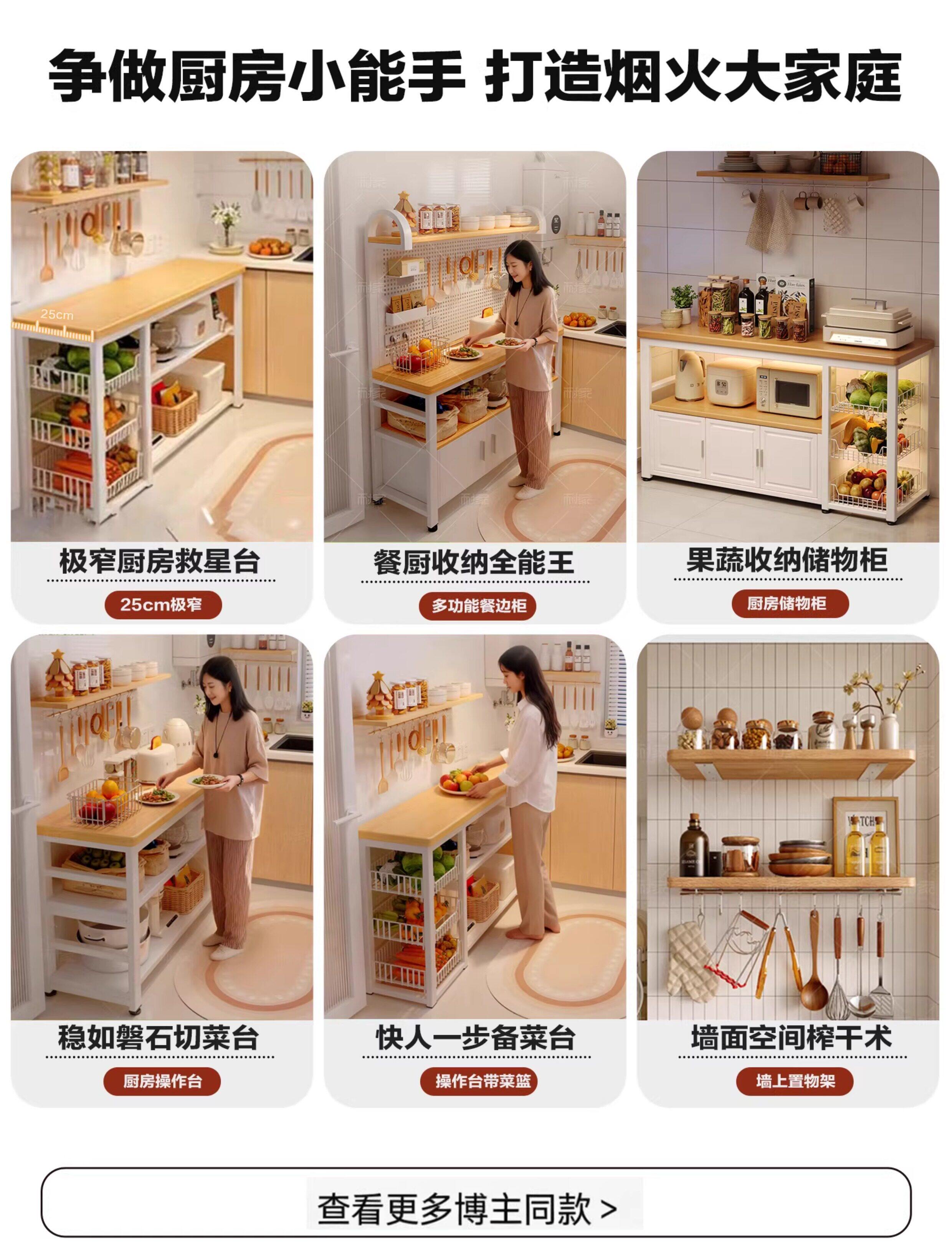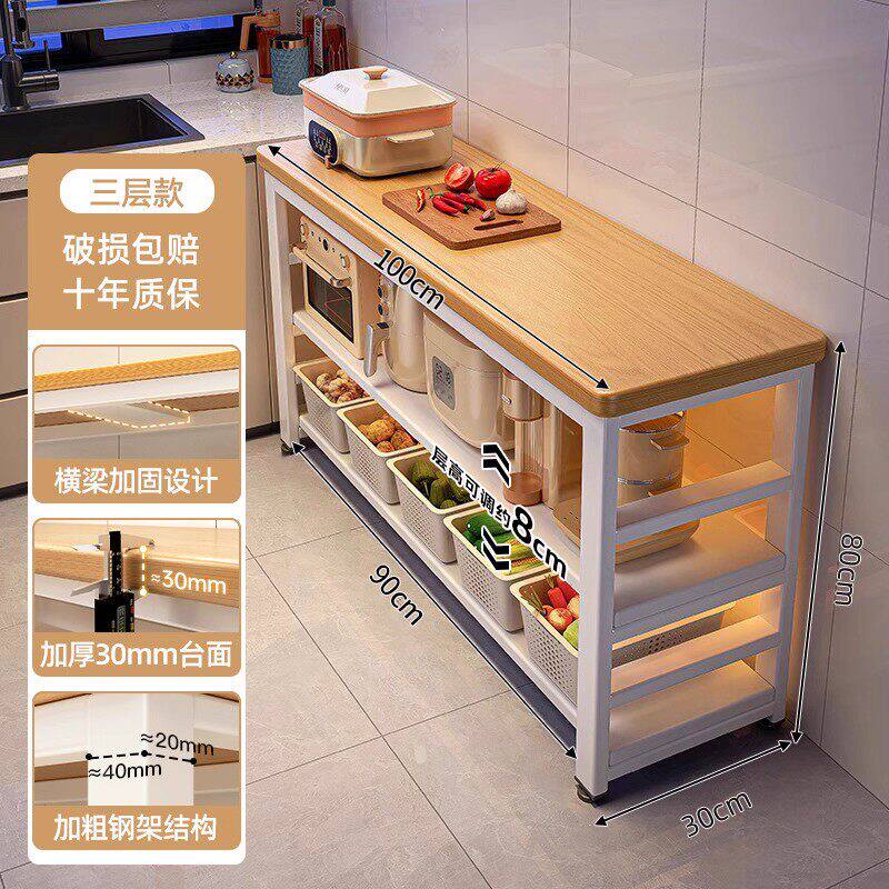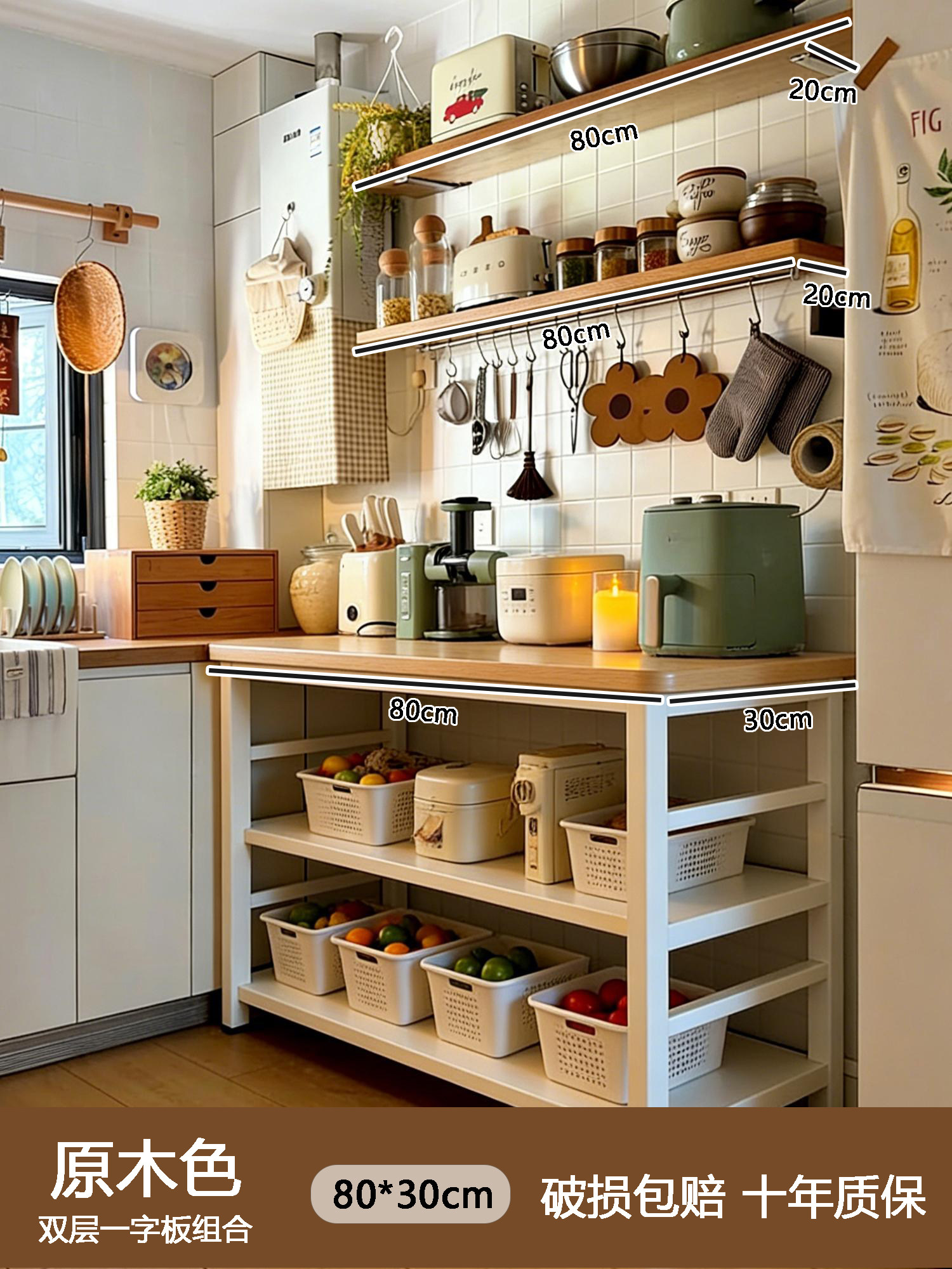 HomeProducts实木厨房置物架落地多层微波炉多功能切菜工作台墙上一字板收纳架