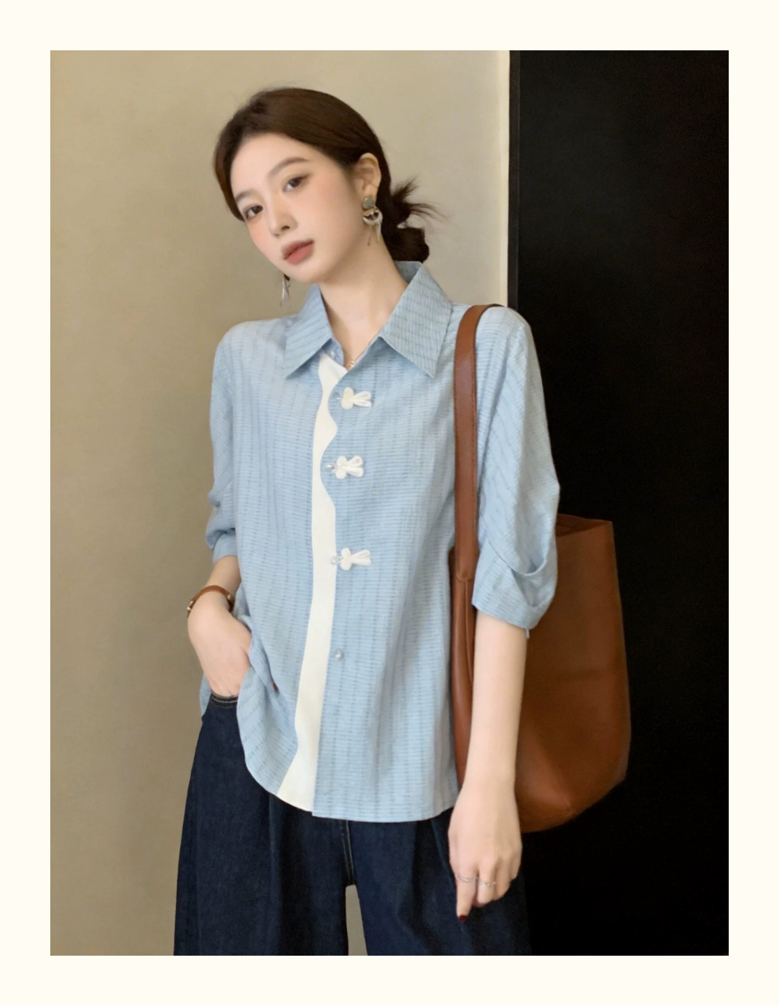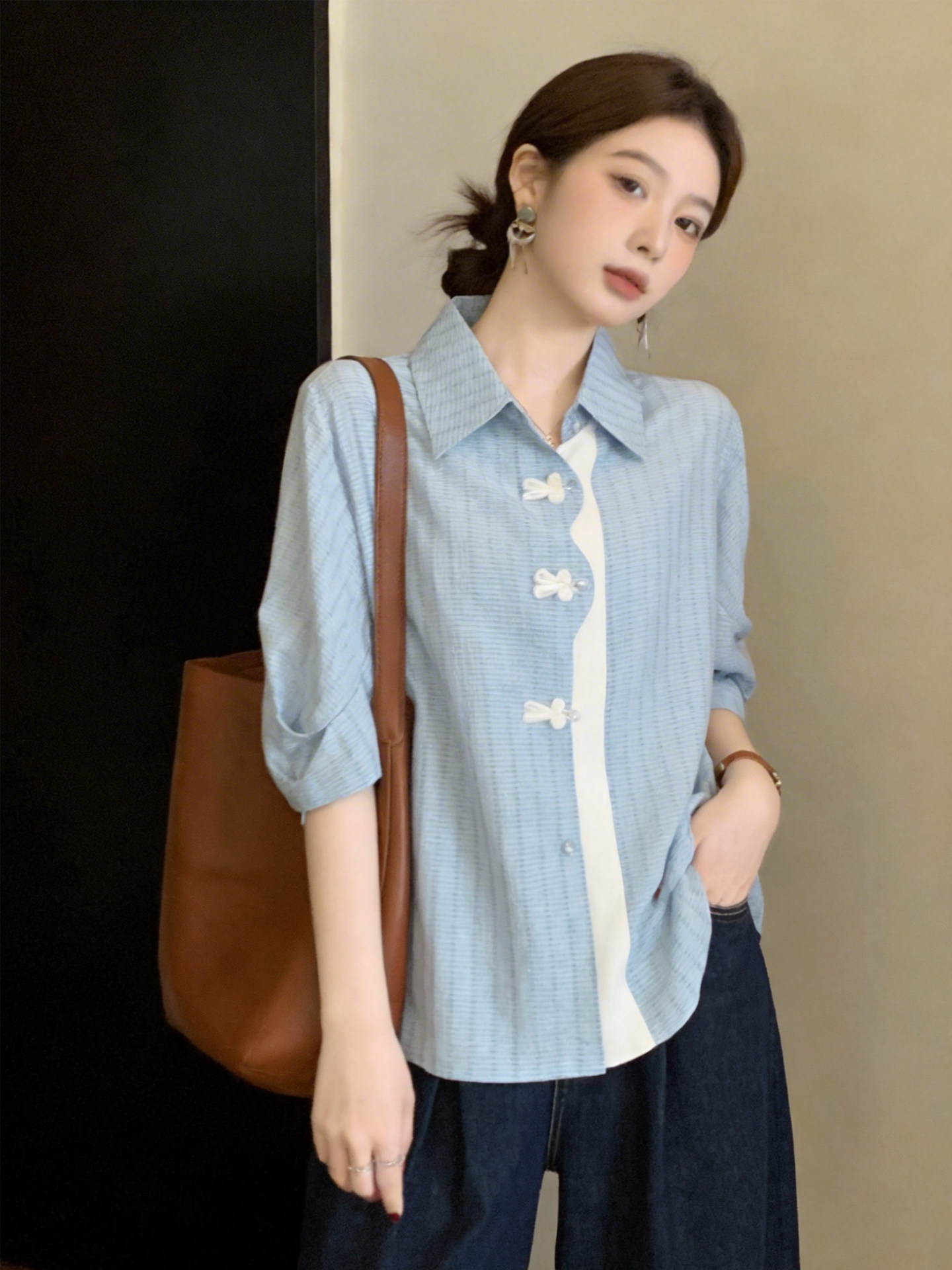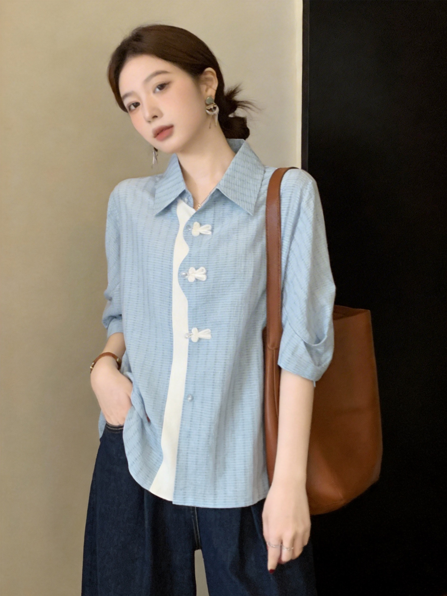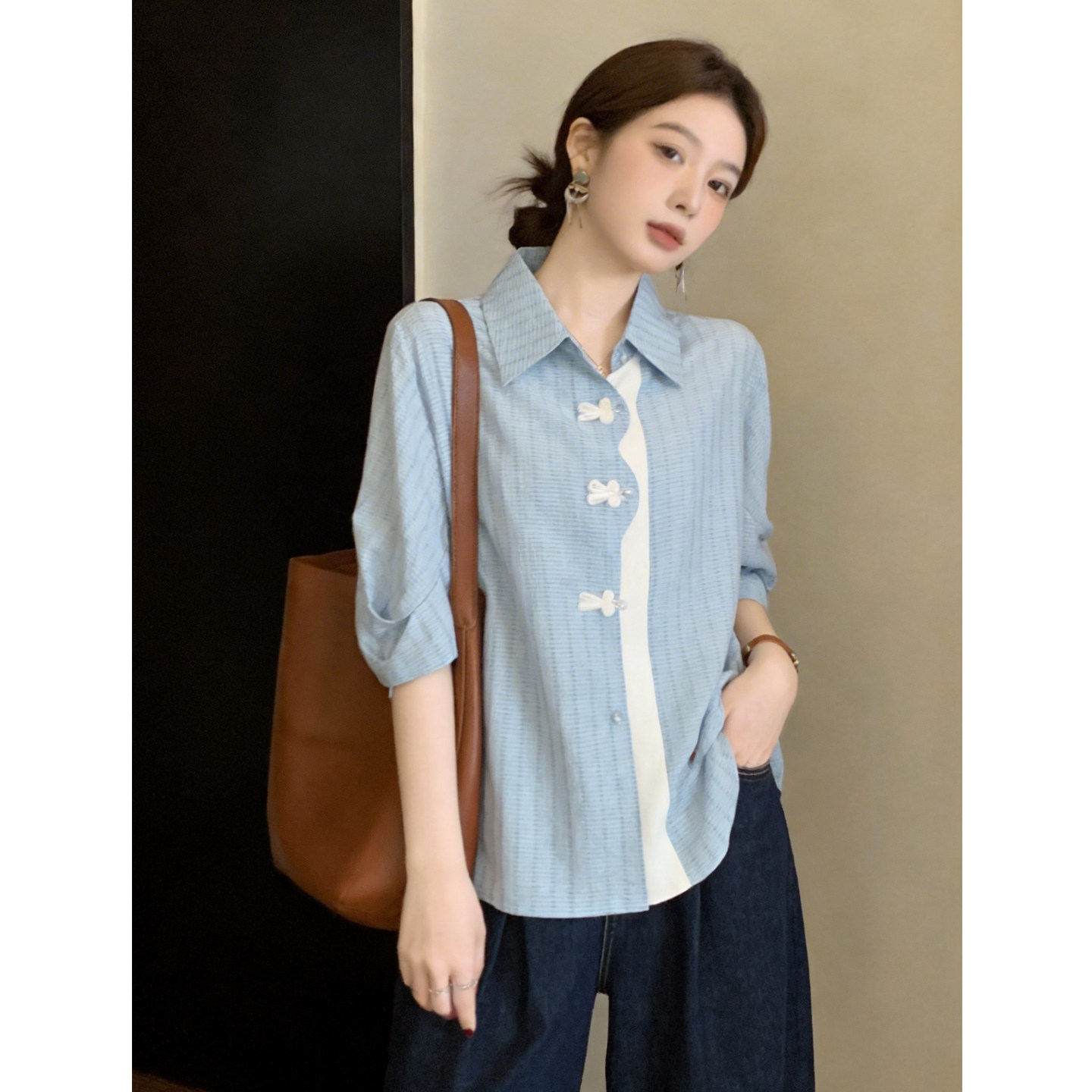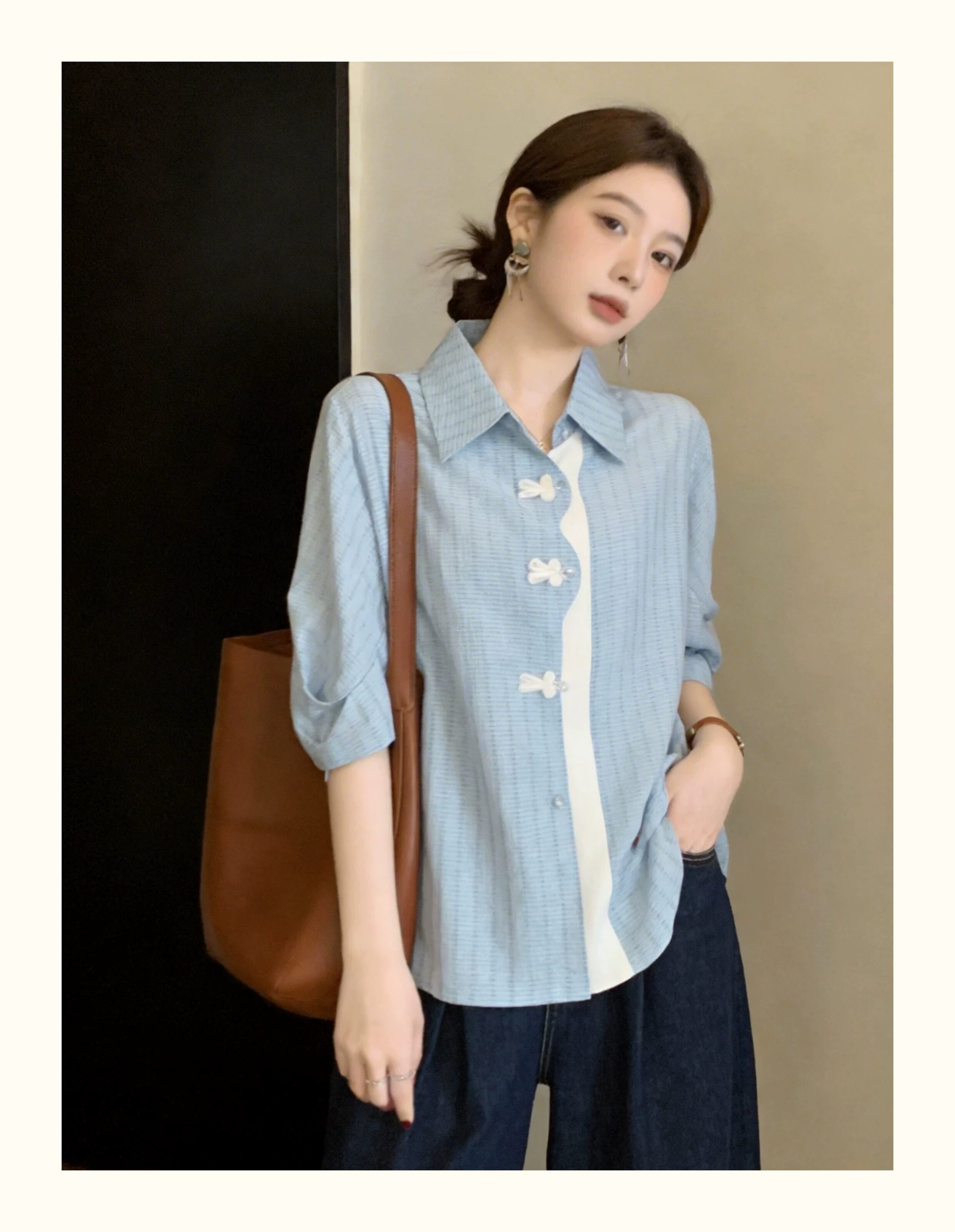 慵懒休闲风蓝色条纹翻领短袖衬衫女夏季微胖大码宽松显瘦百搭上衣