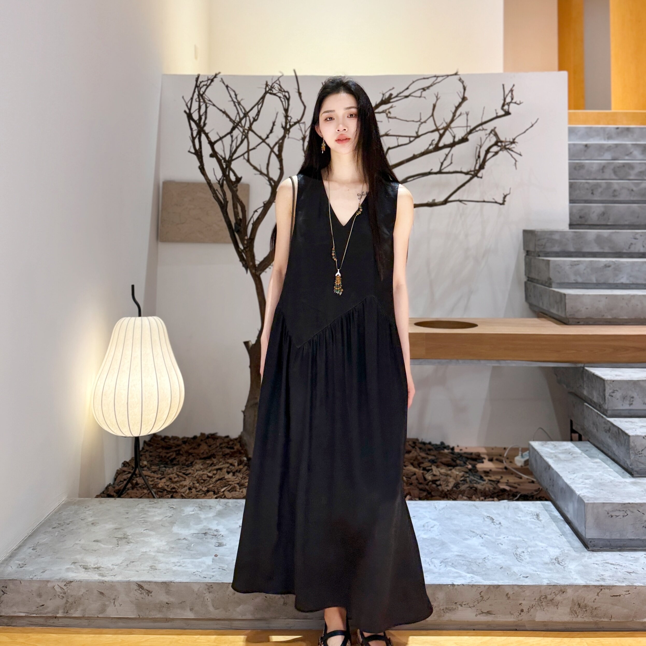 时光滤镜丨100桑蚕丝重缎香云纱丨莨绸真丝V领松弛感连衣裙-6862