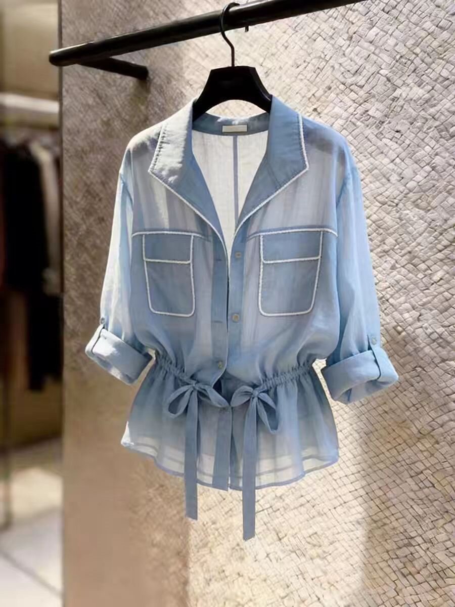 超好看时尚蓝色衬衫女抽绳收腰轻奢风气质上衣别致2026年新款