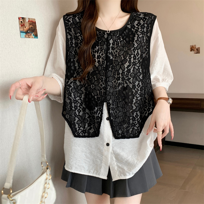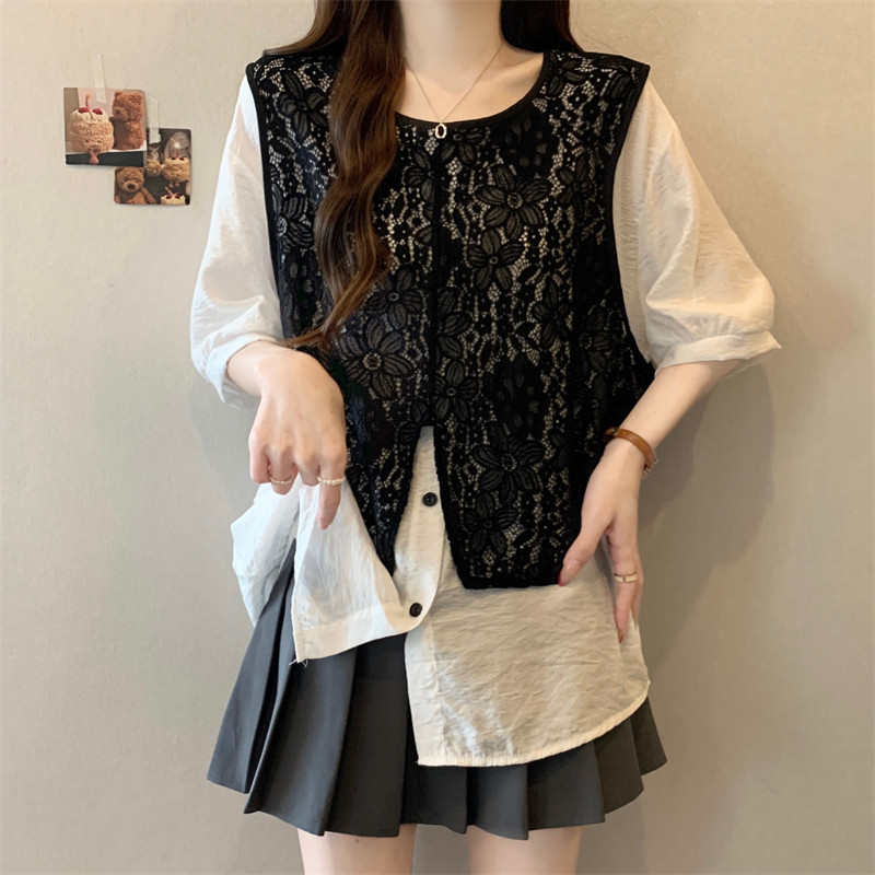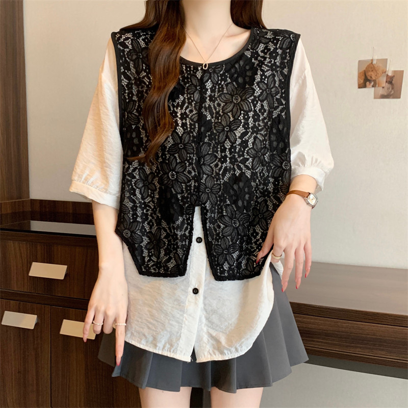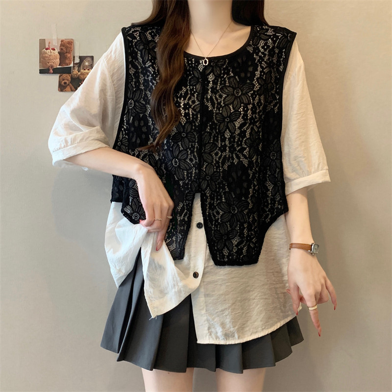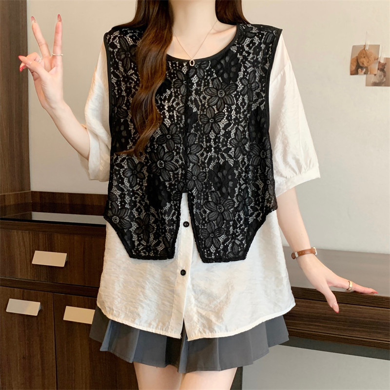 假两件蕾丝镂空正肩短袖衬衫女2026夏季大码胖mm宽松洋气减龄上衣