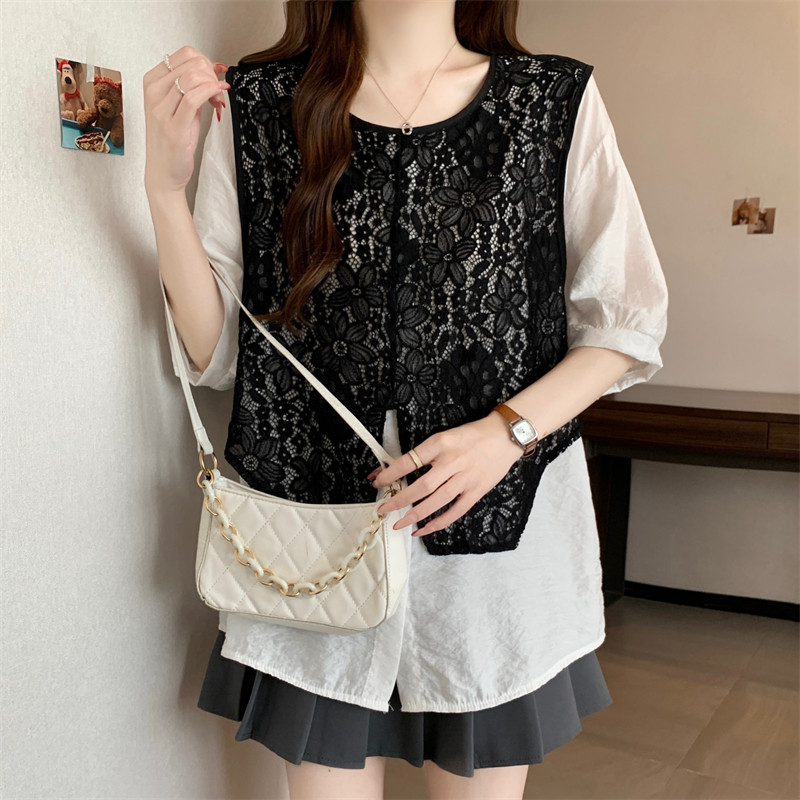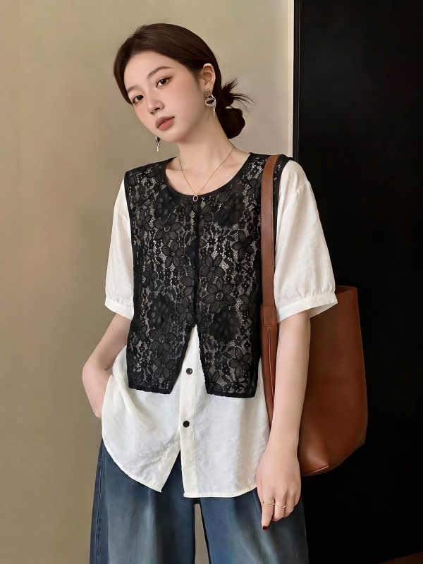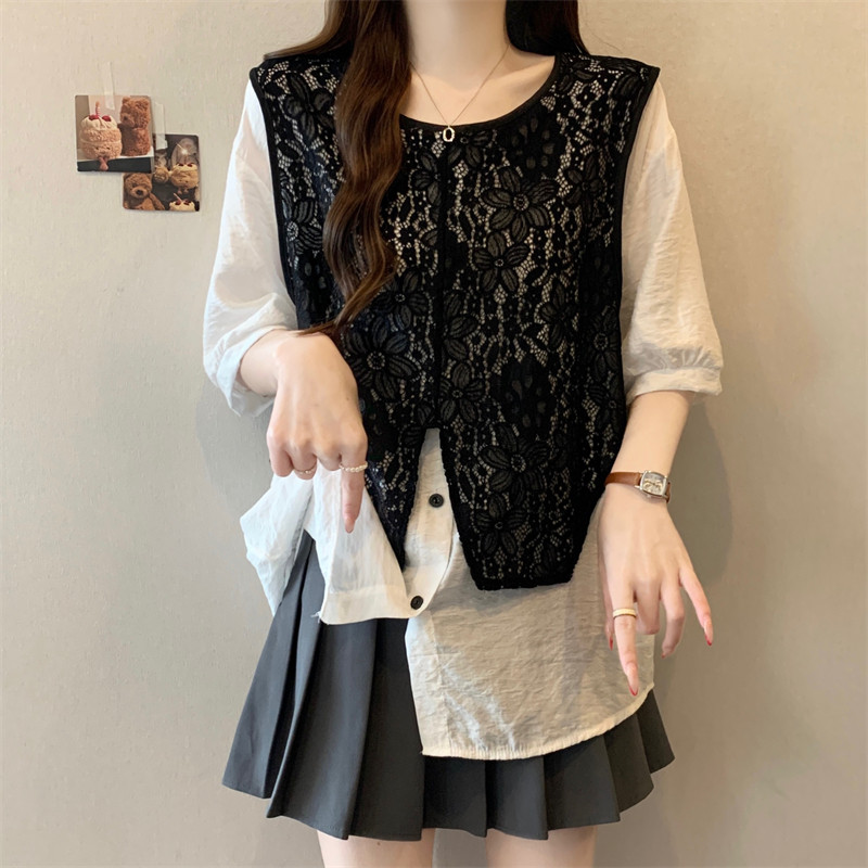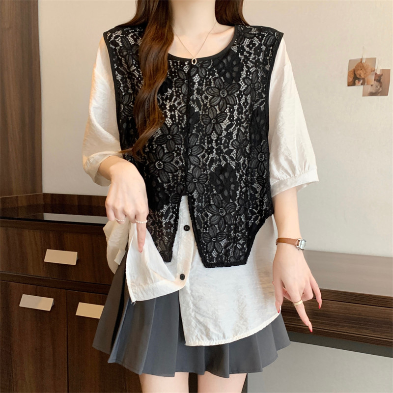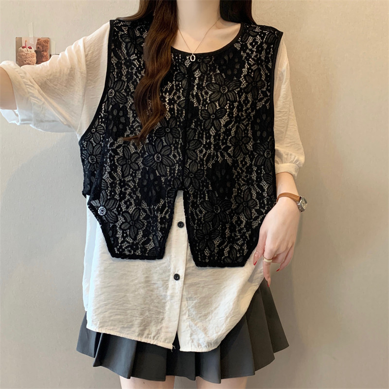 假两件蕾丝镂空正肩短袖衬衫女2026夏季大码胖mm宽松洋气减龄上衣