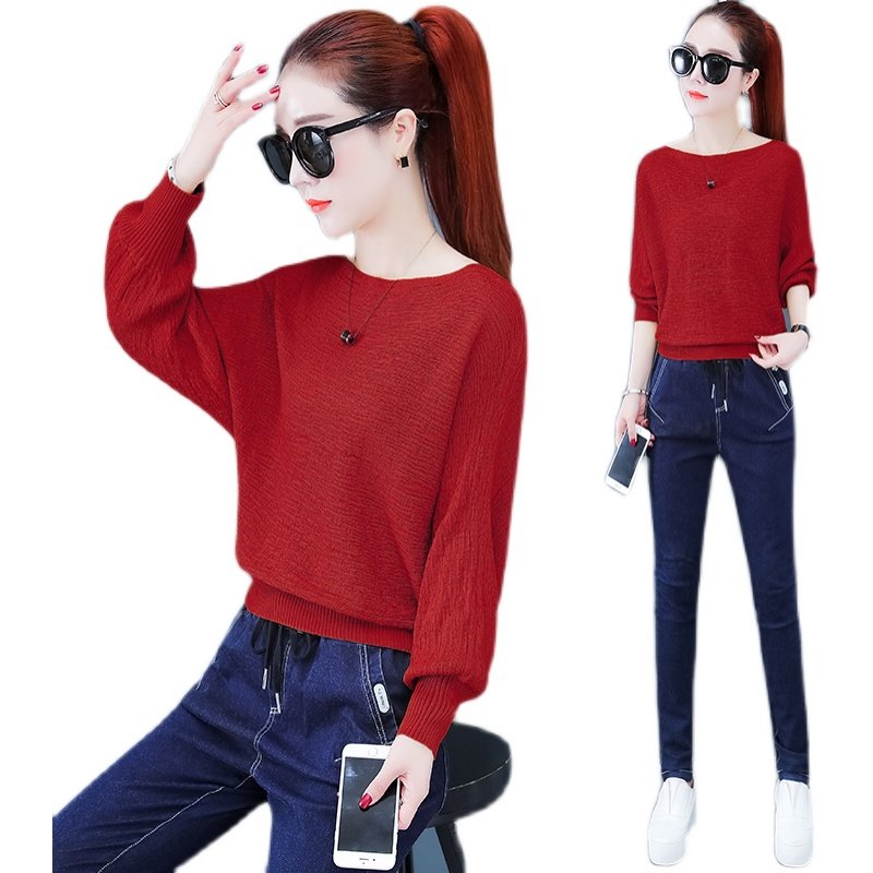 HomeProducts一字肩蝙蝠袖t恤女针织打底衫新款秋冬装遮肚百搭洋气质女士上衣