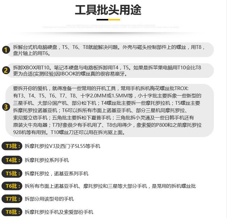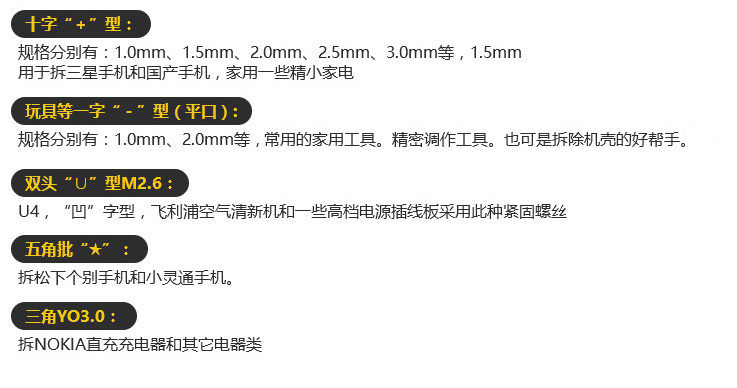 规格:六角T3、六角T4、六角T5、六角T6、五星0.8、十字1.5、十字2.0、一字2.0等