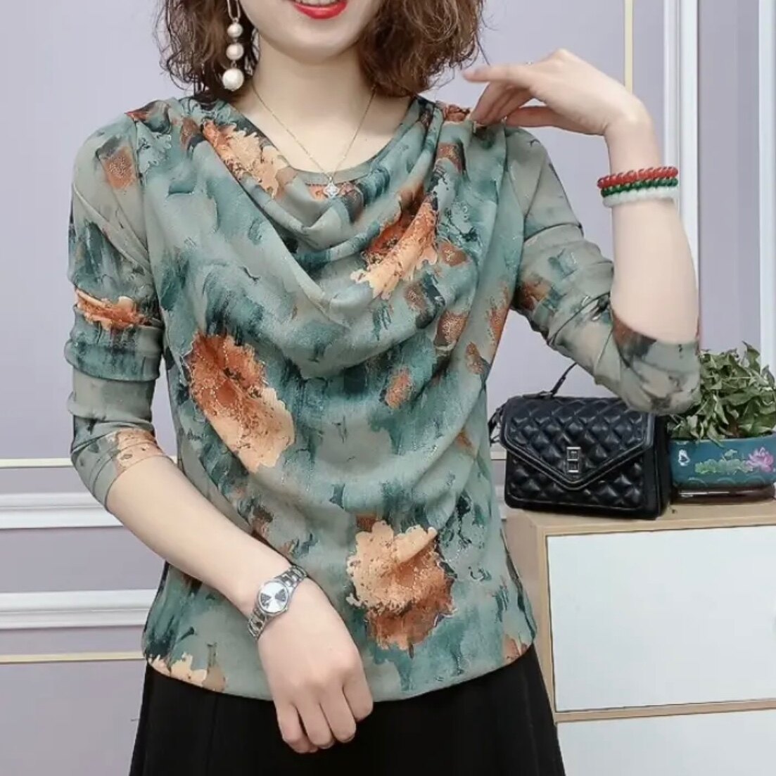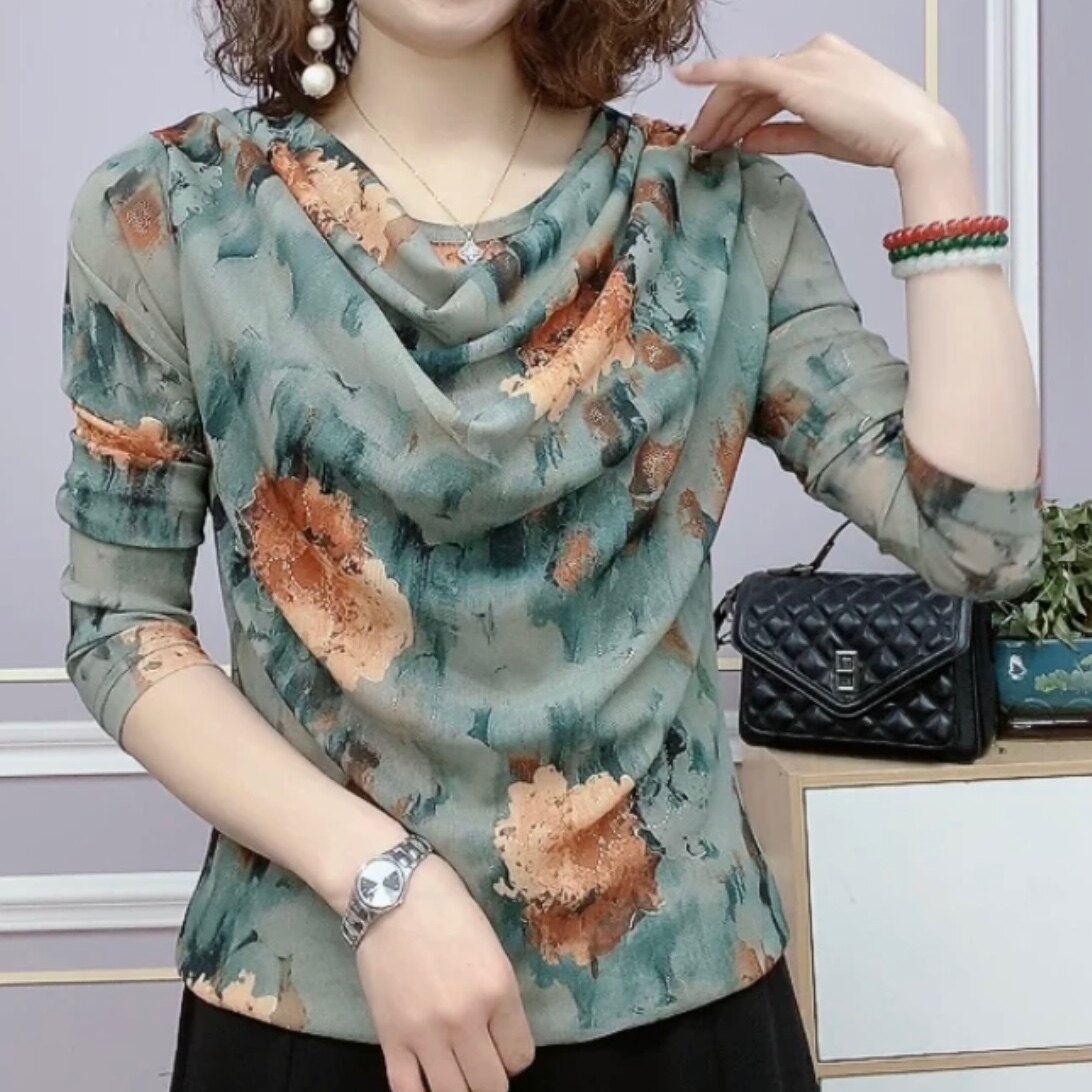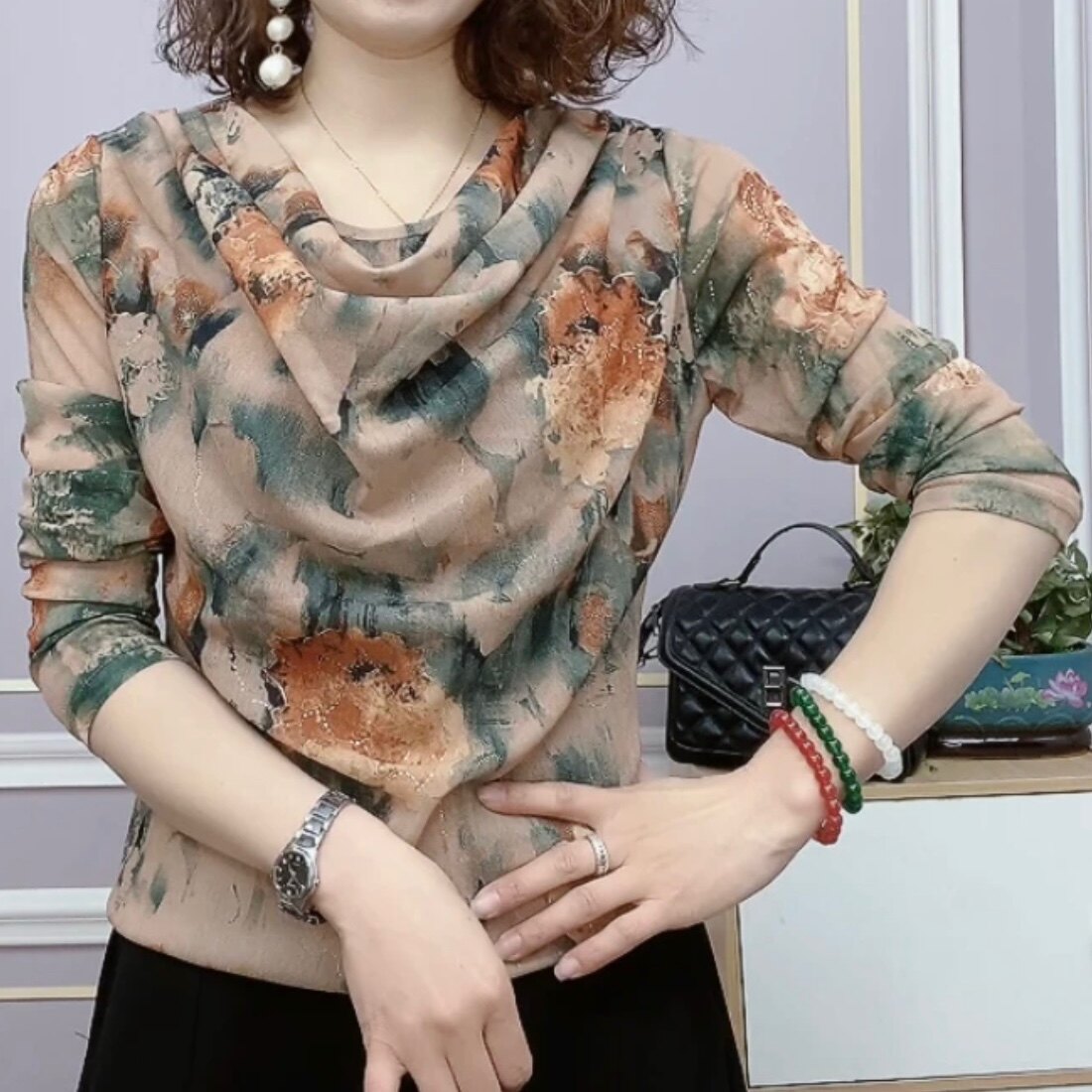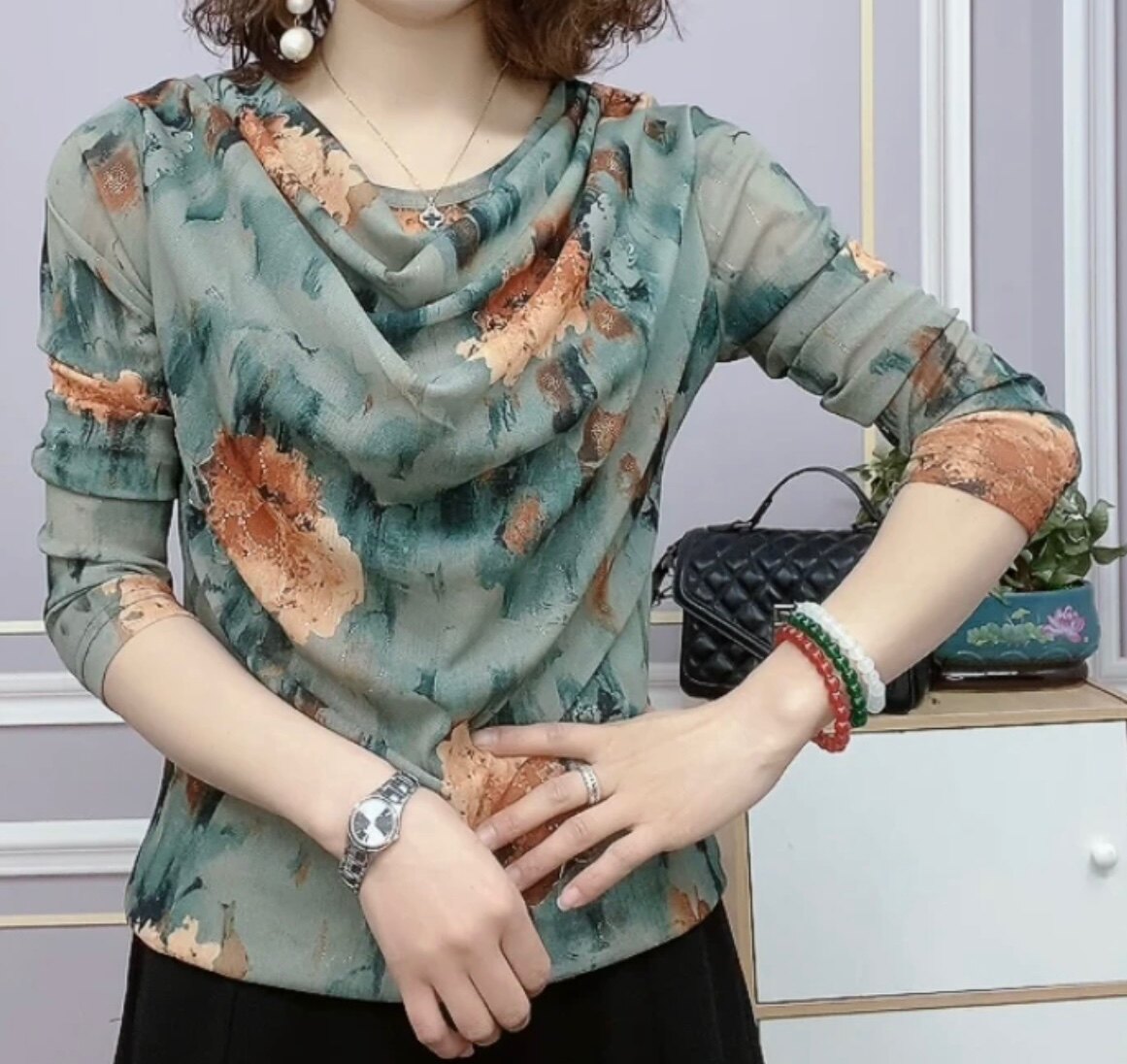 2026春秋新款网纱圆领堆堆领时尚洋气百搭T恤打底衫印花上衣