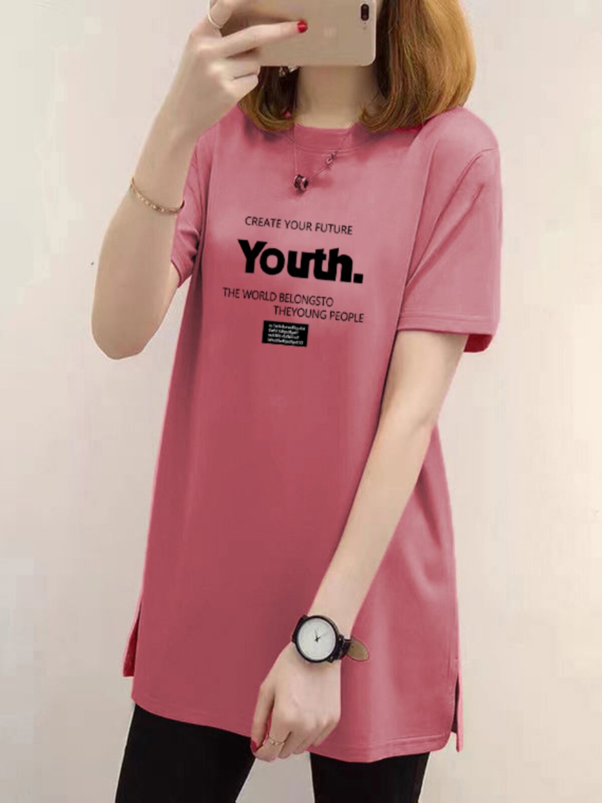 HomeProducts夏季100%纯棉中长款短袖t恤女时尚宽松显瘦大码女装休闲开叉上衣