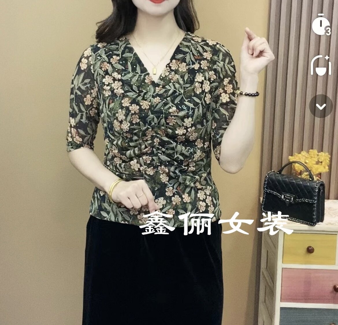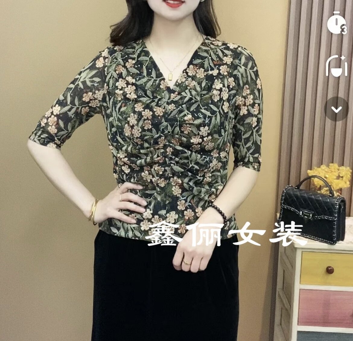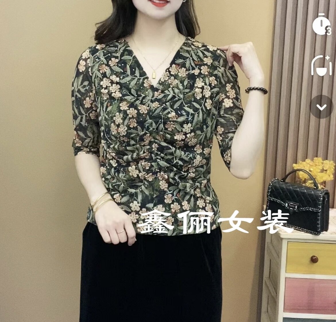 2026夏季弹力网纱洋气提花中老年V领短袖上衣时尚碎花妈妈装T恤衫