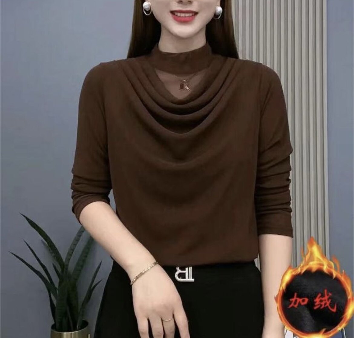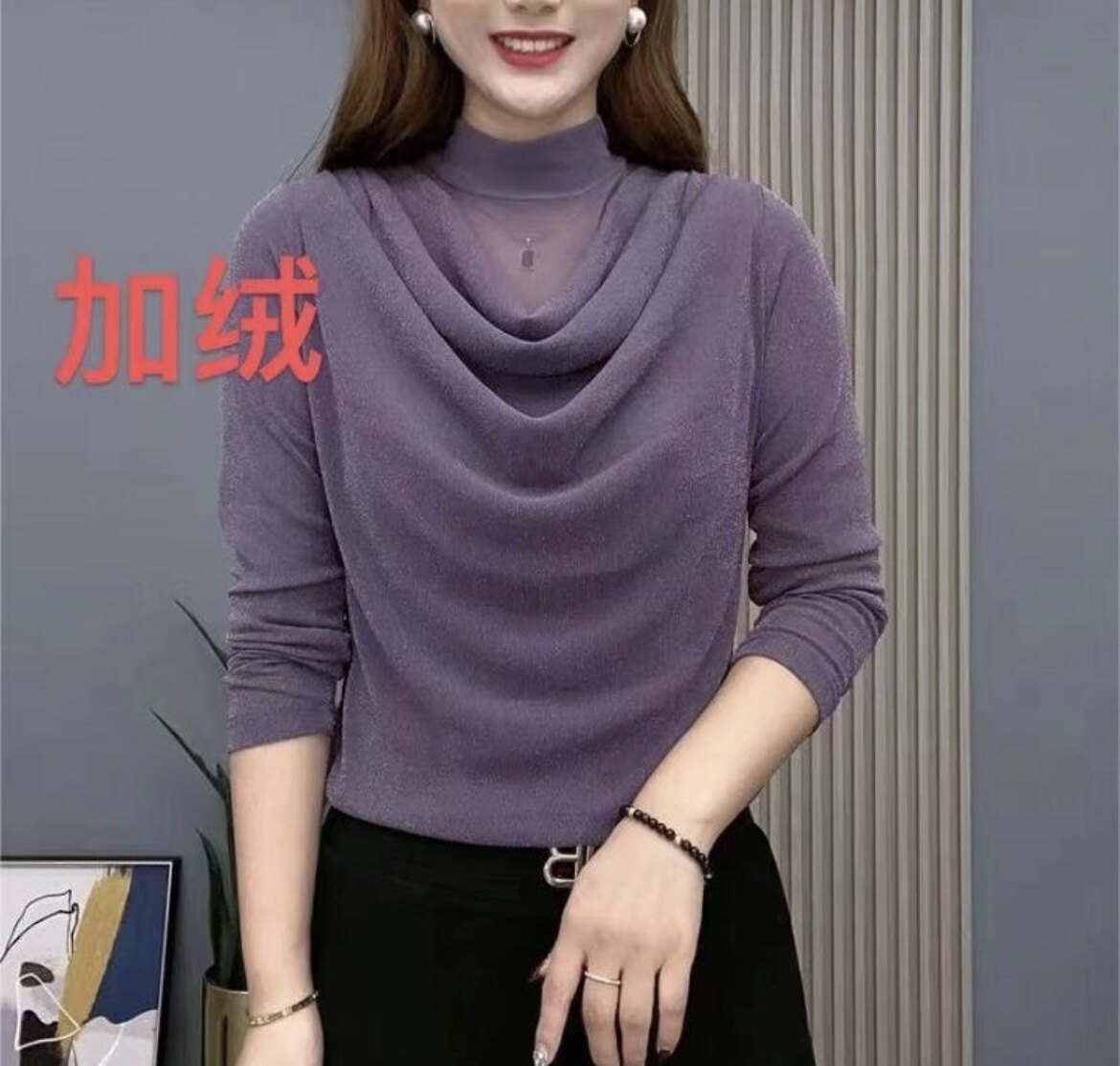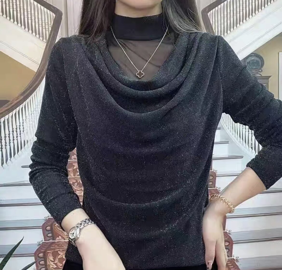 2026春秋新品时尚妈妈装网纱亮晶高领长袖上衣T恤纯色百搭打底衫