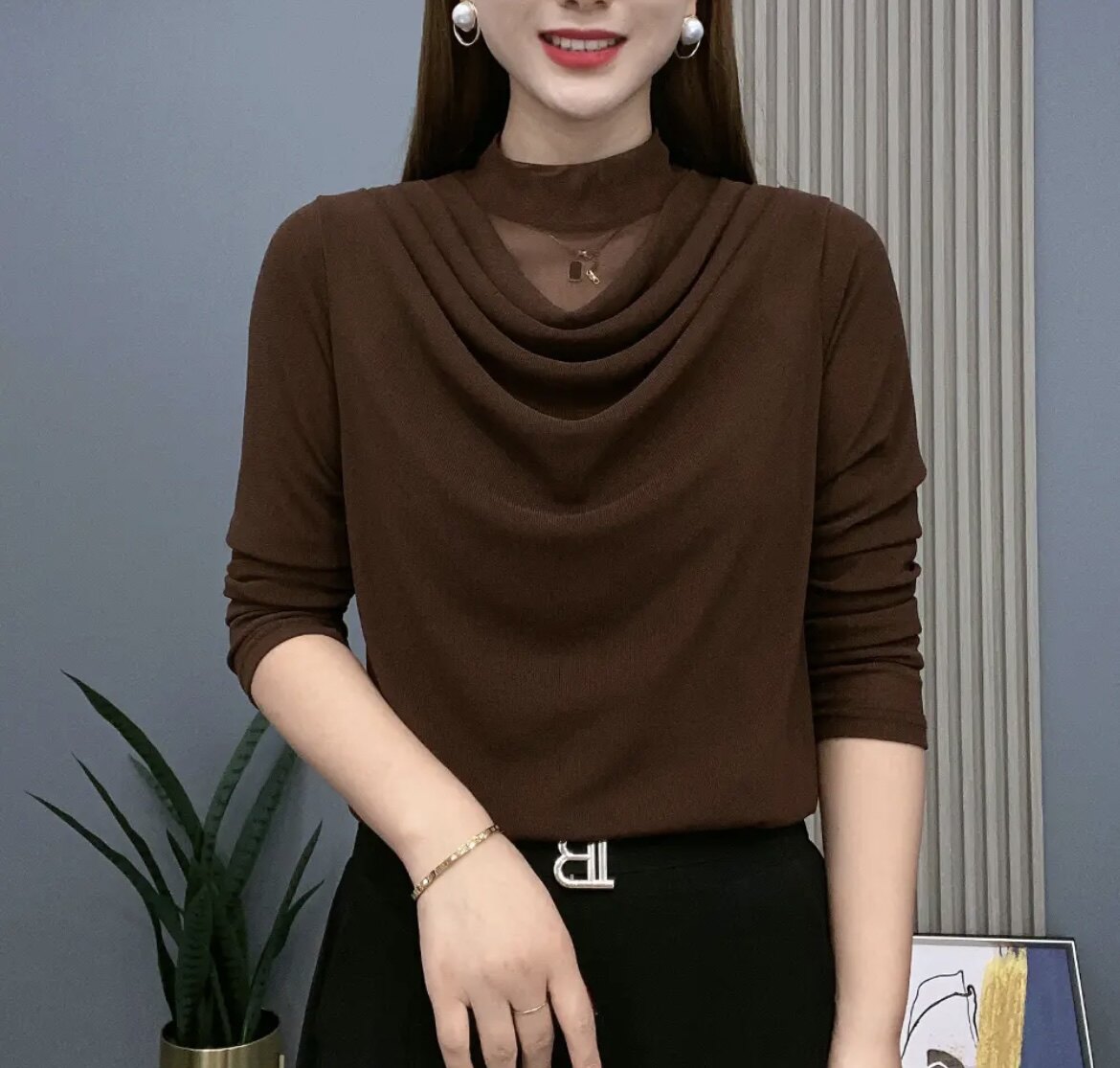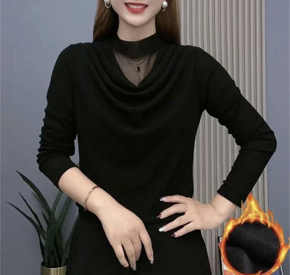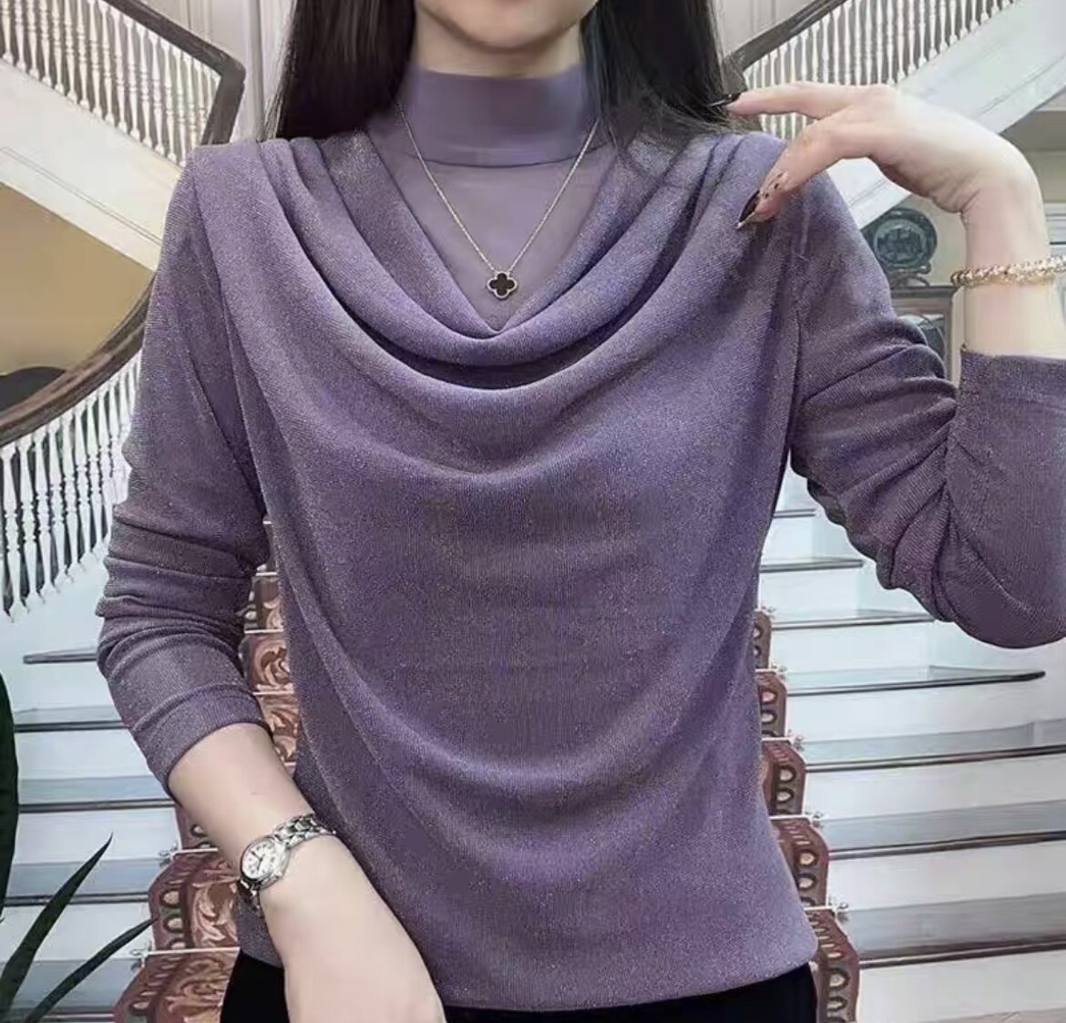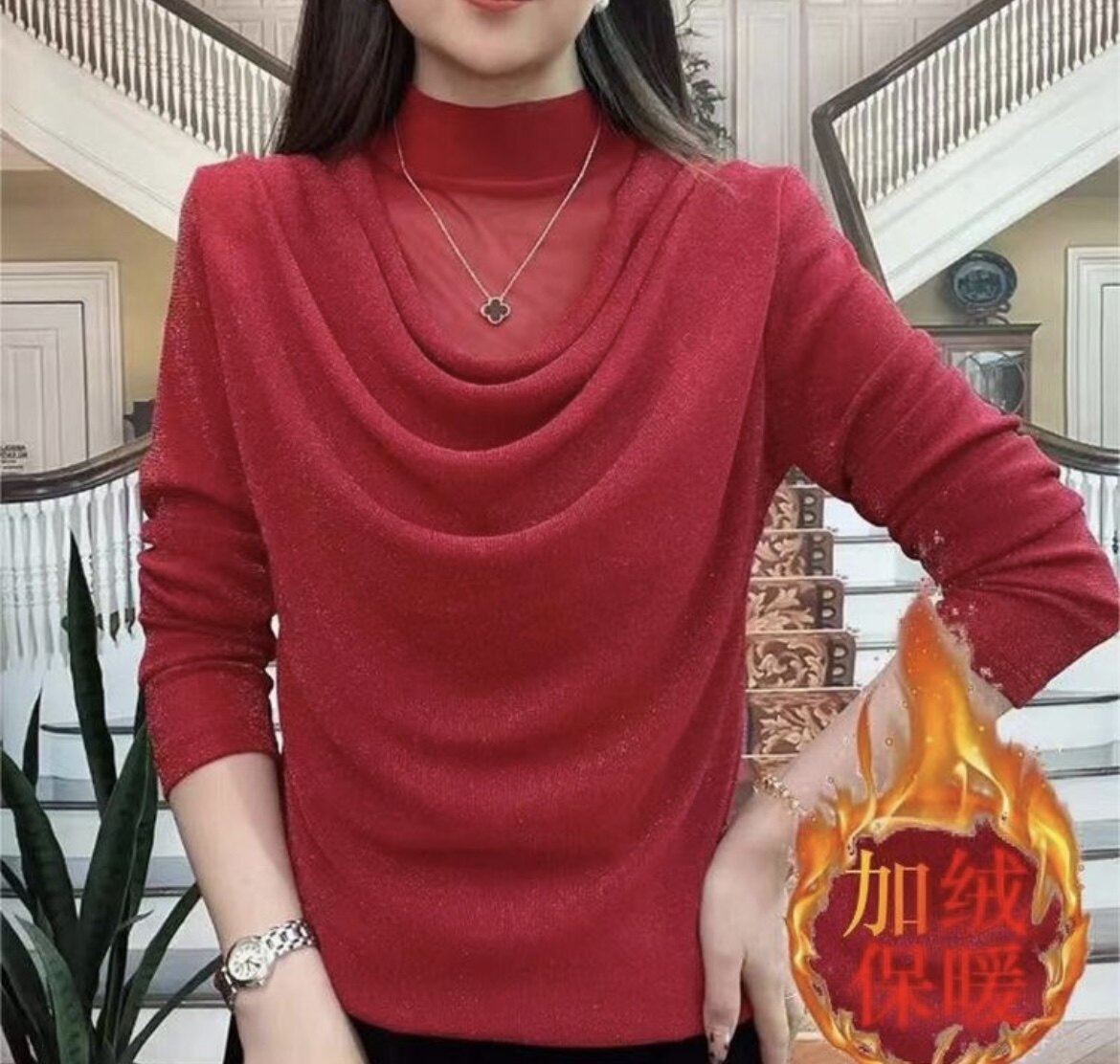 2026春秋新品时尚妈妈装网纱亮晶高领长袖上衣T恤纯色百搭打底衫