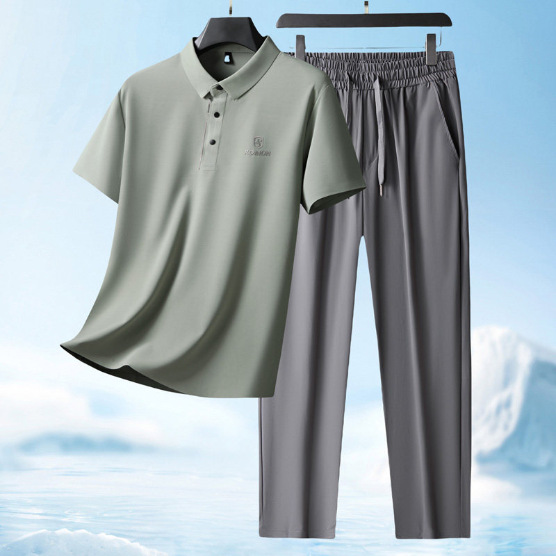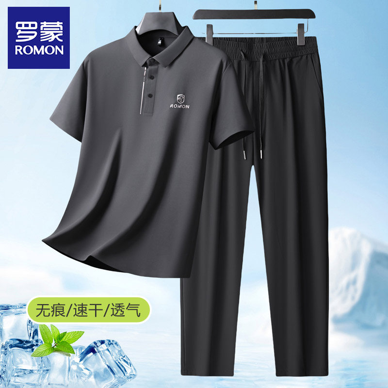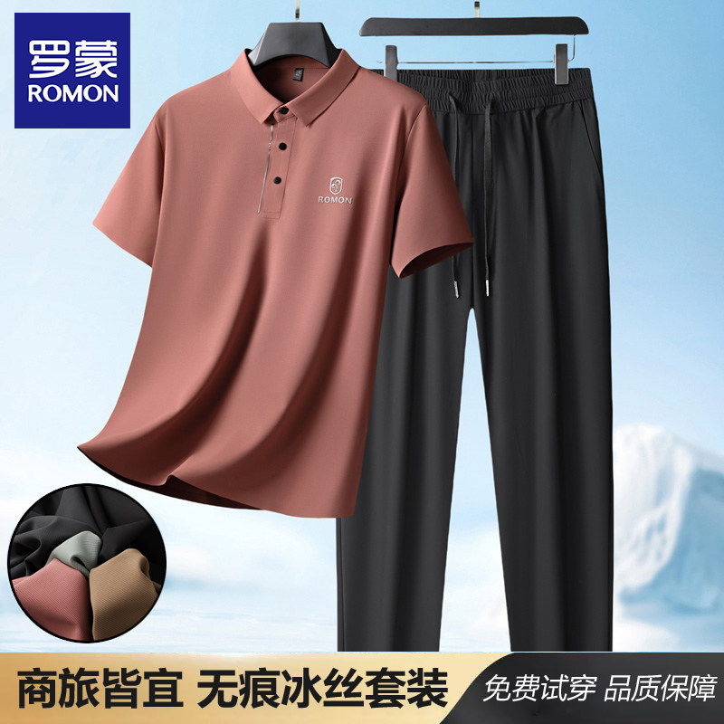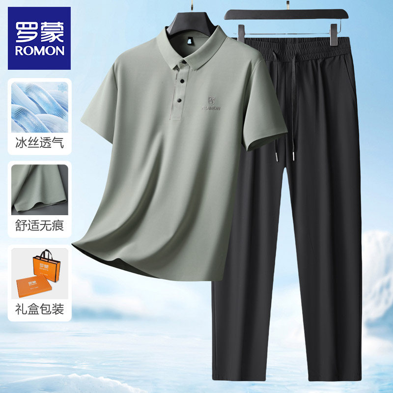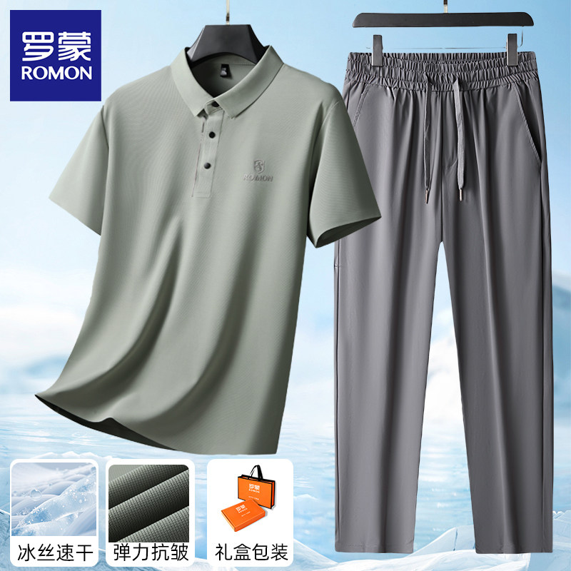 罗蒙夏季爸爸套装短袖T恤男士+冰丝裤子2026新款父亲婚宴装两件套
