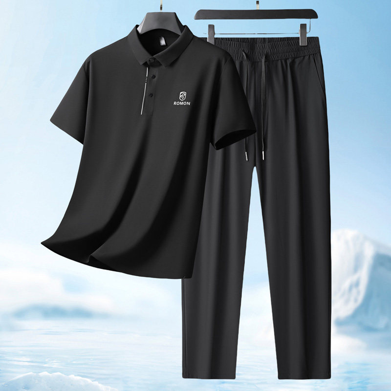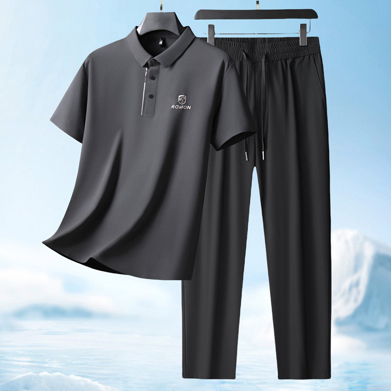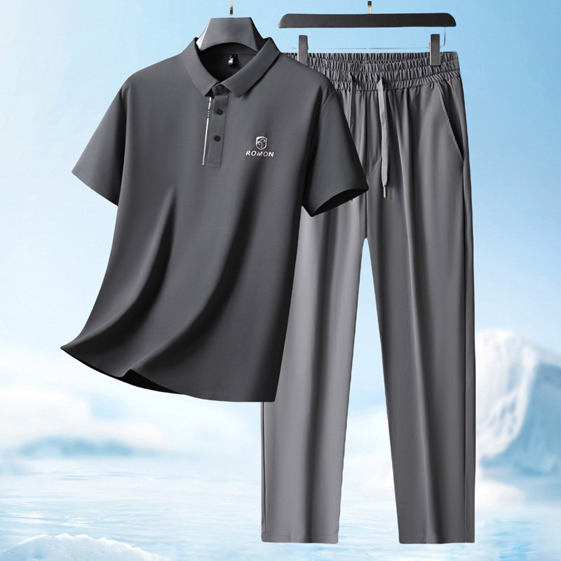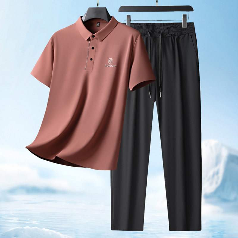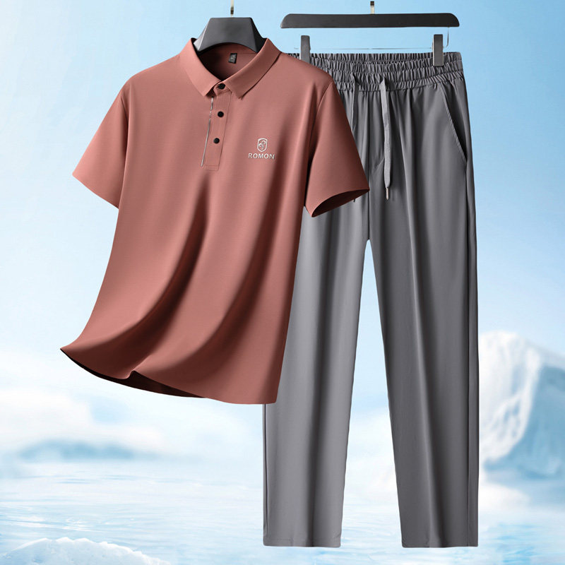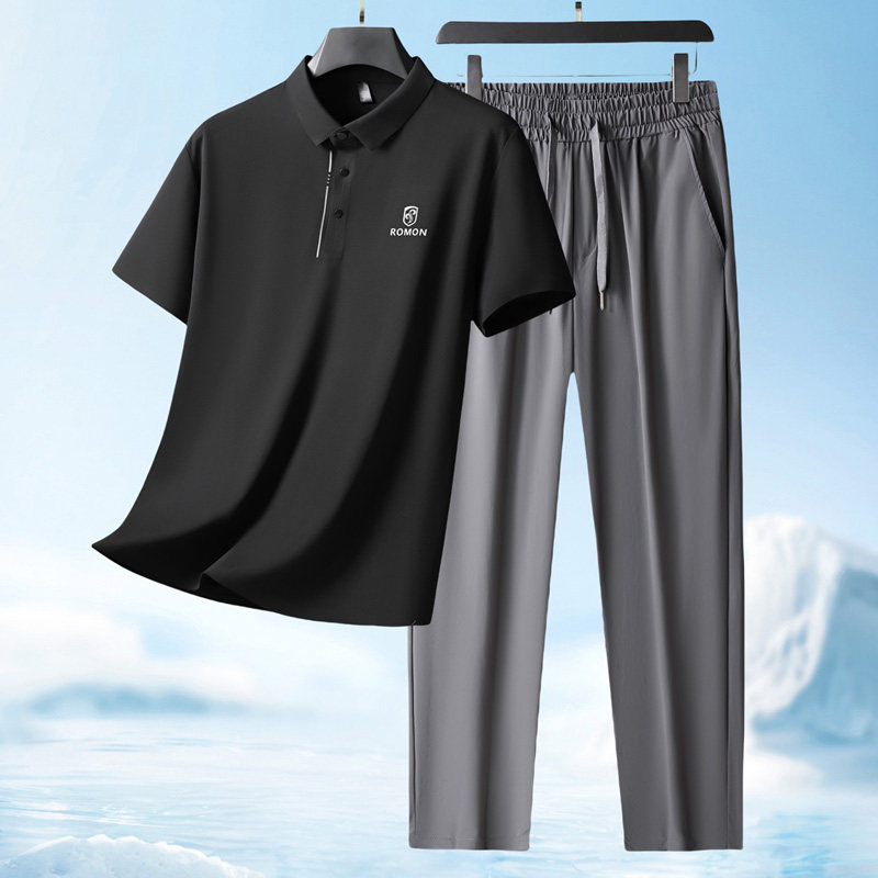 罗蒙夏季爸爸套装短袖T恤男士+冰丝裤子2026新款父亲婚宴装两件套