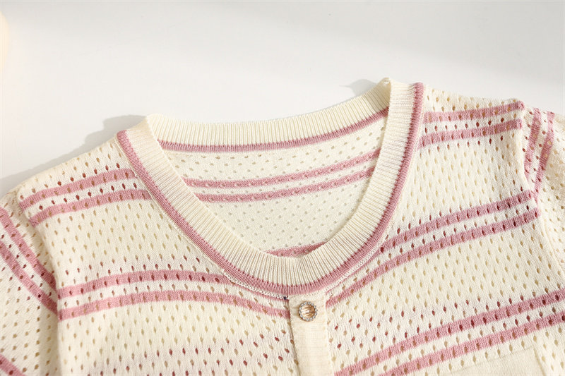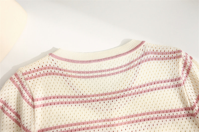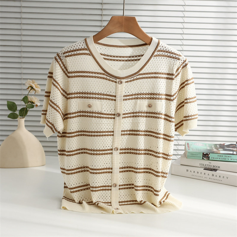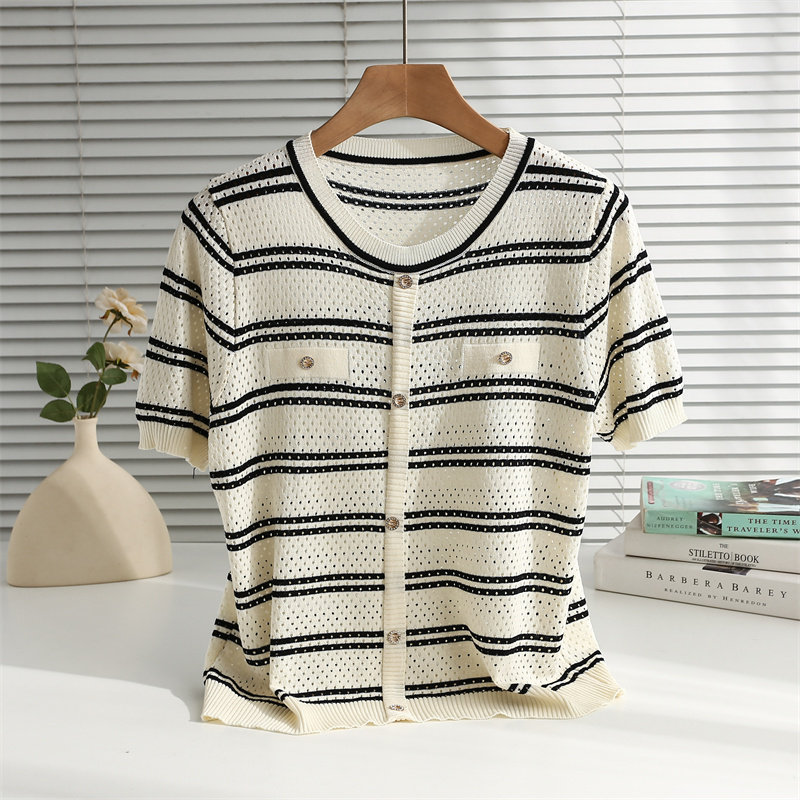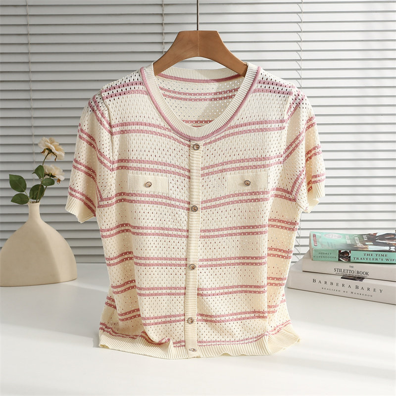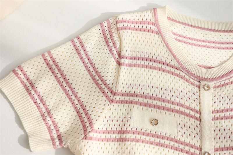 条纹针织短袖女2026夏装新款冰丝针织衫宽松上衣T恤小香风薄