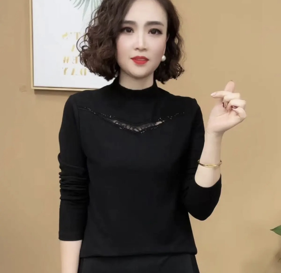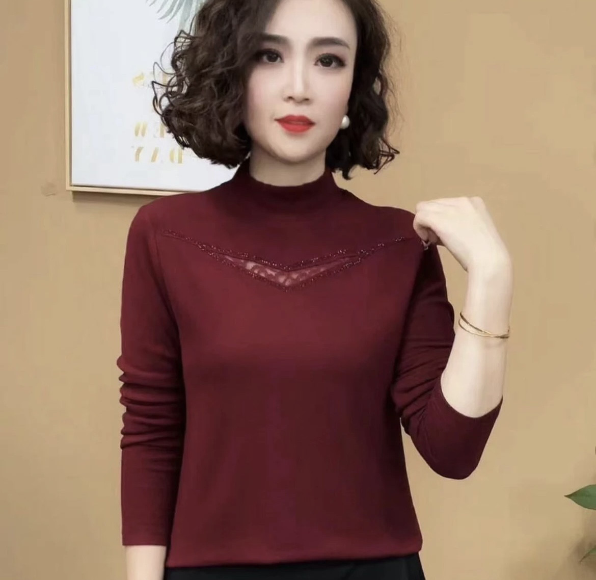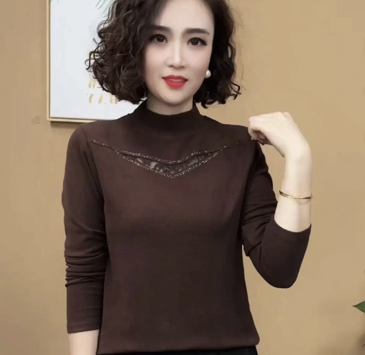 HomeProducts2026秋冬新款半高领镂空烫钻百搭洋气气质时尚加绒显瘦长袖小衫女