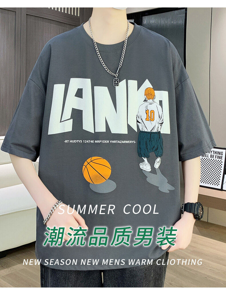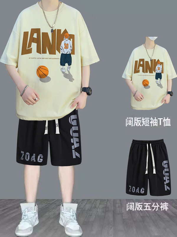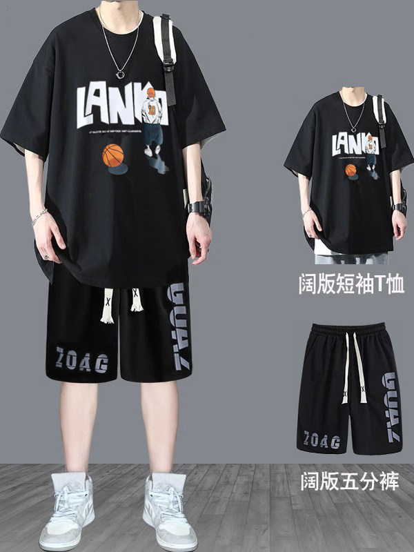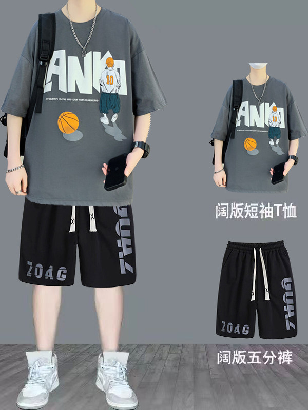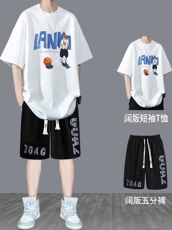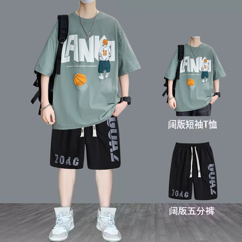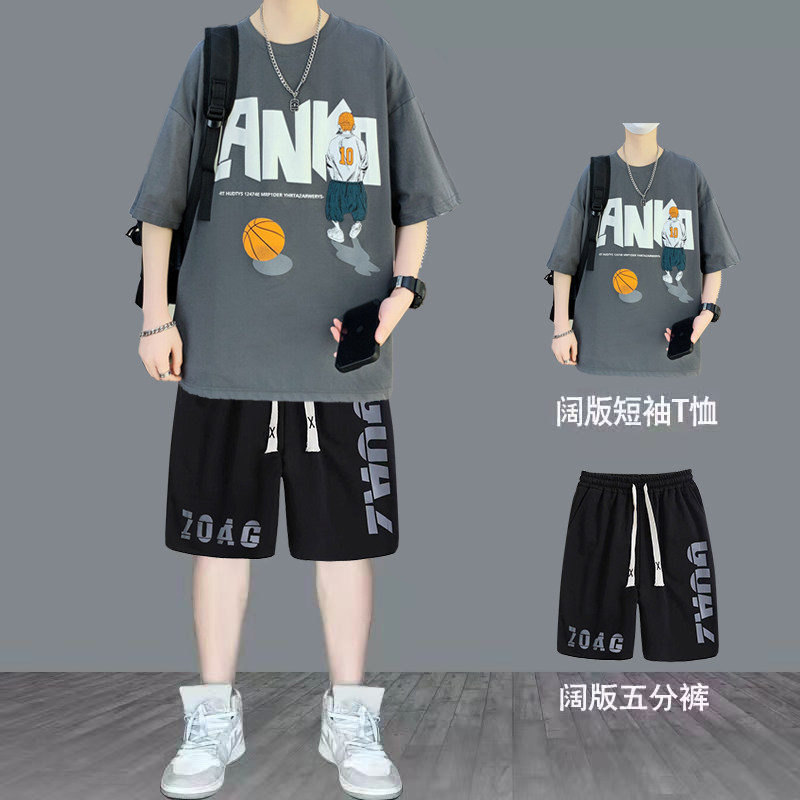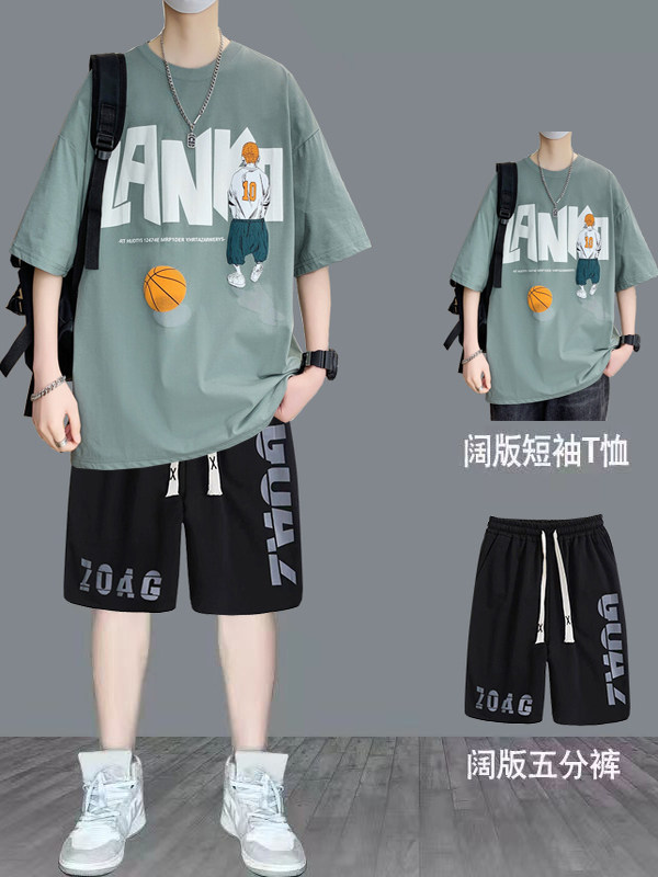 纯棉短袖男夏季新款宽松印花半袖体恤学生潮流百搭上衣T恤套装