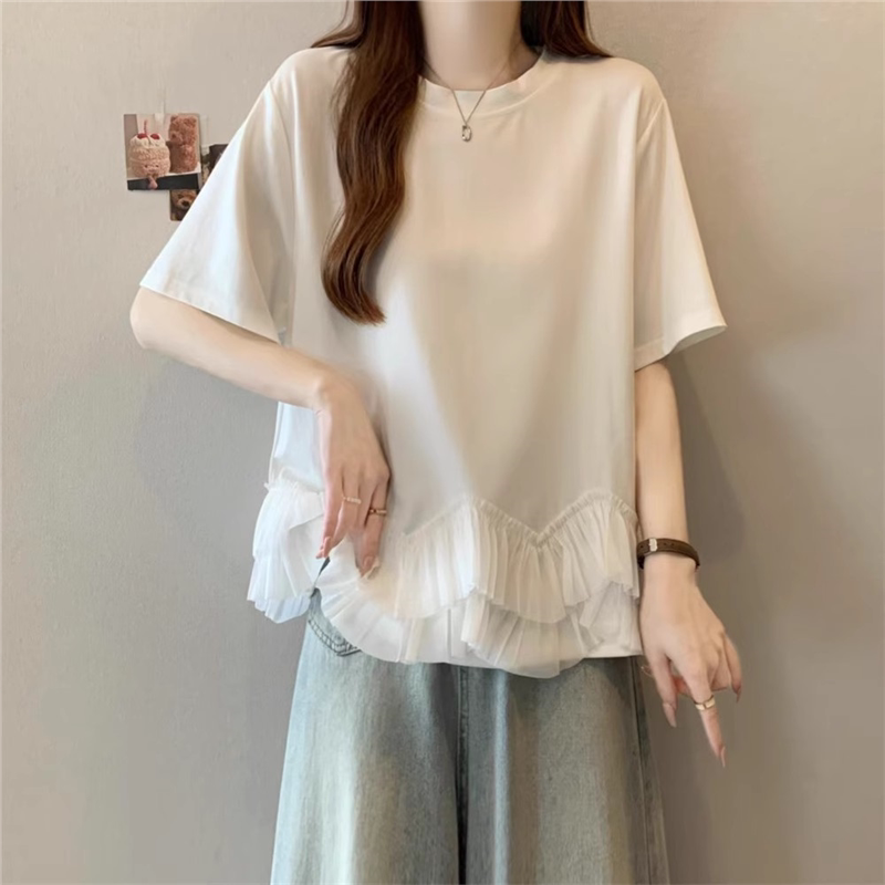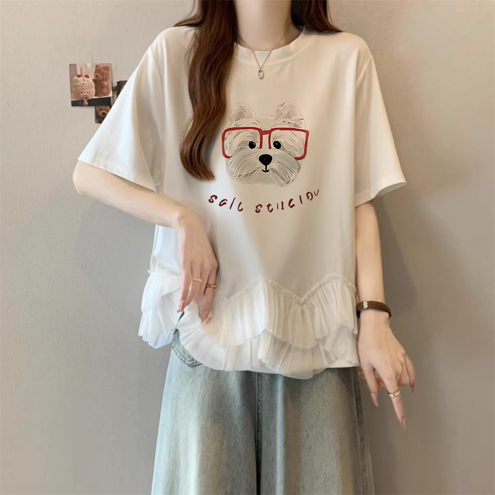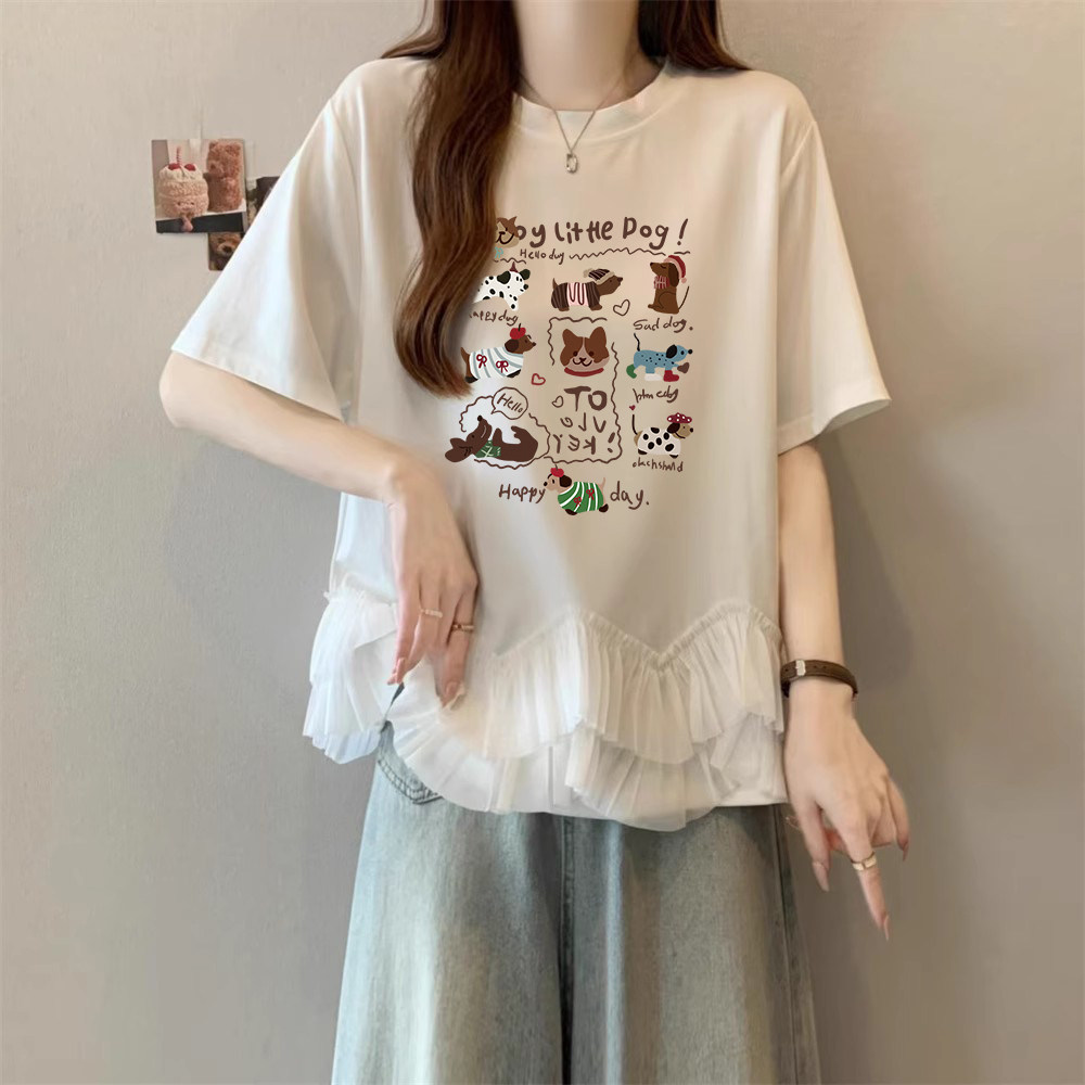 可爱卡通小狗印花正肩短袖t恤女时尚网纱百搭设计感洋气小众上衣