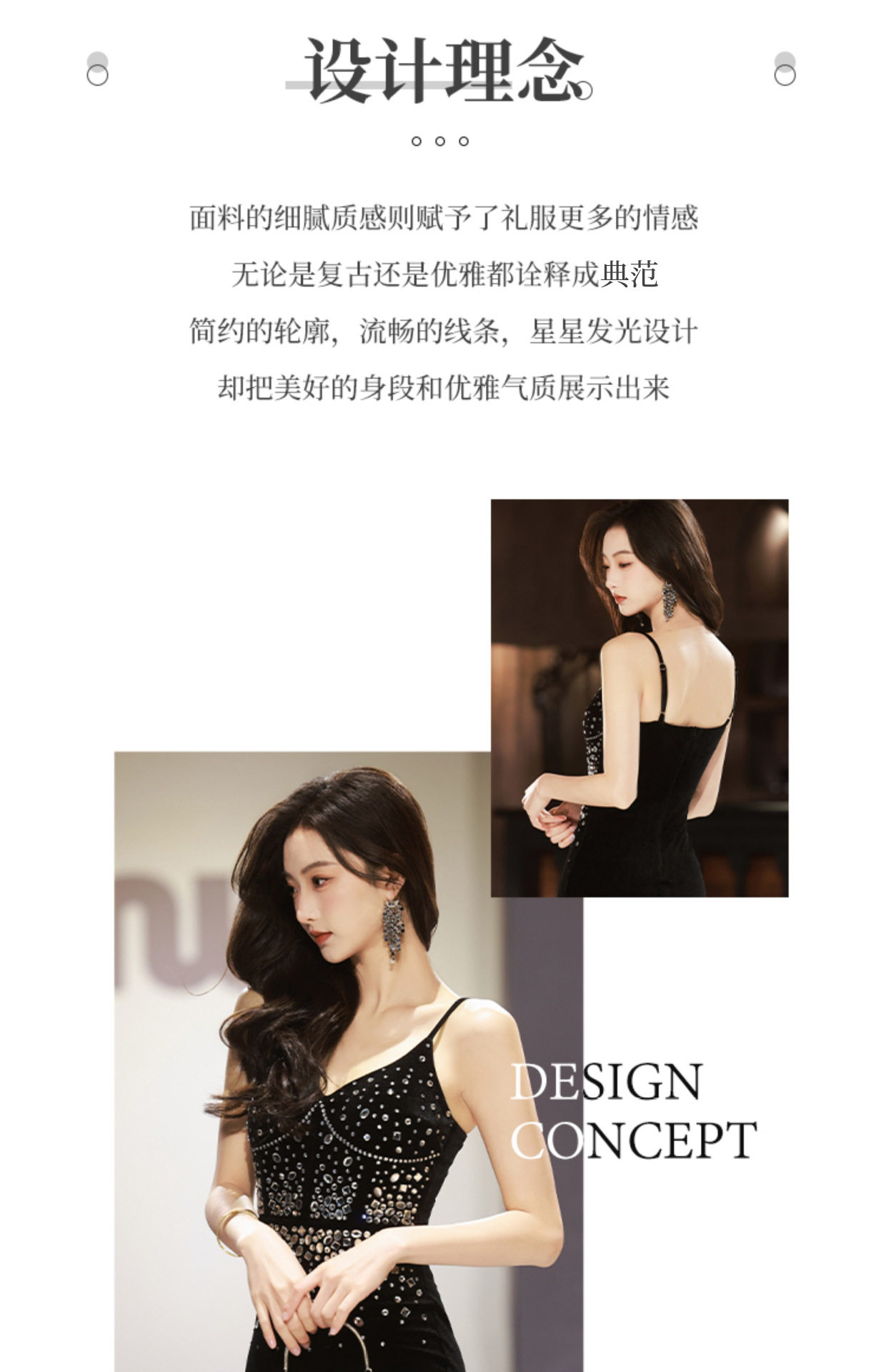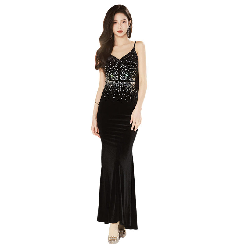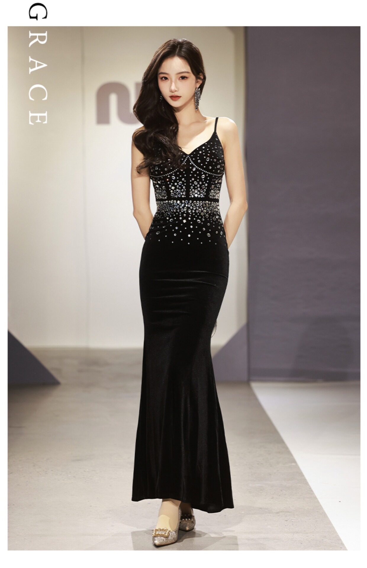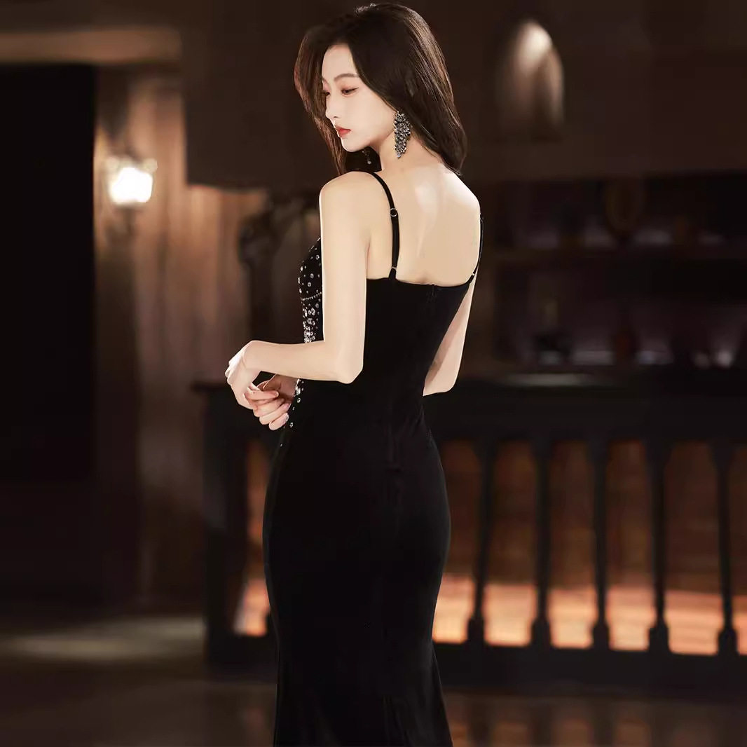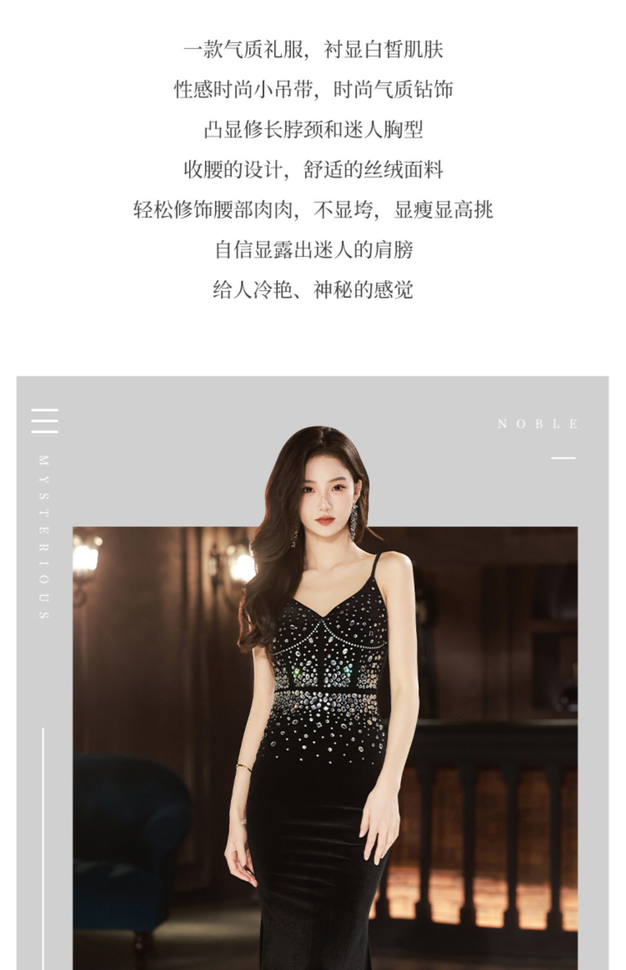 黑色丝绒生日晚礼服轻奢小众时尚 毕业宴会主持人遮肚鱼尾连衣裙