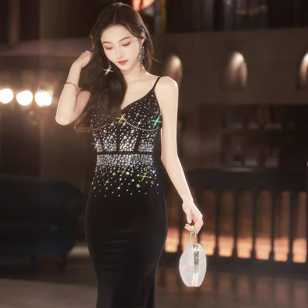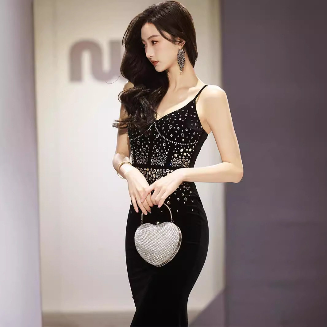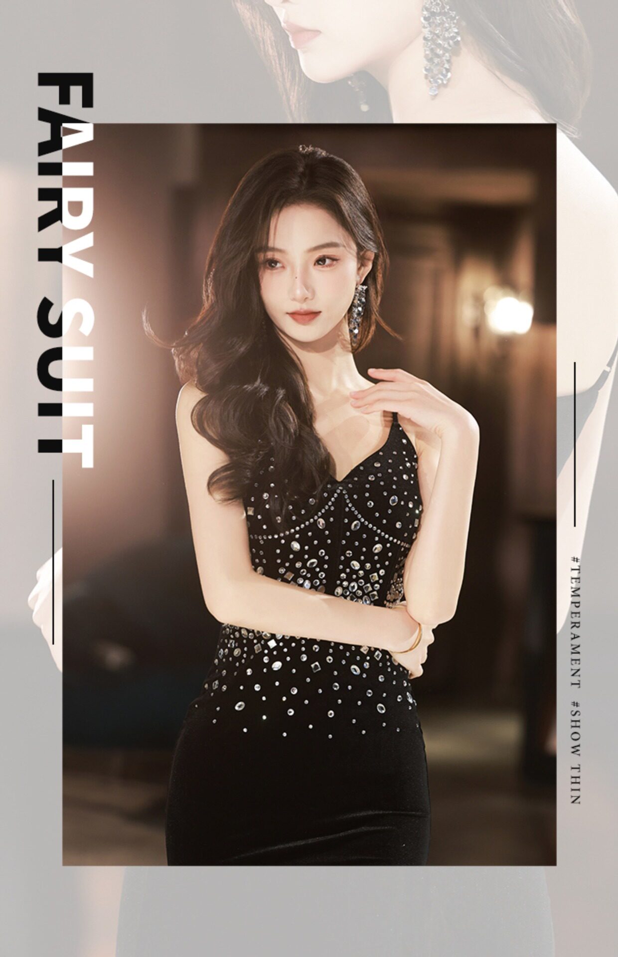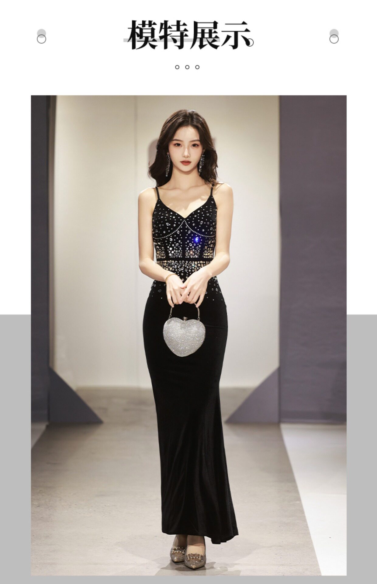 黑色丝绒生日晚礼服轻奢小众时尚 毕业宴会主持人遮肚鱼尾连衣裙