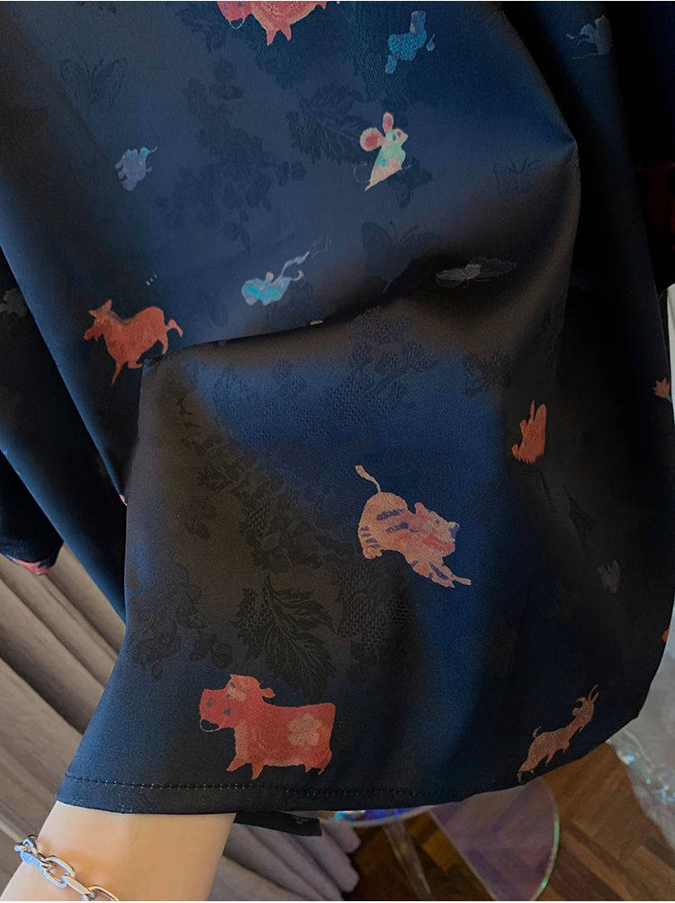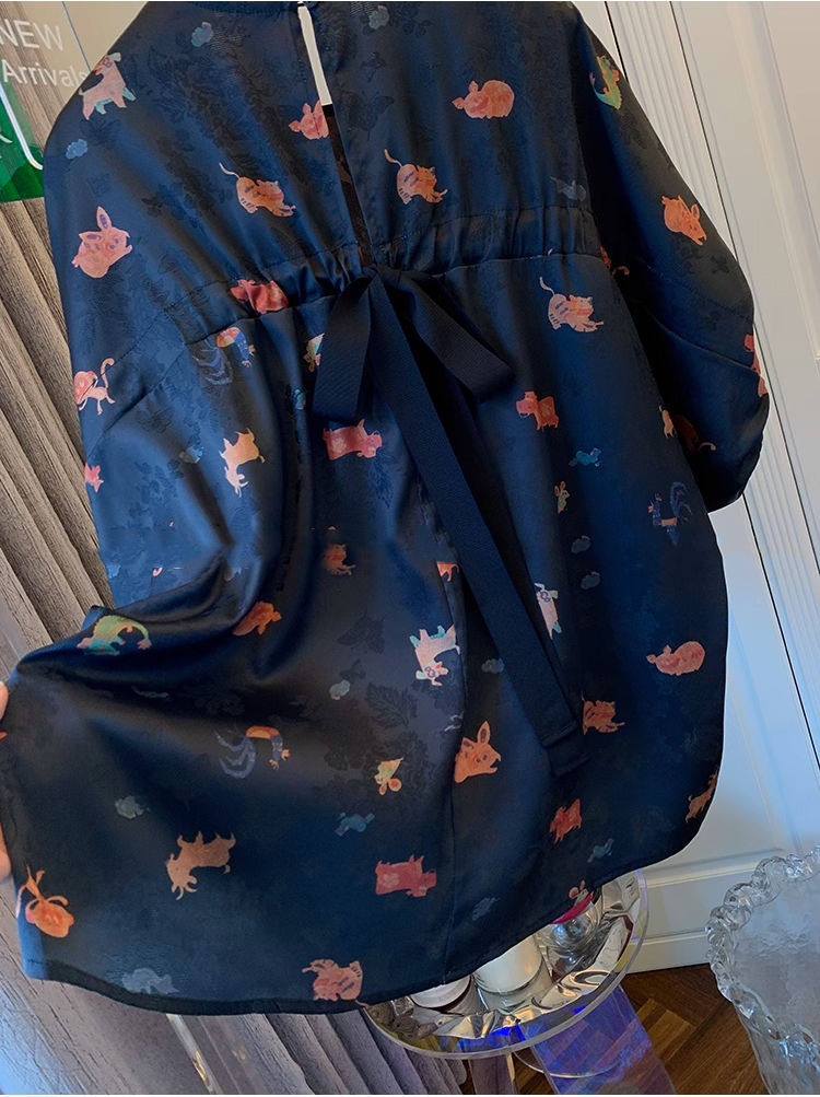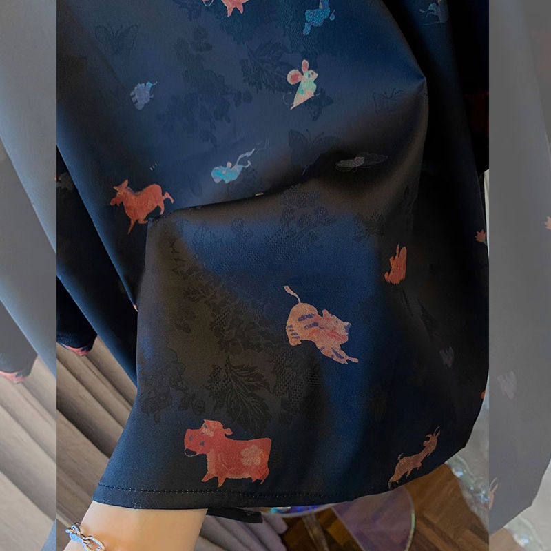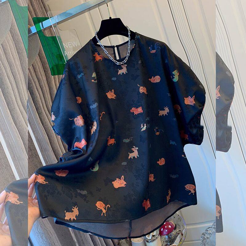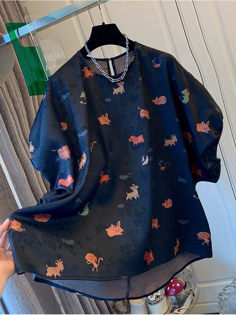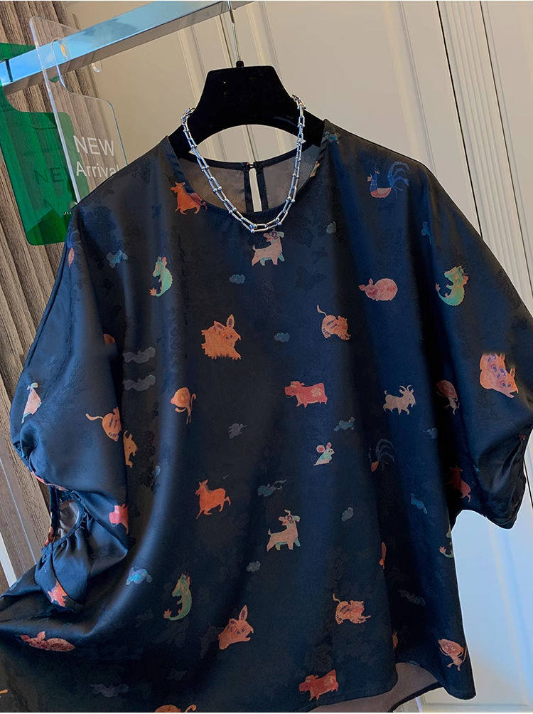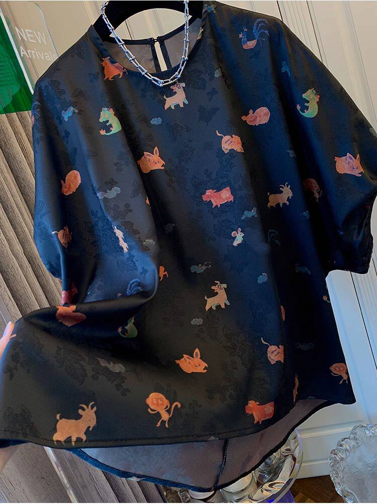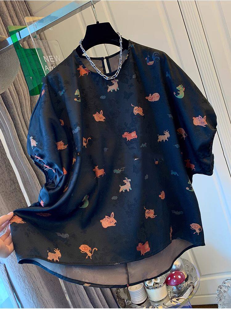HomeProducts新中式别致独特印花半开领大码衬衫女宽松短袖显瘦气质高级上衣