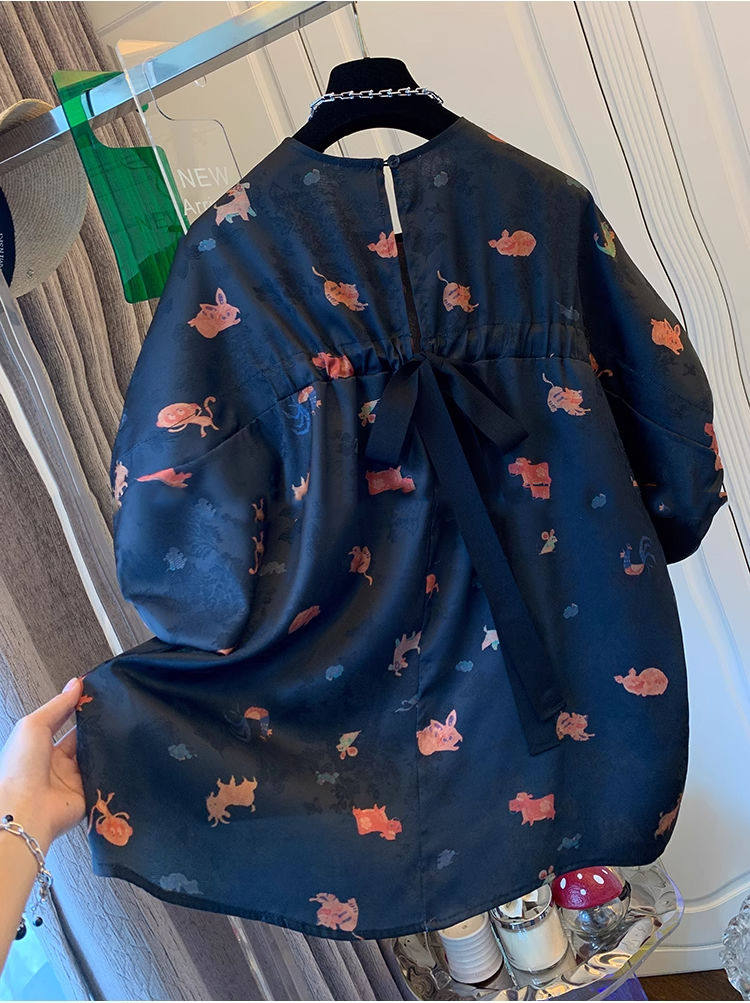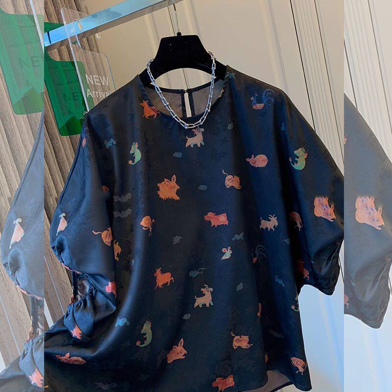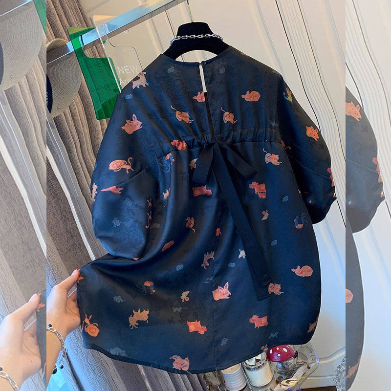 新中式别致独特印花半开领大码衬衫女宽松短袖显瘦气质高级上衣