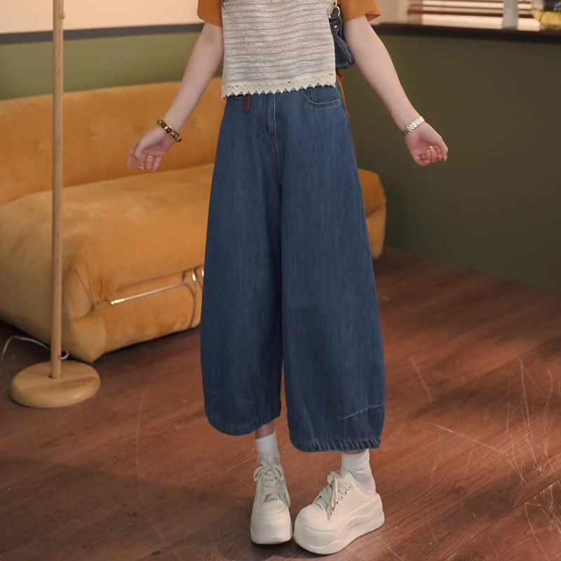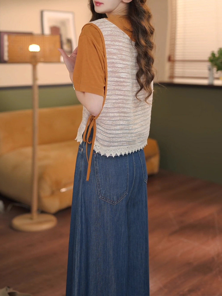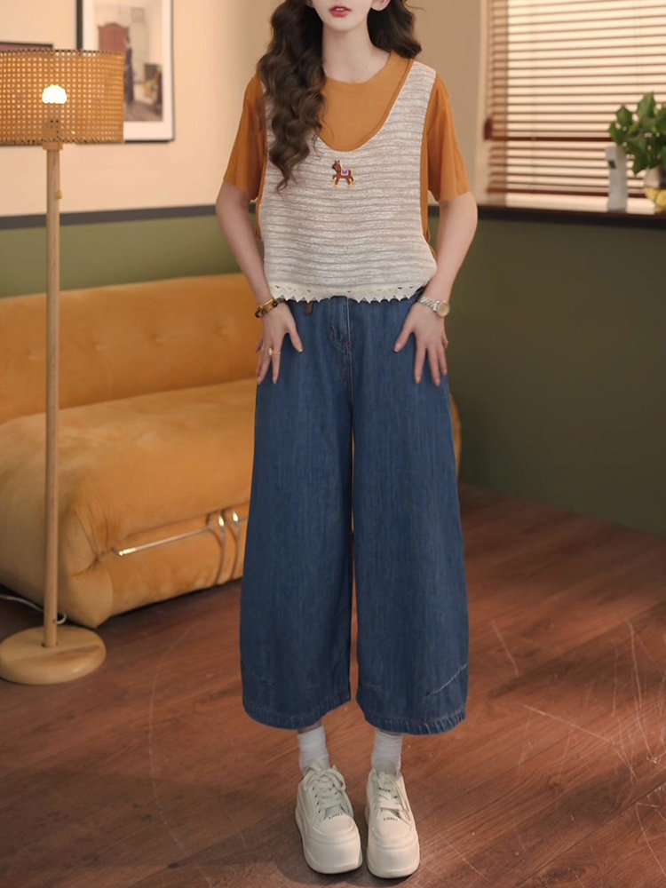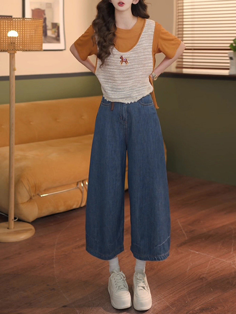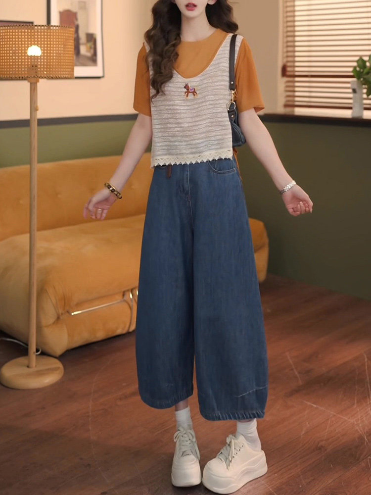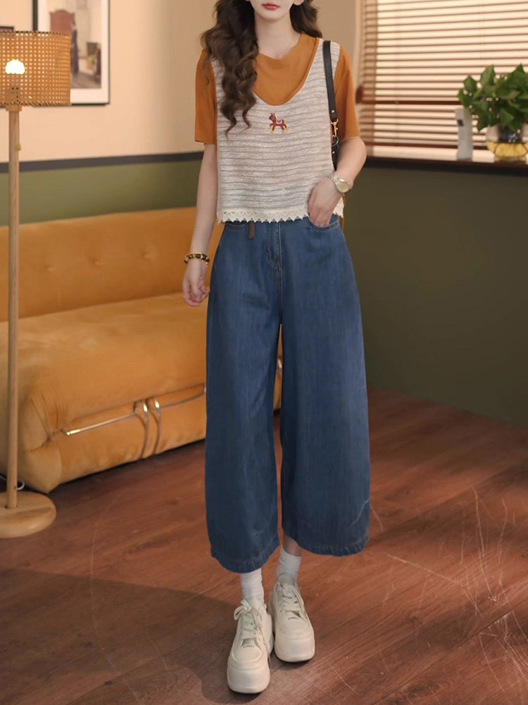 巨好看的夏装一整套2026新款假两件短袖T恤女+牛仔弯刀阔腿裤套装