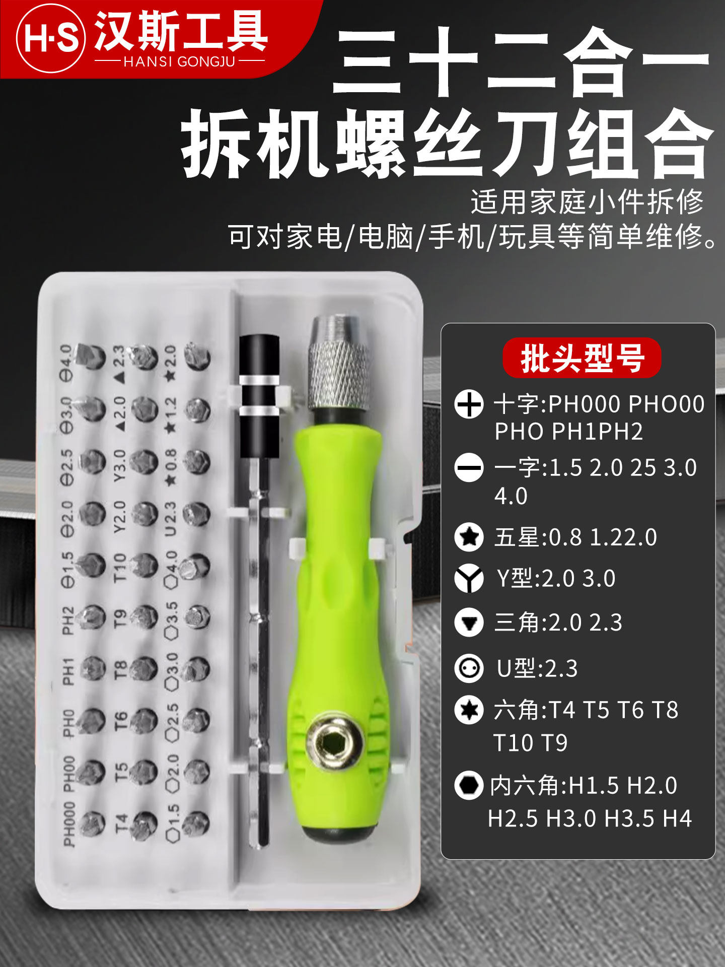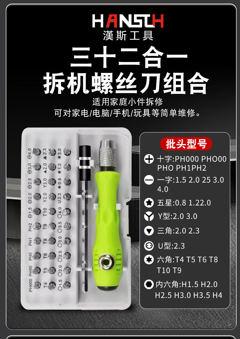 汉斯多功能螺丝刀套装家用万能小工具十字内六角梅花三角Y形套装