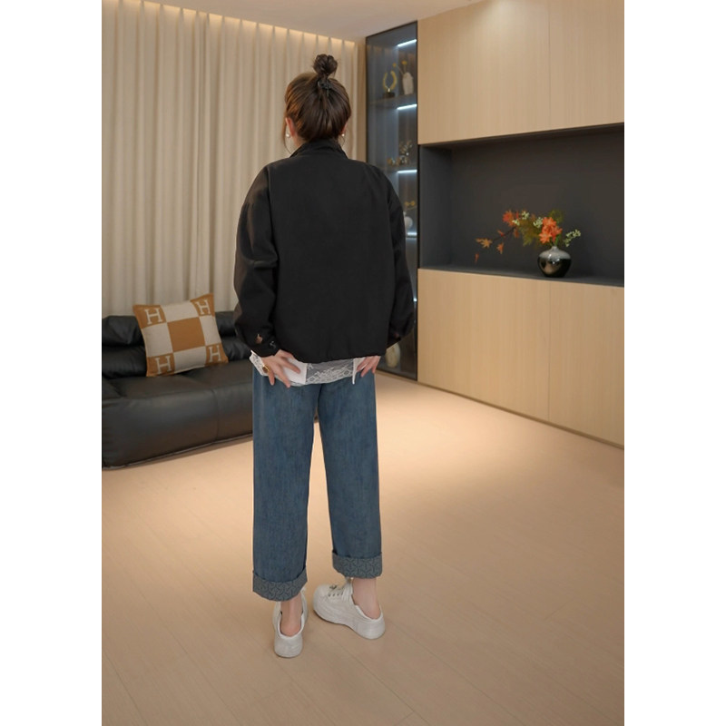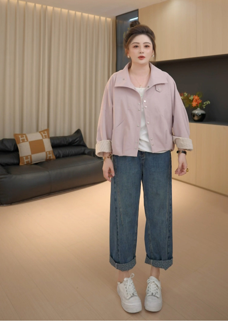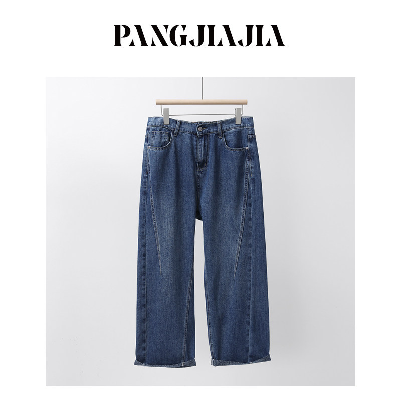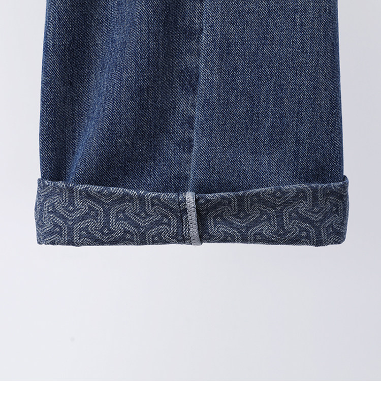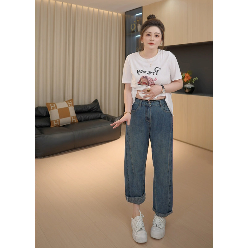 【胖佳佳】提花翻边牛仔裤 秋季高腰时尚宽松显瘦长裤H625Z13293