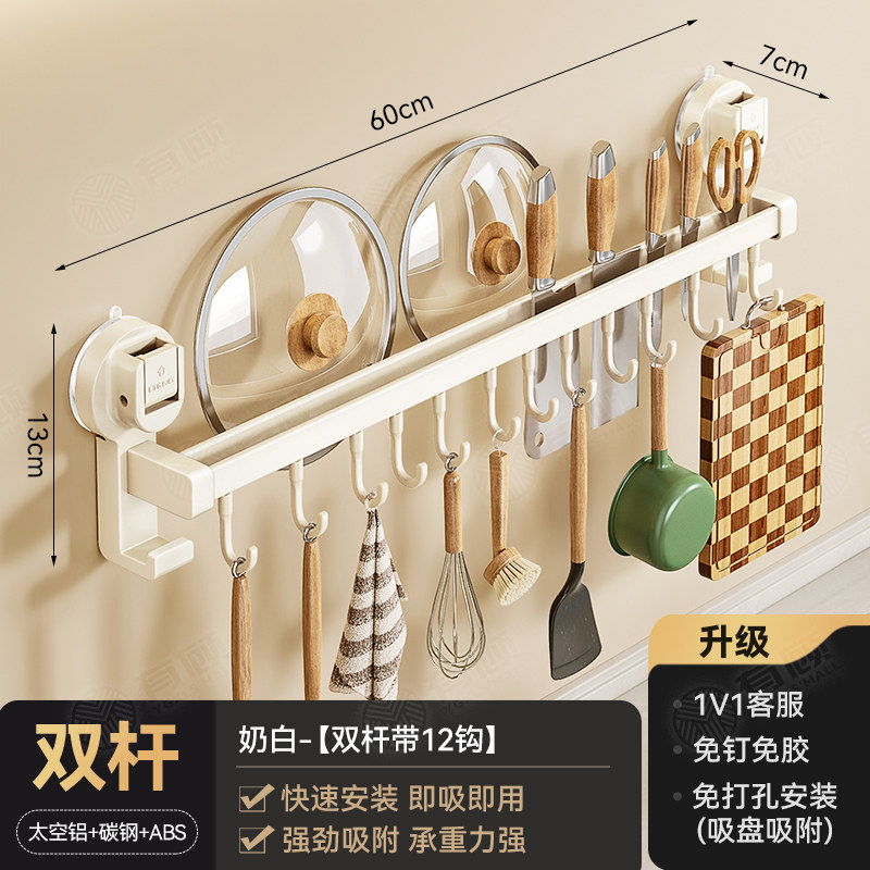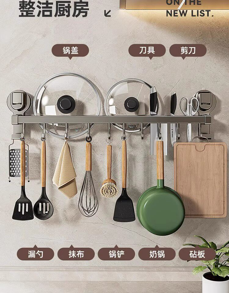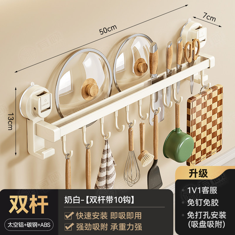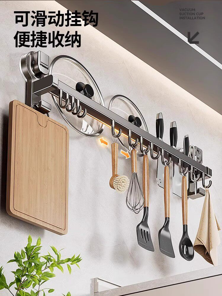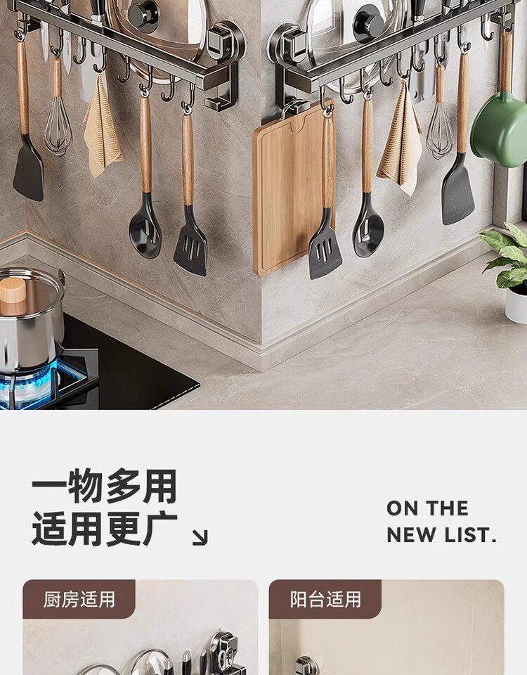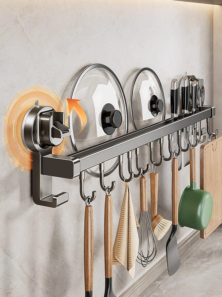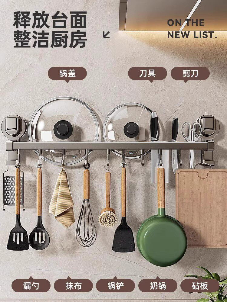 德国吸盘厨房挂钩免打孔多功能挂杆锅铲勺子刀具一体壁挂式收纳架