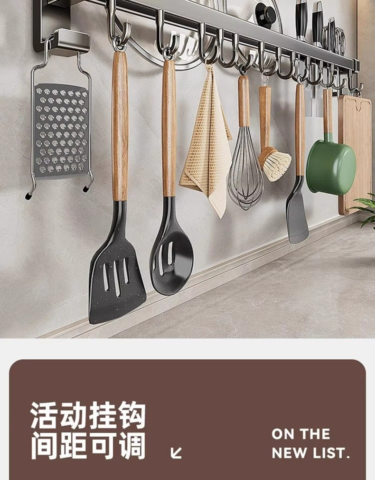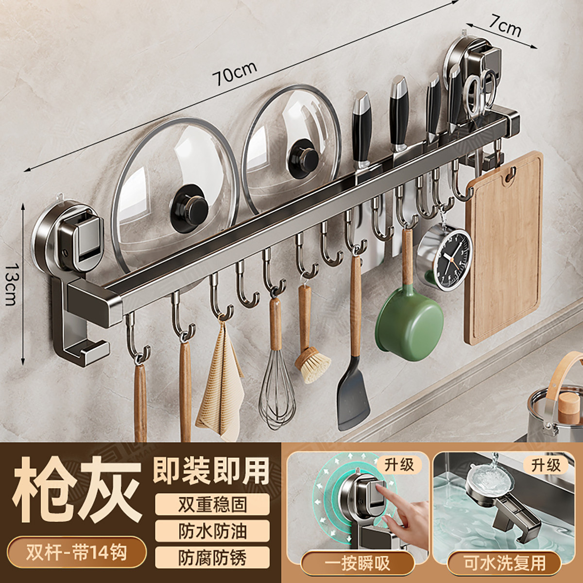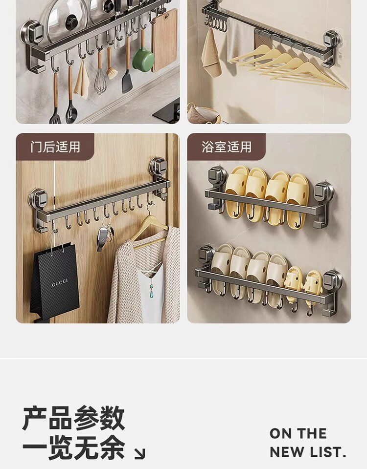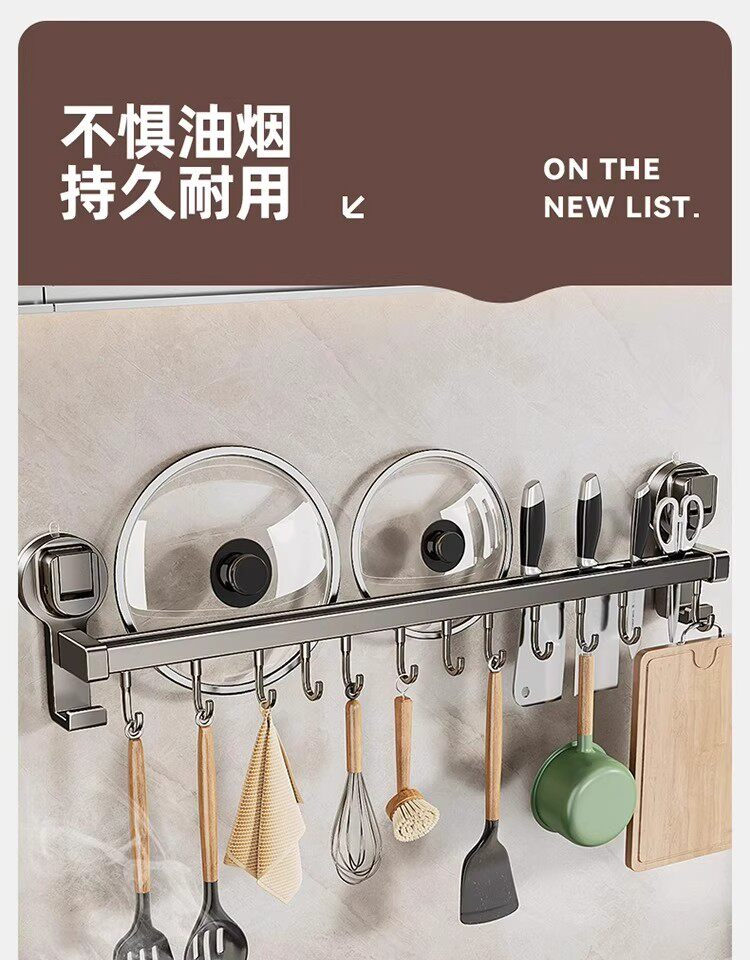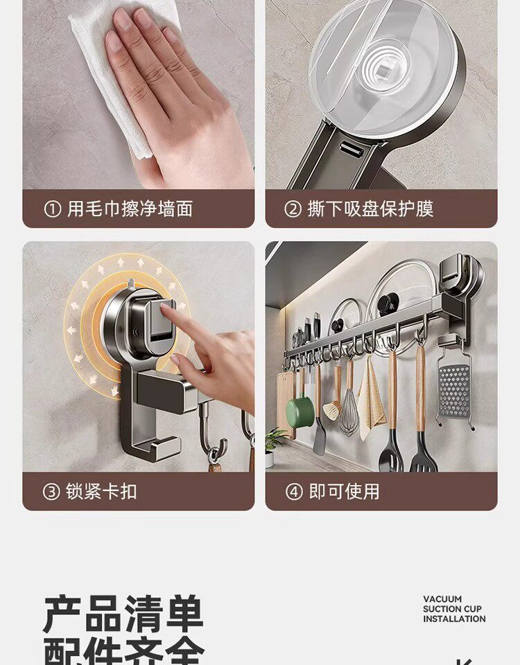 德国吸盘厨房挂钩免打孔多功能挂杆锅铲勺子刀具一体壁挂式收纳架