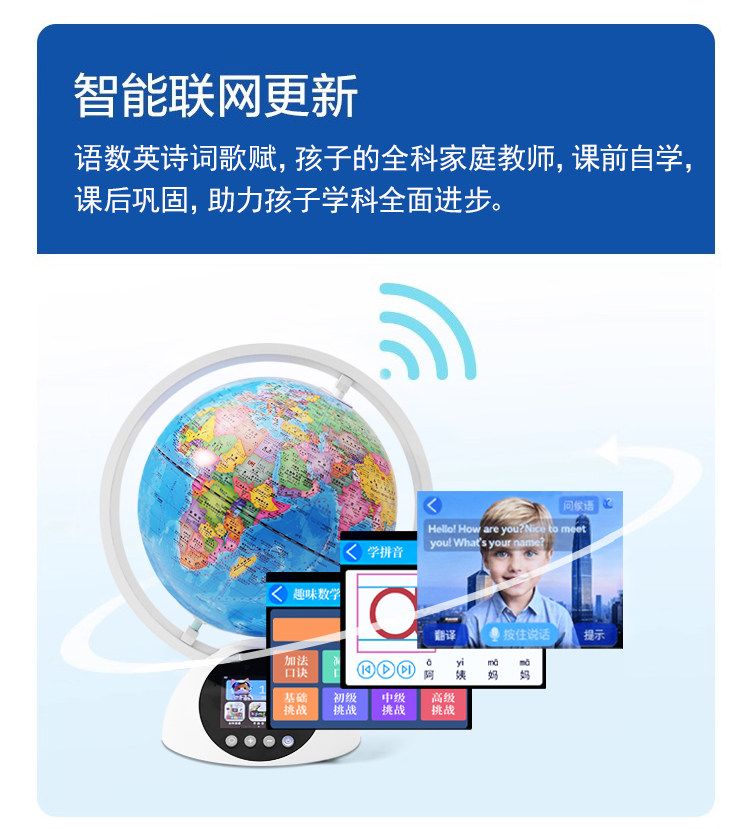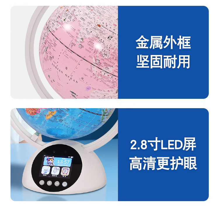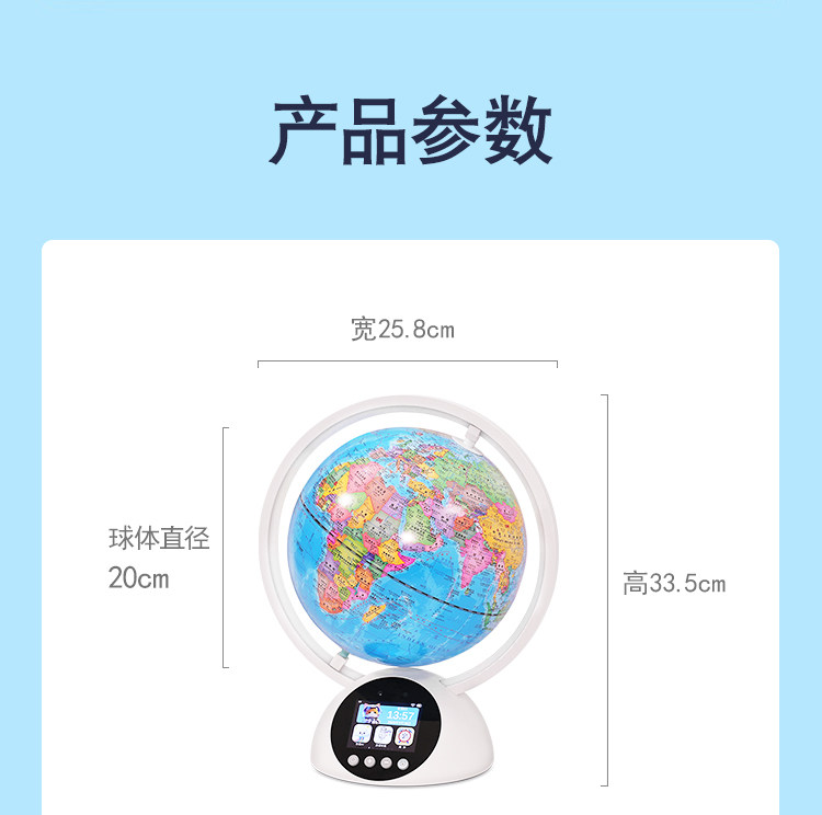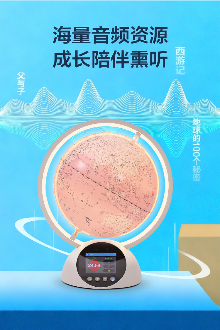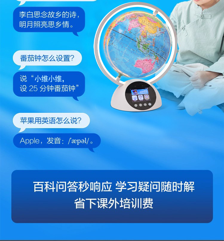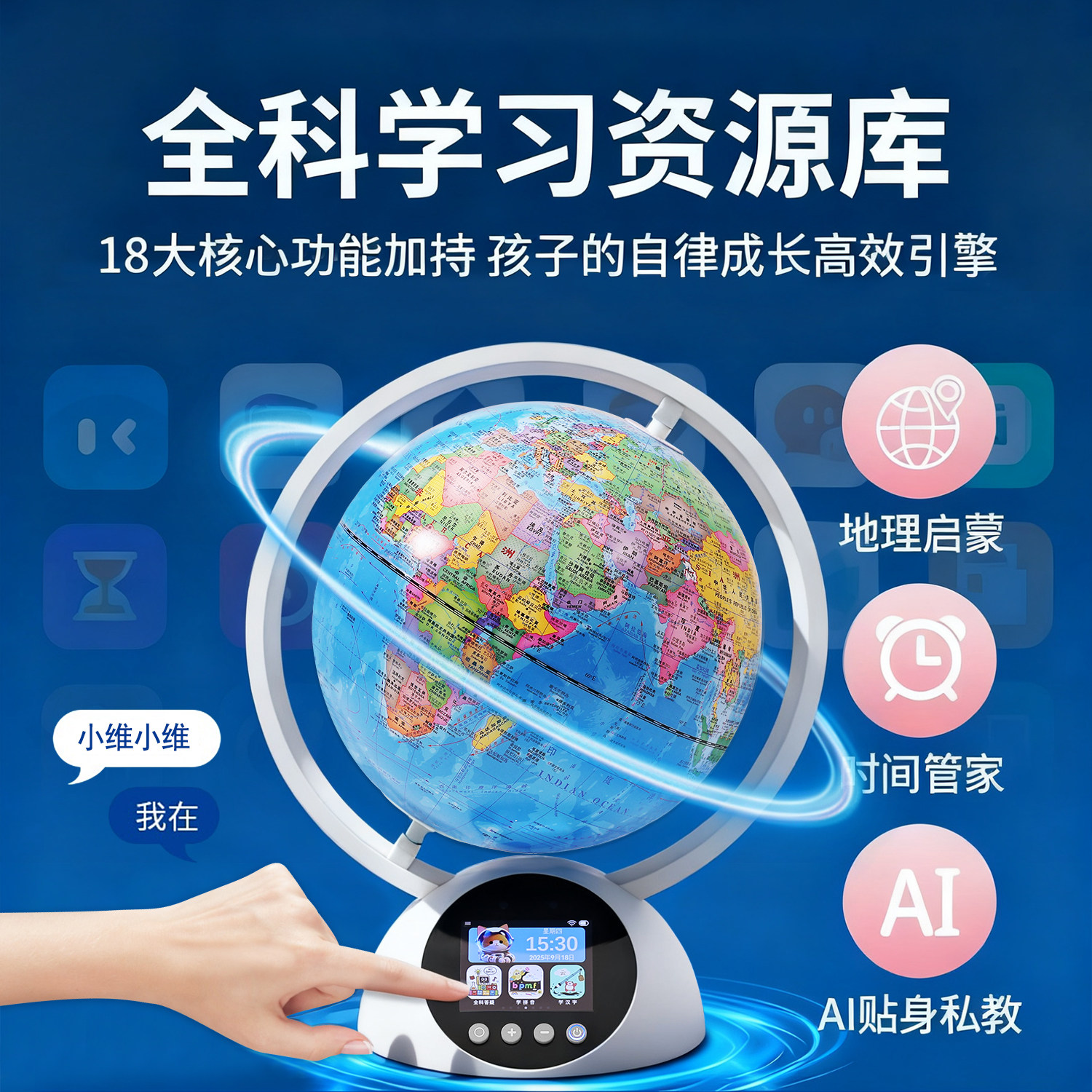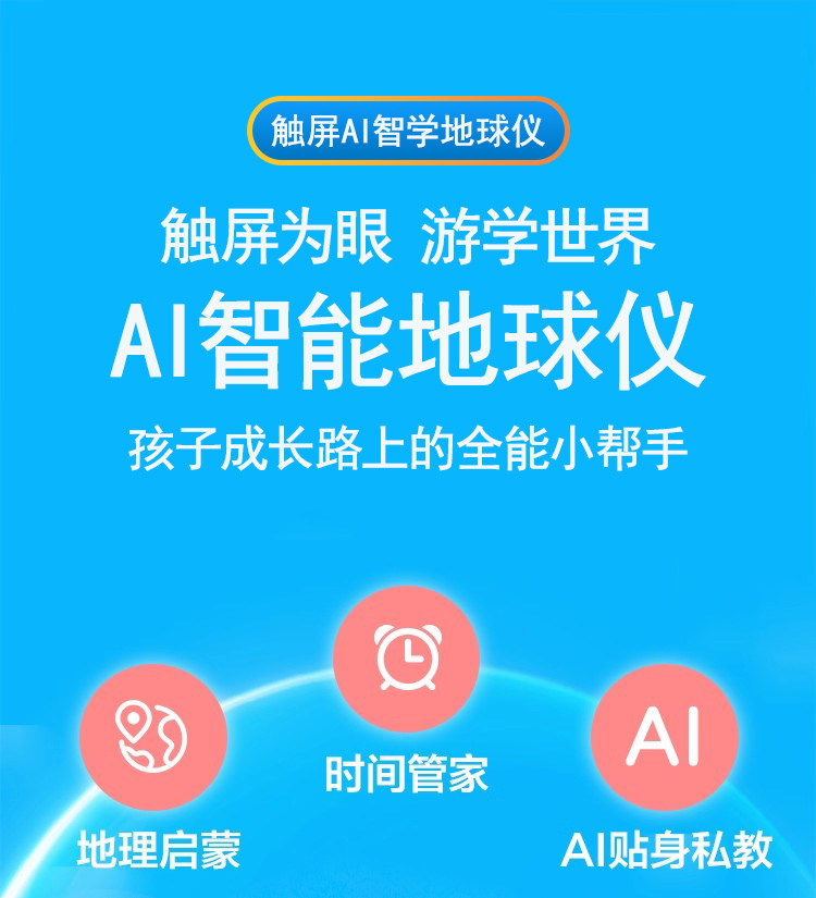 功能介绍:AI智能触屏地球仪(AI全科学习资源+语数英+闹钟天气+微聊+小夜灯)