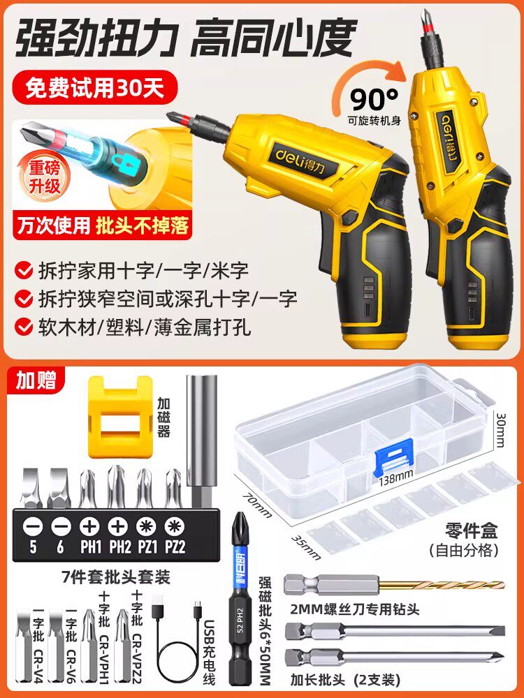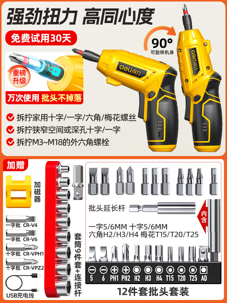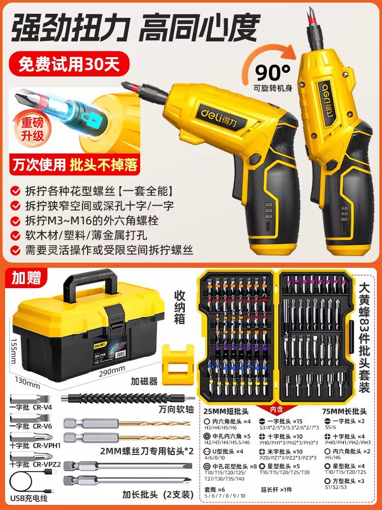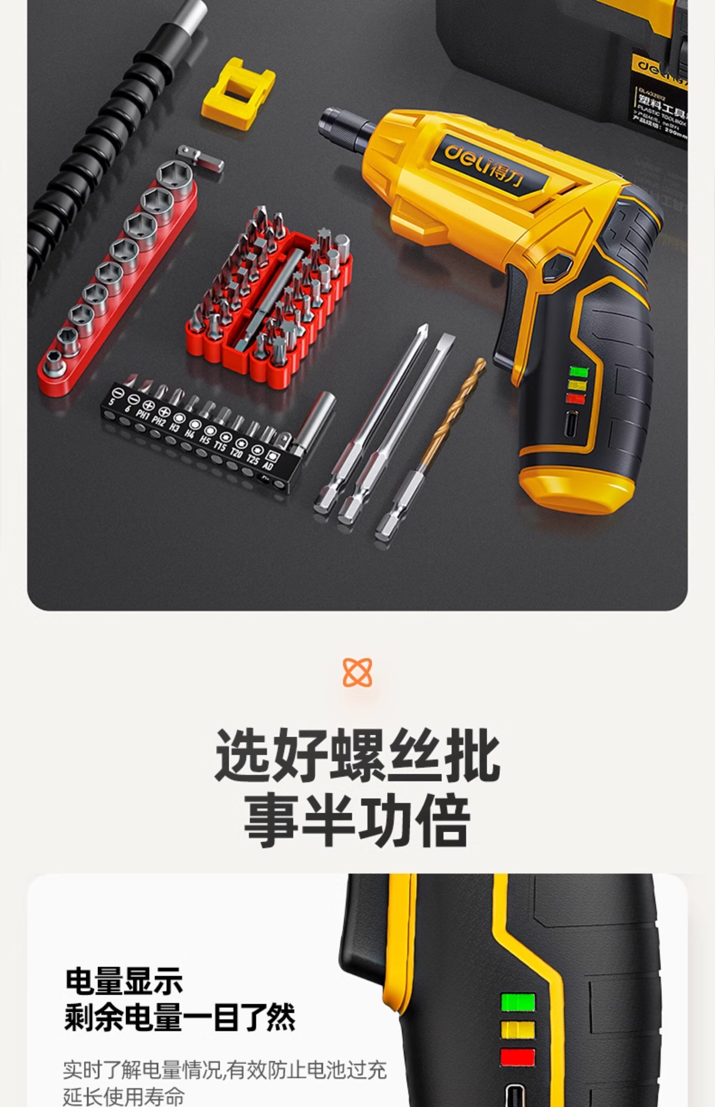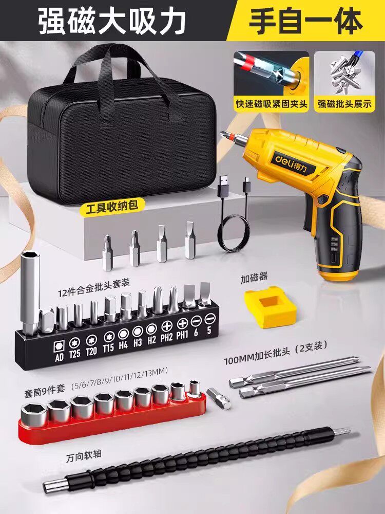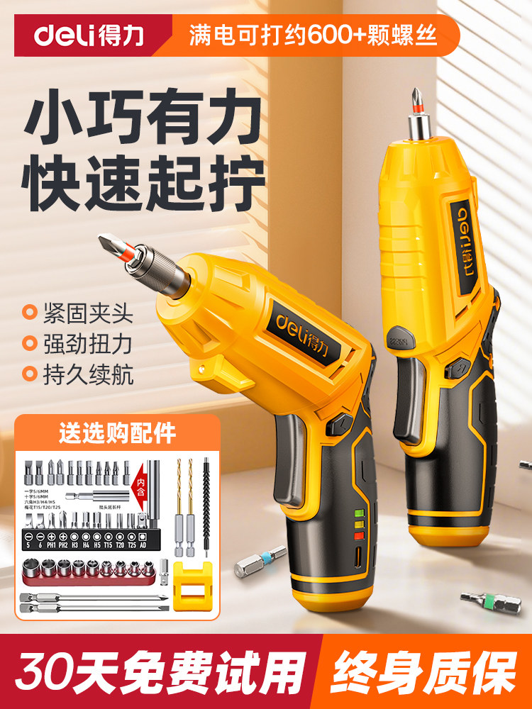 得力电动螺丝刀充电式家用小型起子机多功能电批锂电电钻工具套装