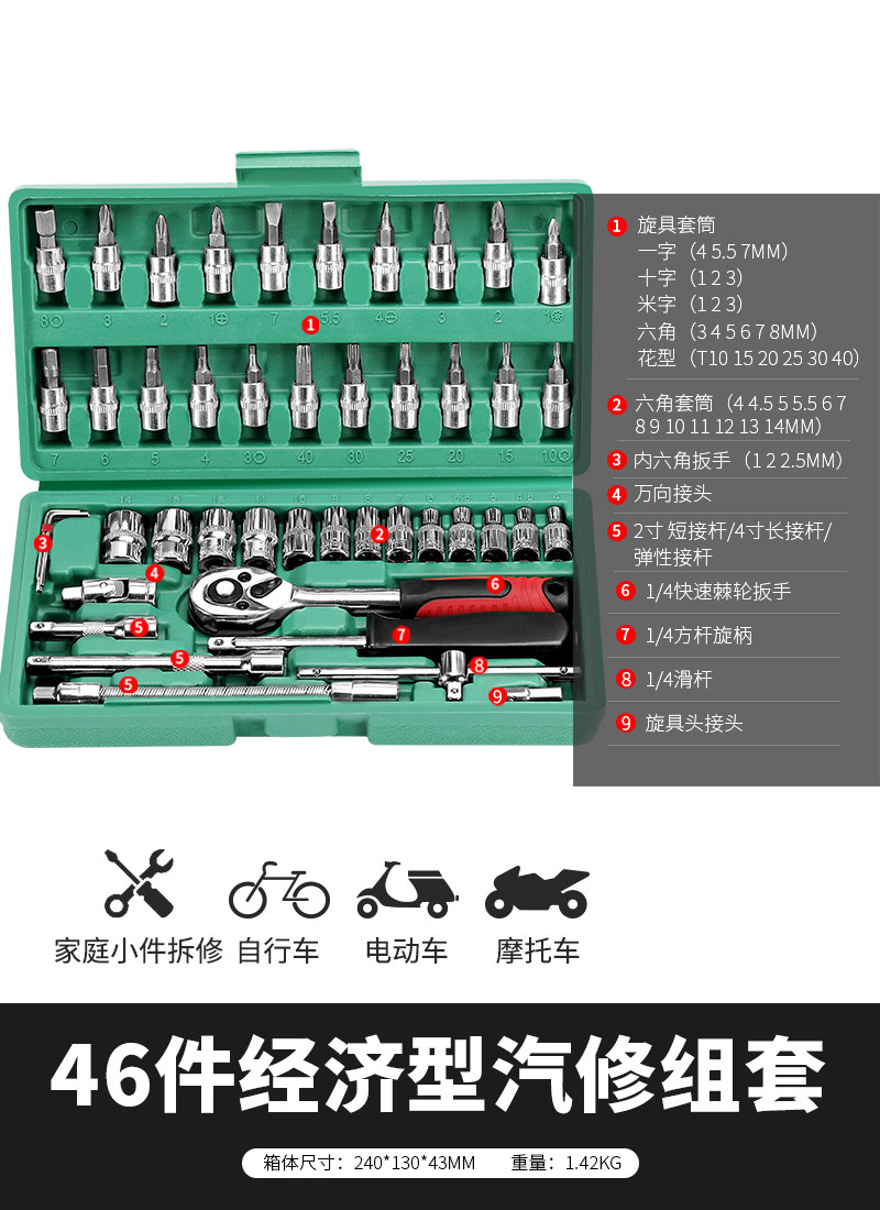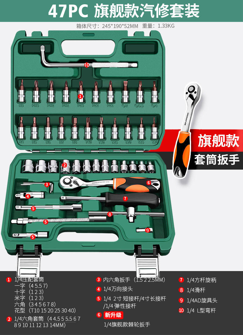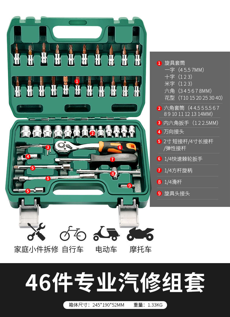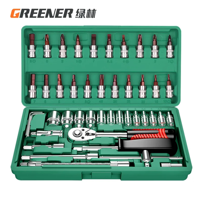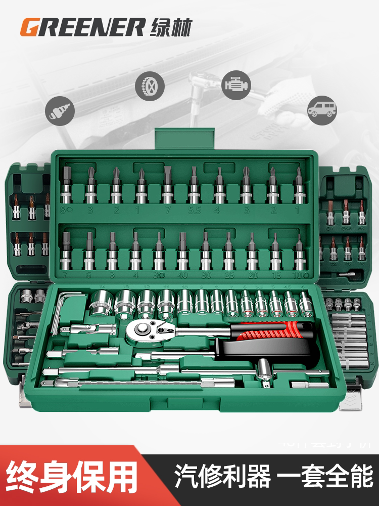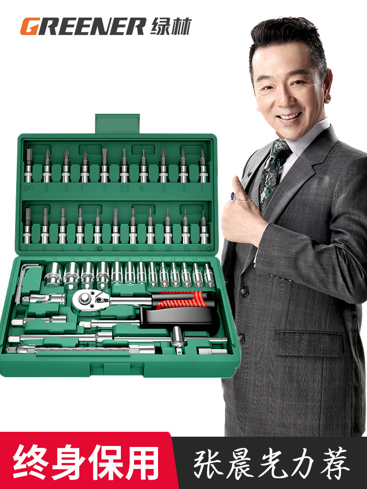 绿林46件套装内六角套筒工具组合小飞快速棘轮扳手套装家用工具箱