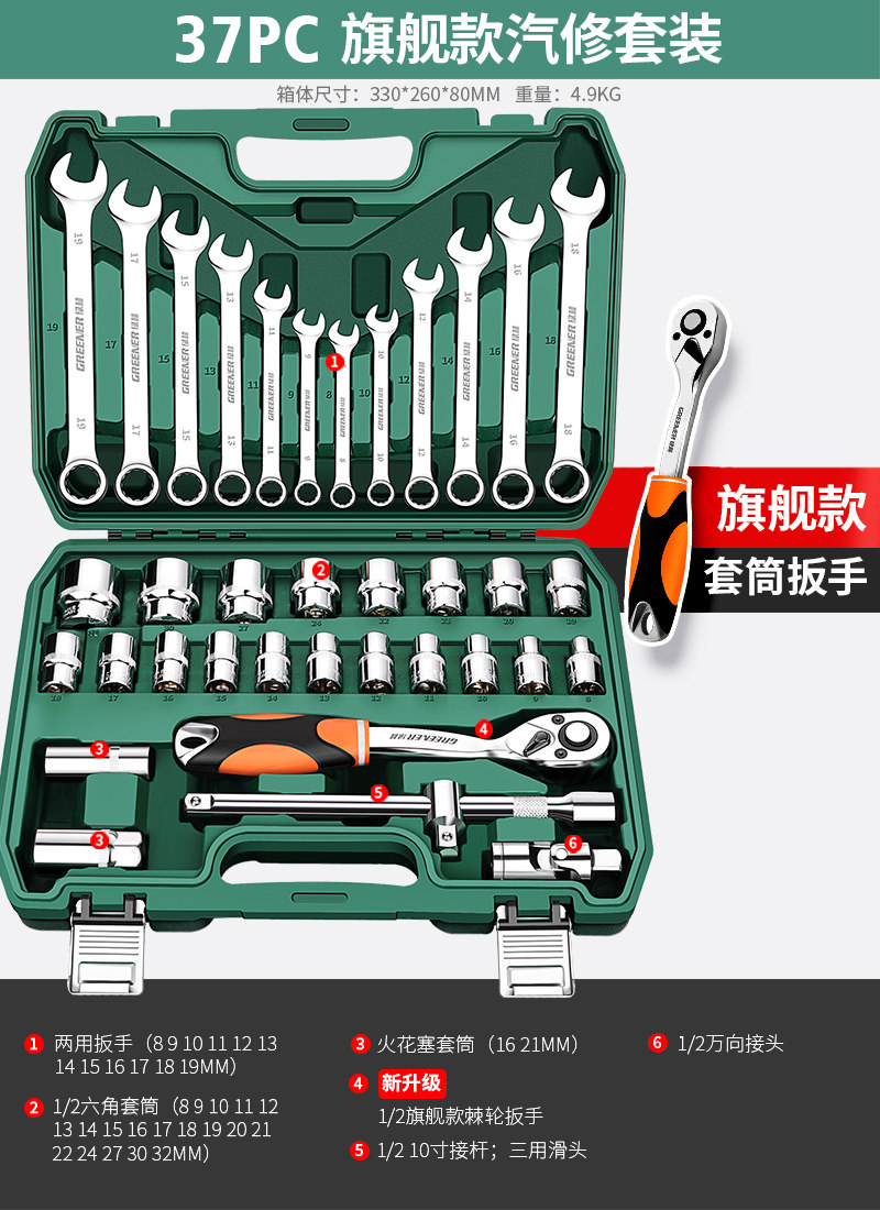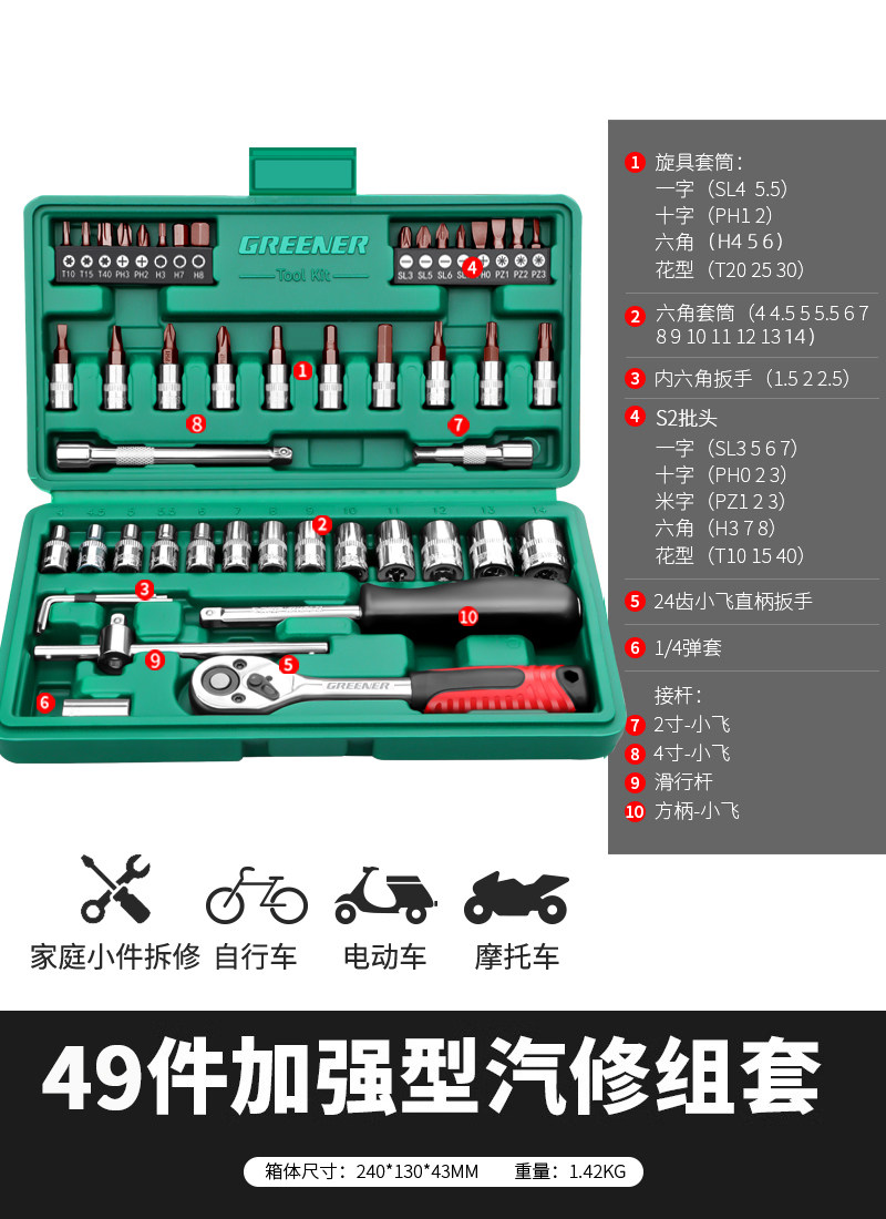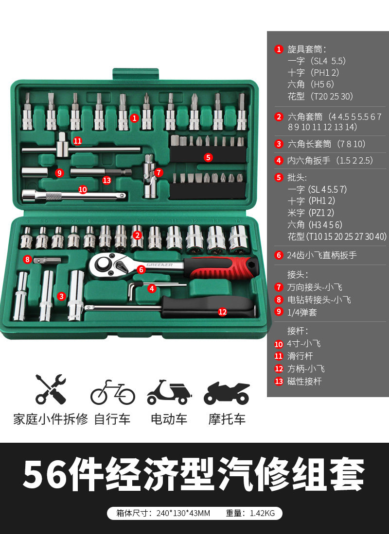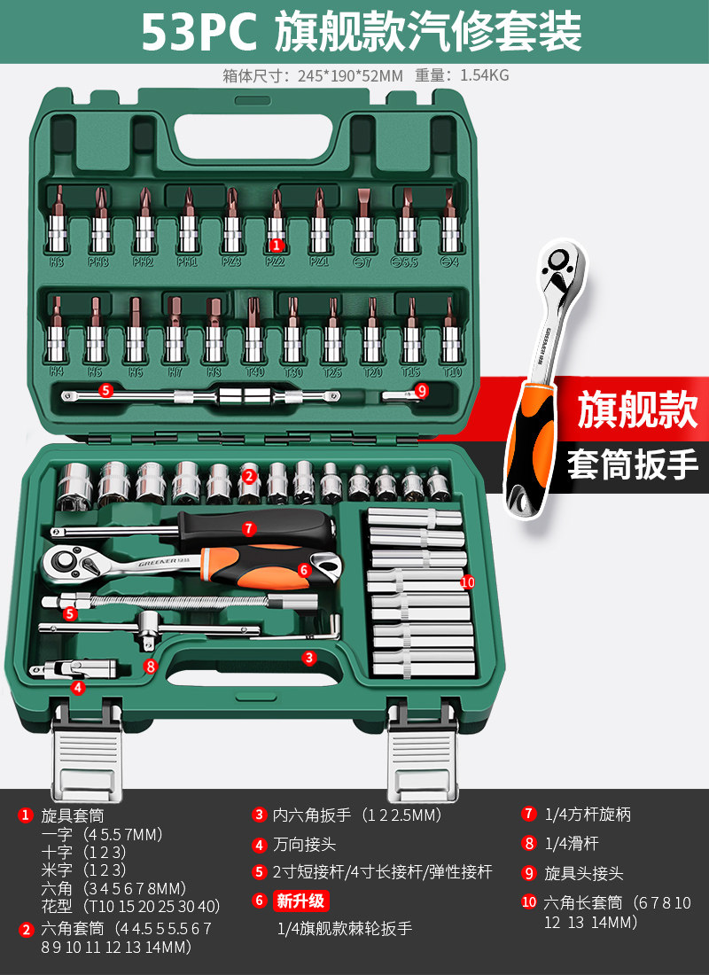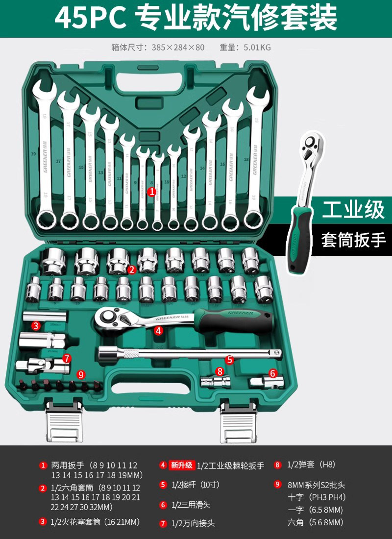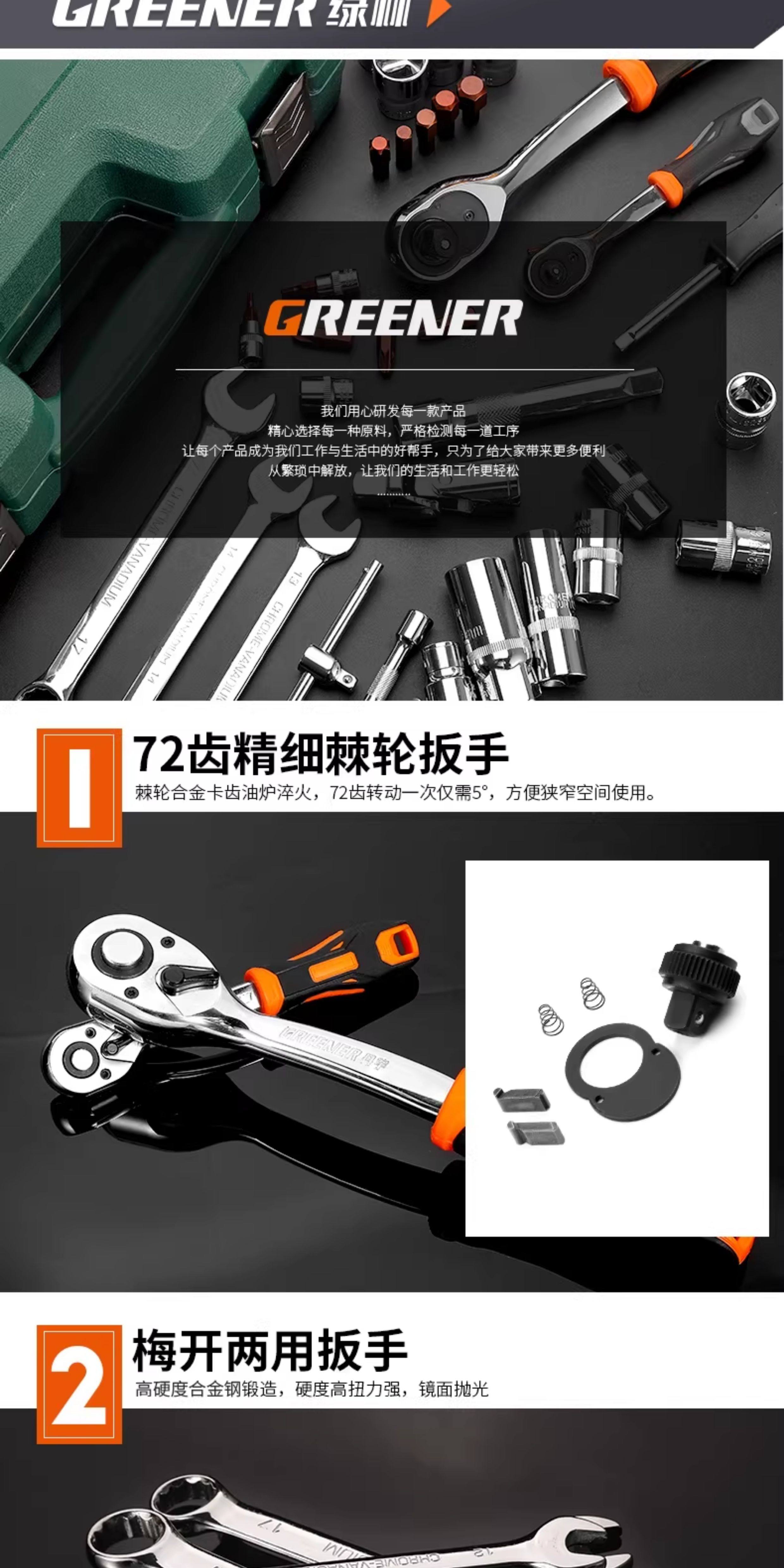 绿林46件套装内六角套筒工具组合小飞快速棘轮扳手套装家用工具箱