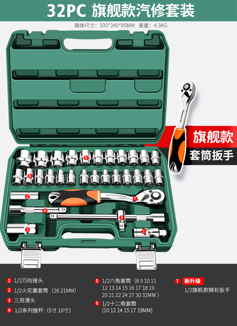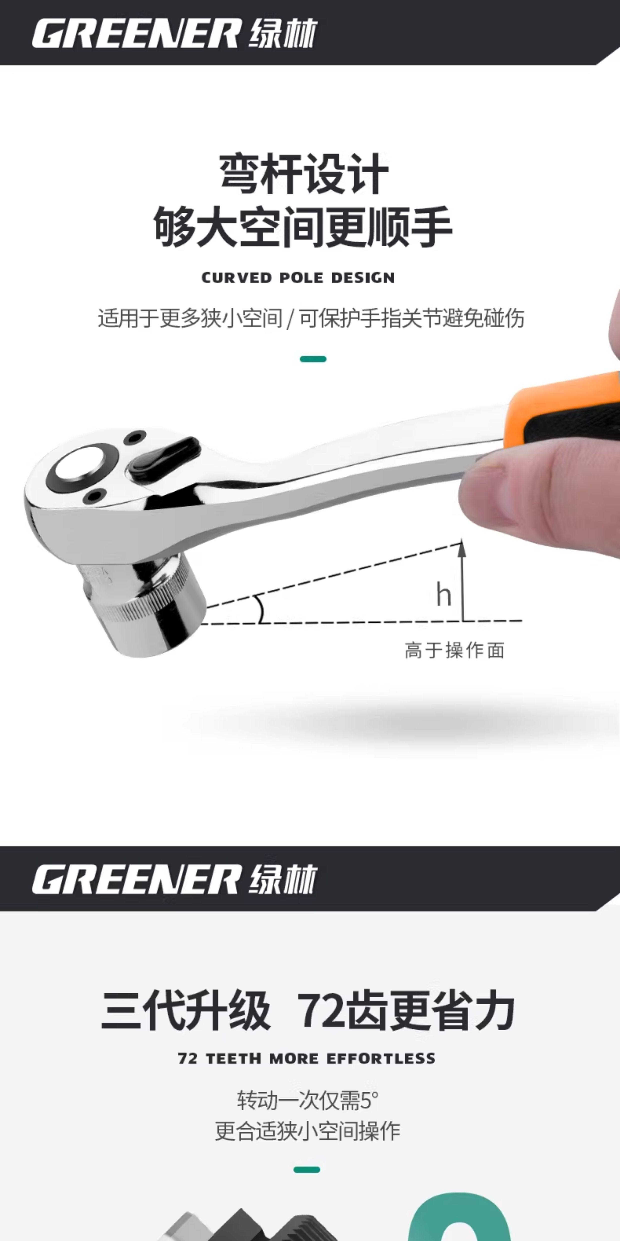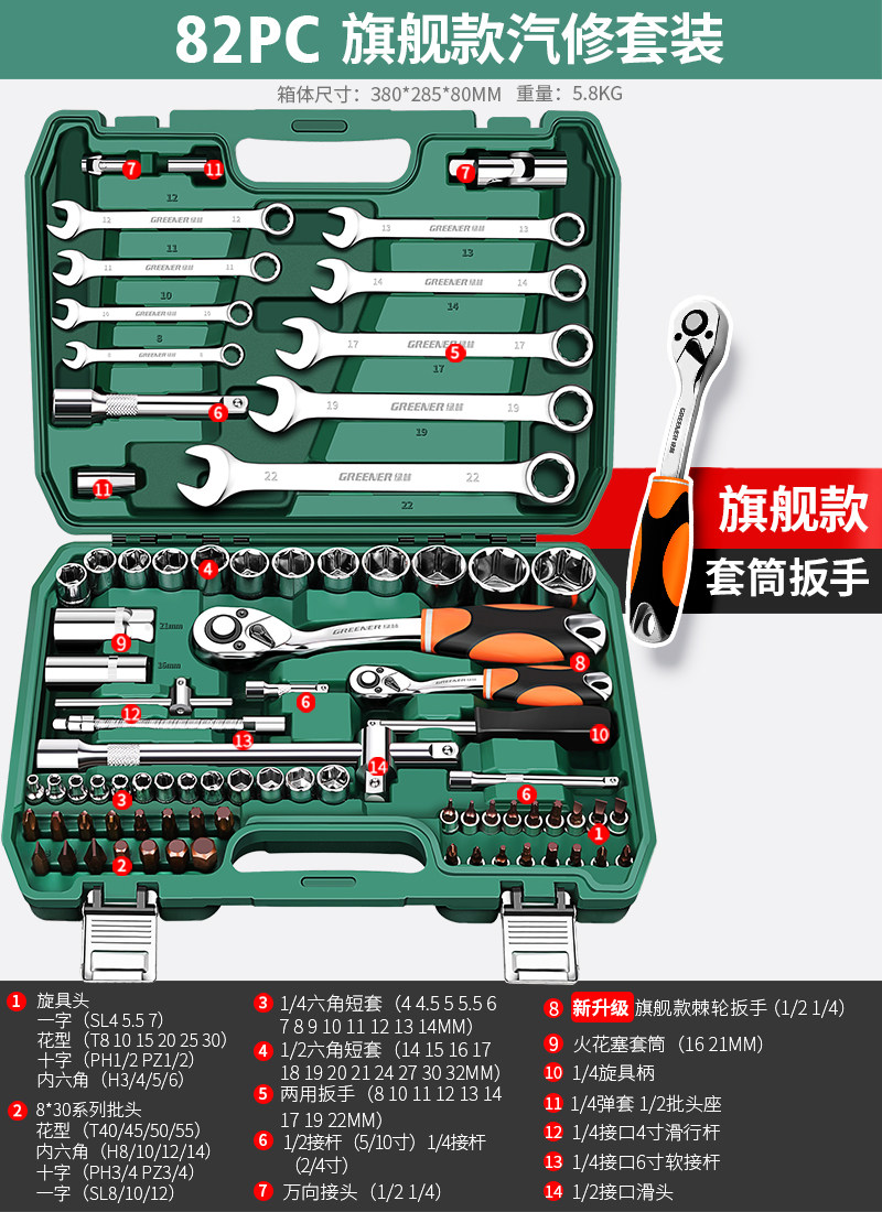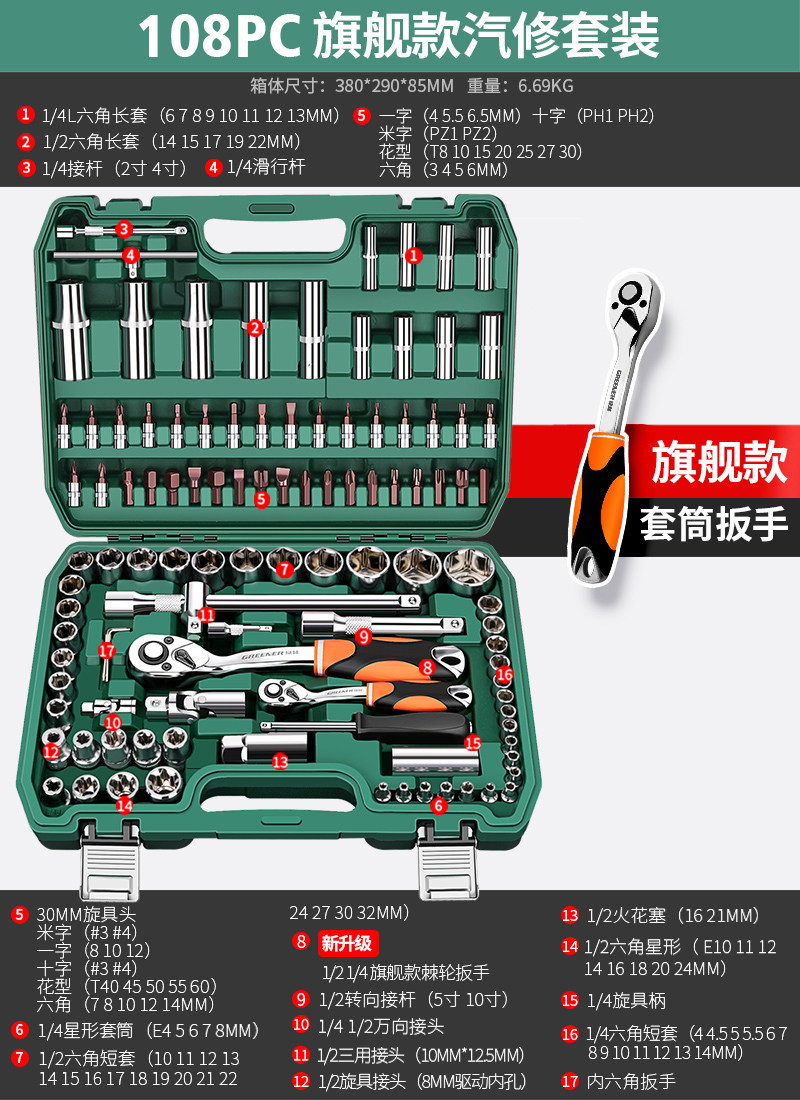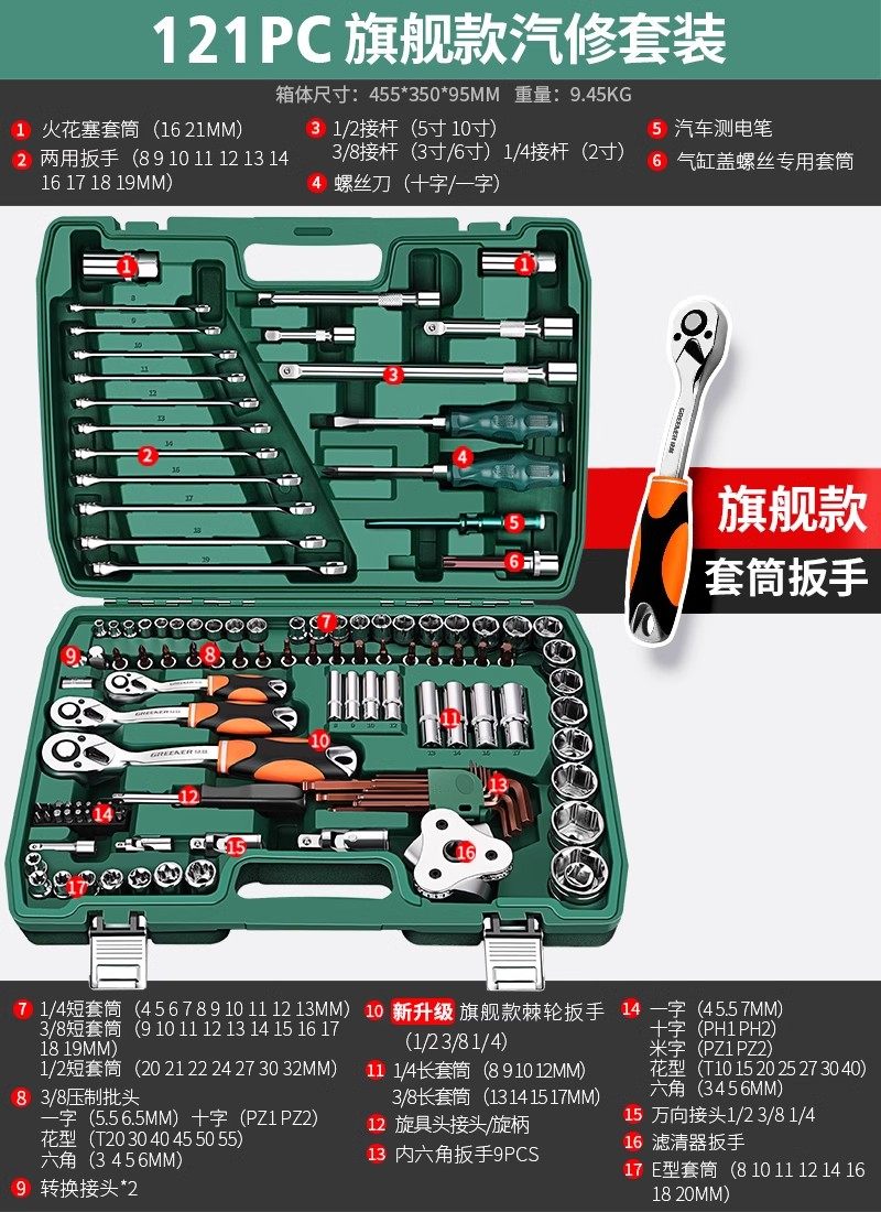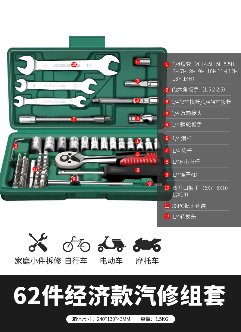 绿林46件套装内六角套筒工具组合小飞快速棘轮扳手套装家用工具箱