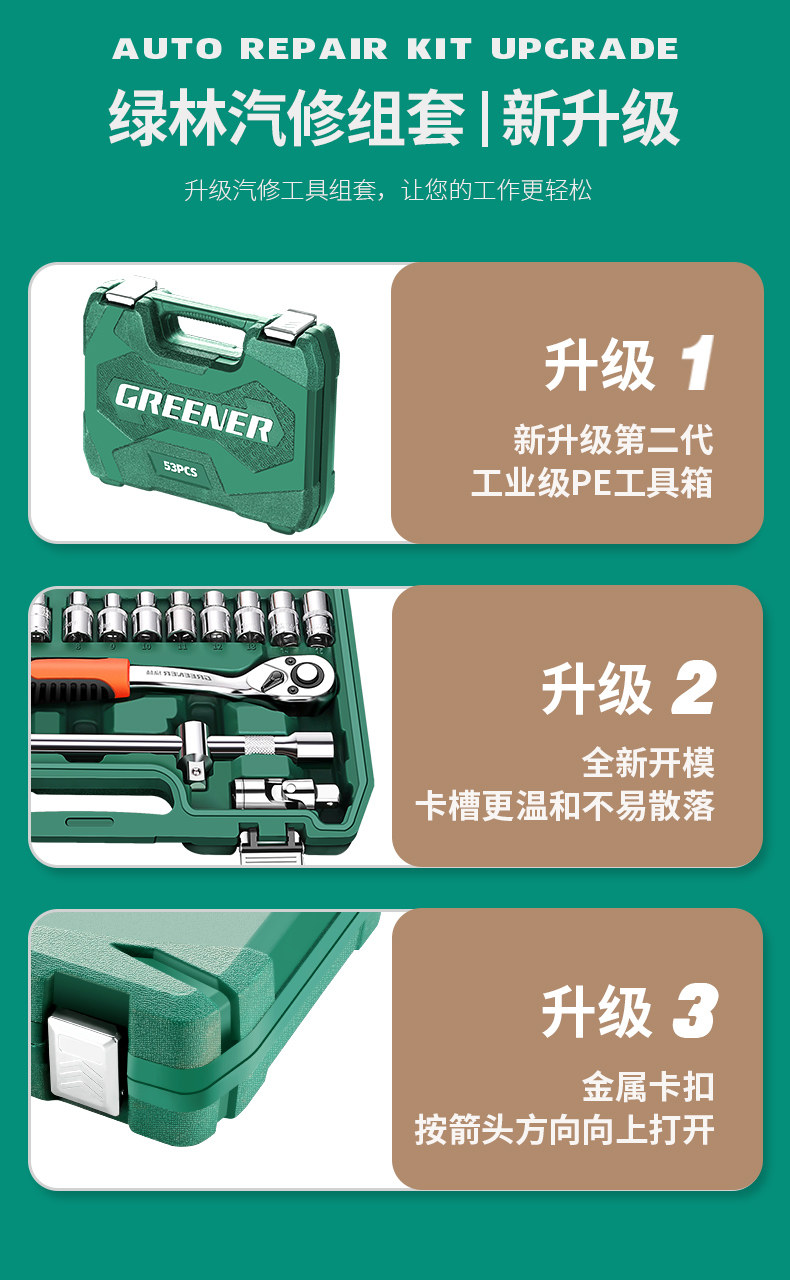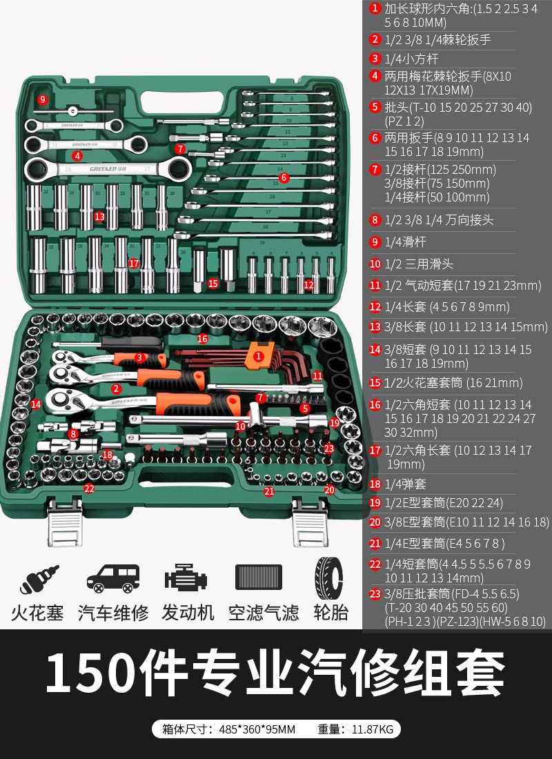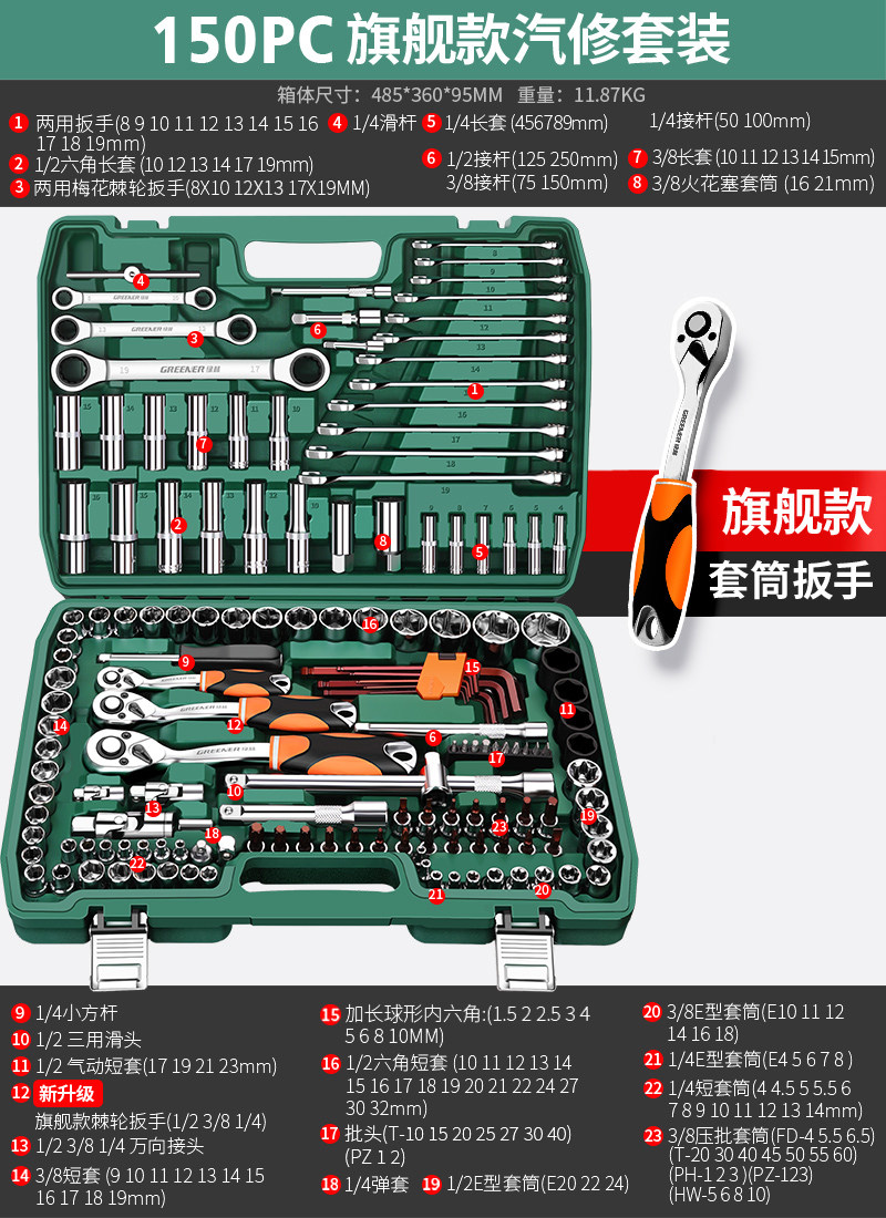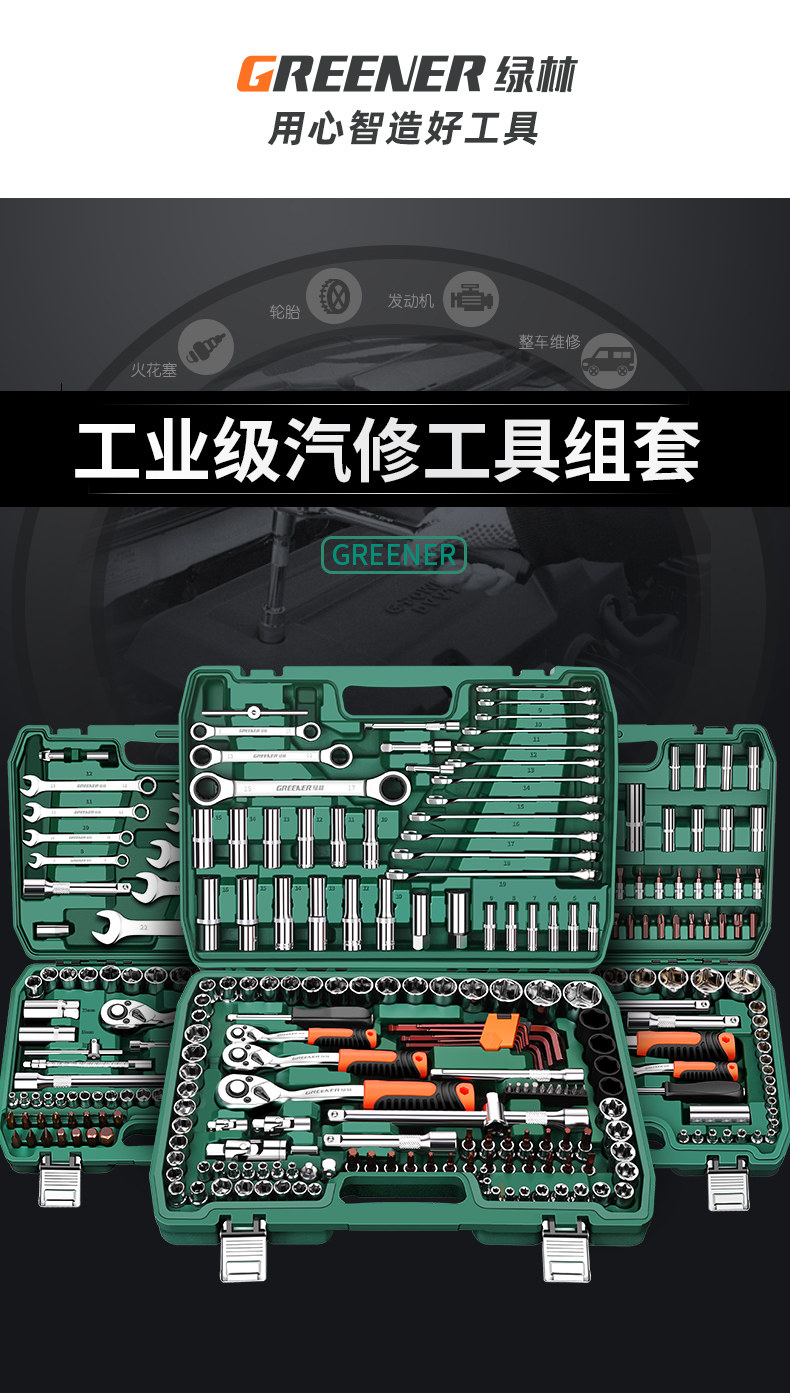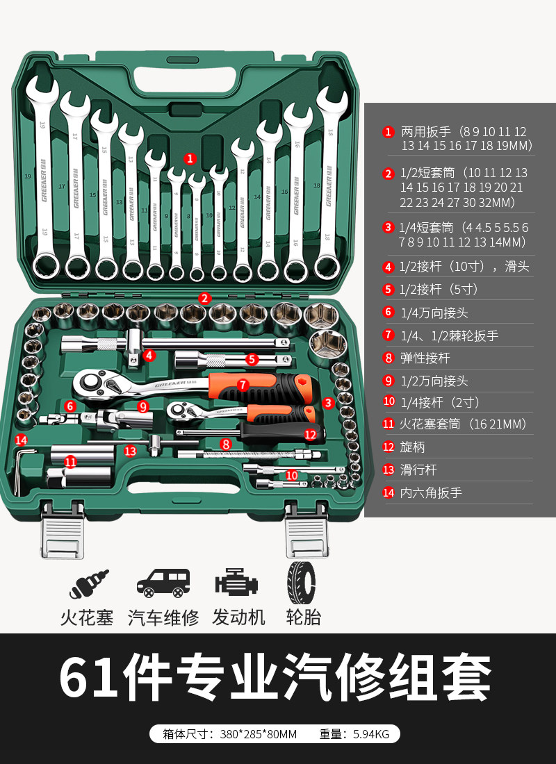 绿林46件套装内六角套筒工具组合小飞快速棘轮扳手套装家用工具箱